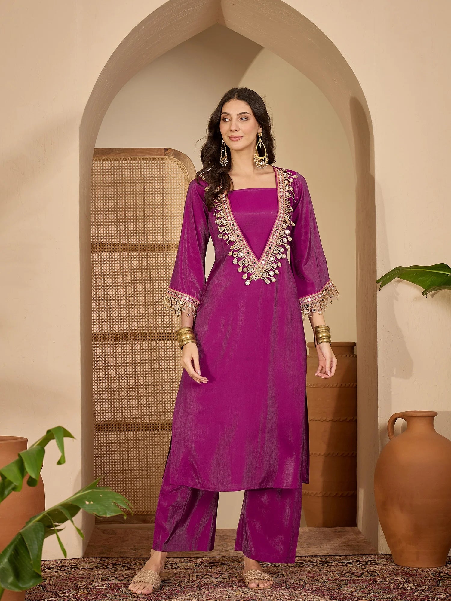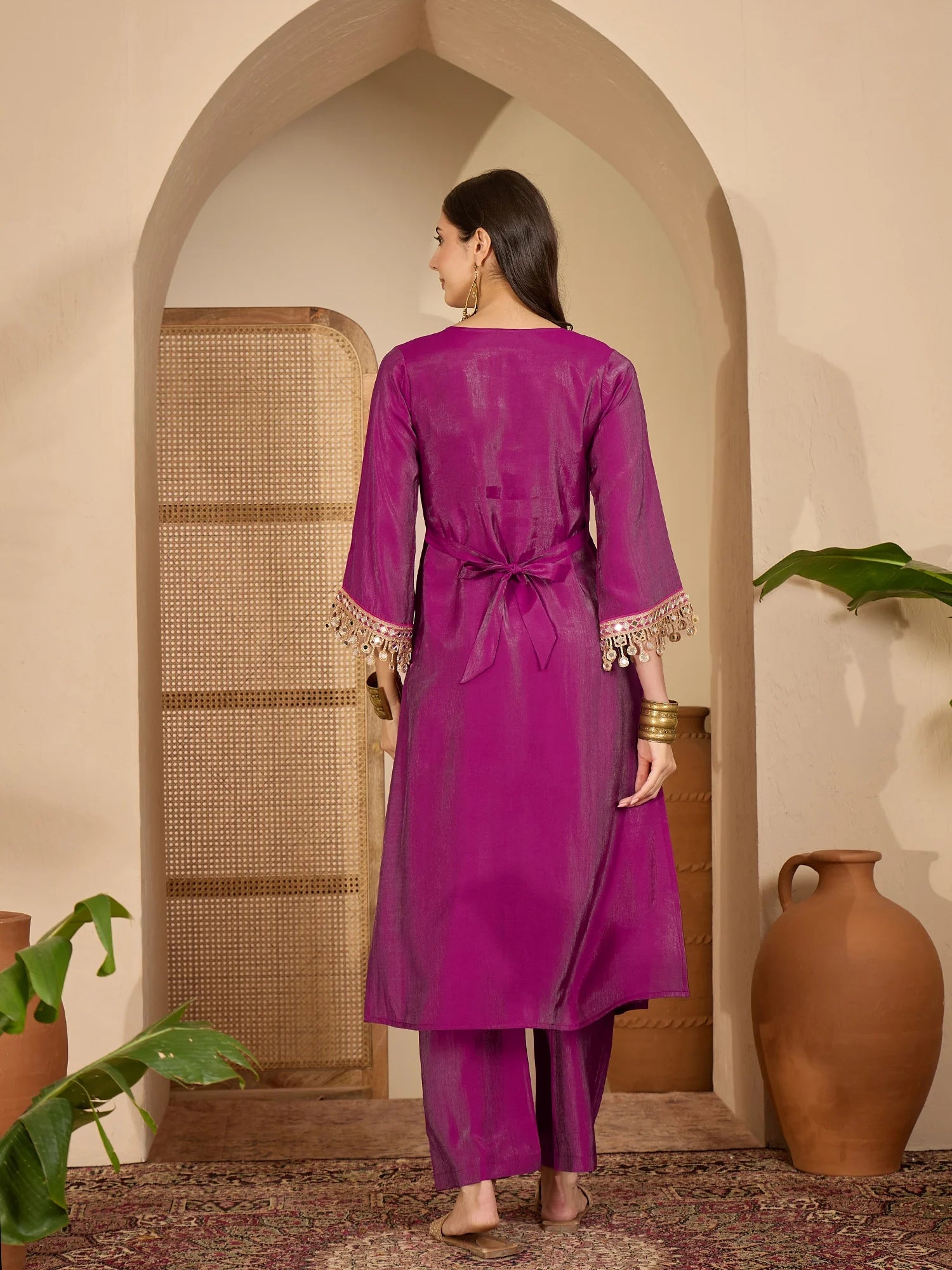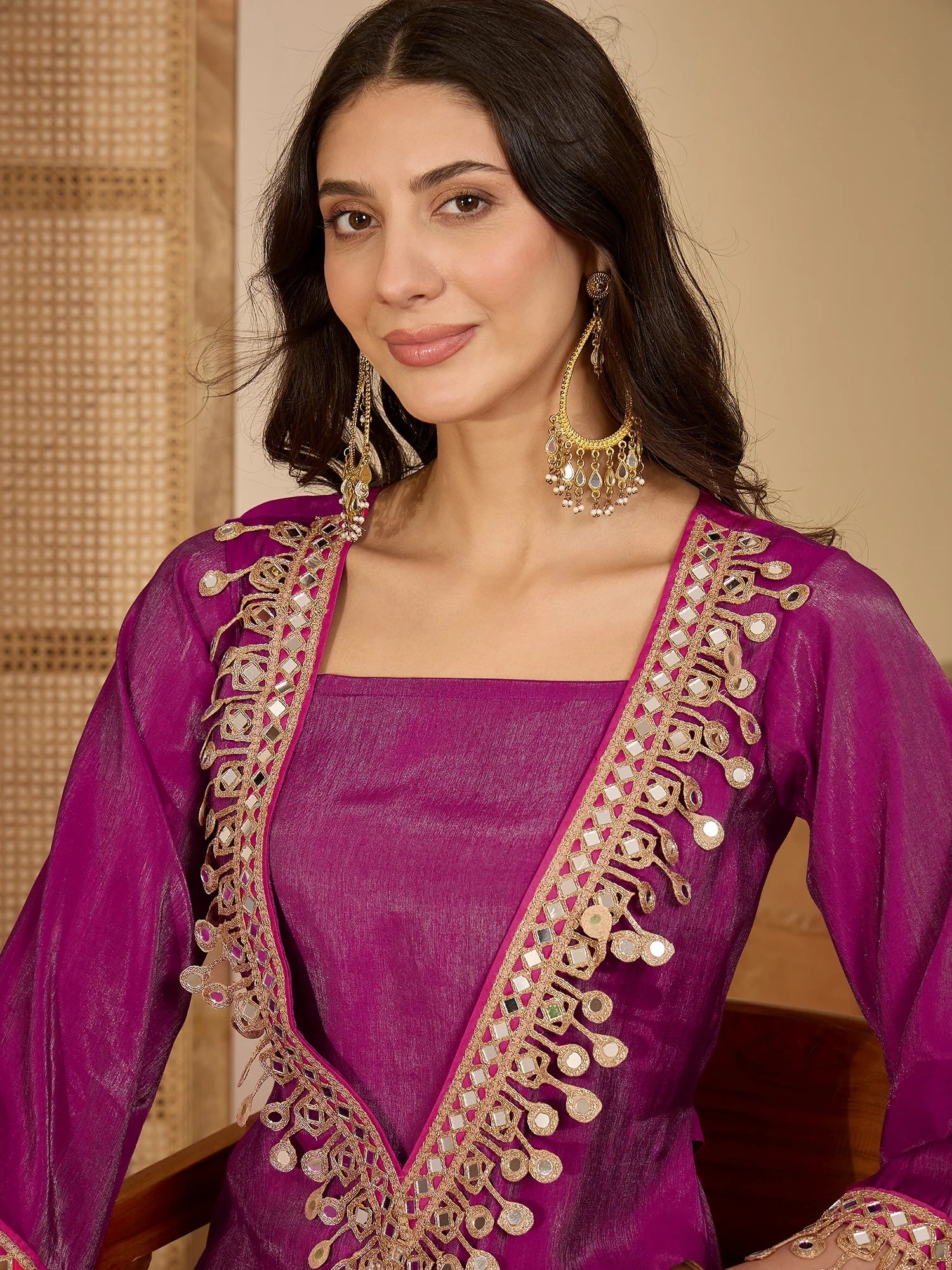 Purple Blue Silk Blend Embroidered & Mirror Work fusion Kurta Palazzo Set