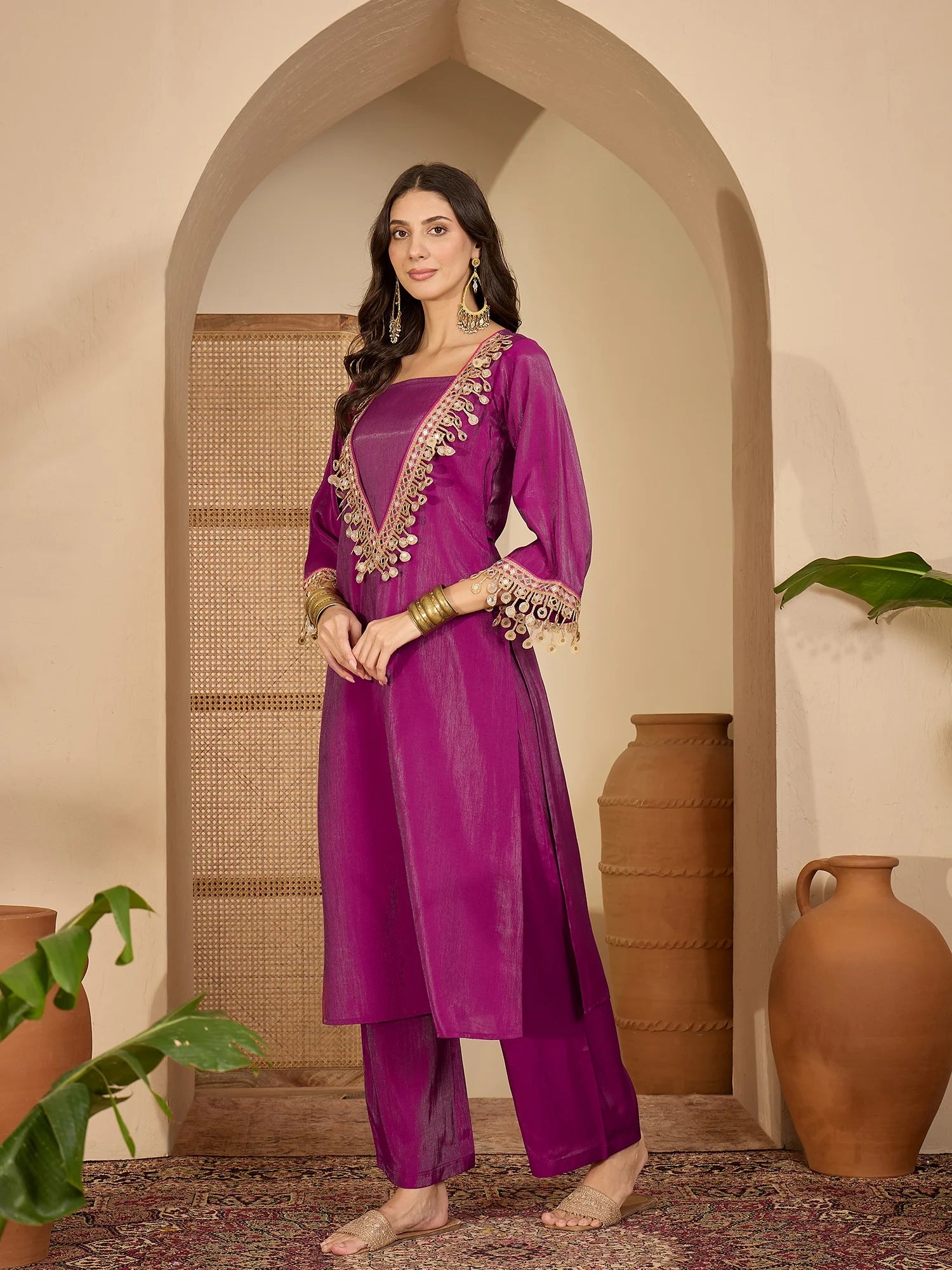 Step into elegance with the Silk Blend Embroidered Kurta Palazzo Set, a perfect blend of sophistication and style. This fully stitched ready-to-wear ensemble features a gracefully Straight Kurta with a fancy V- Neck Embroidered design, Bell Sleeves. Paired with a beautifully statement jewellery and a pair of juttis, this outfit is ideal for weddings, festive occasions, and cultural gatherings.