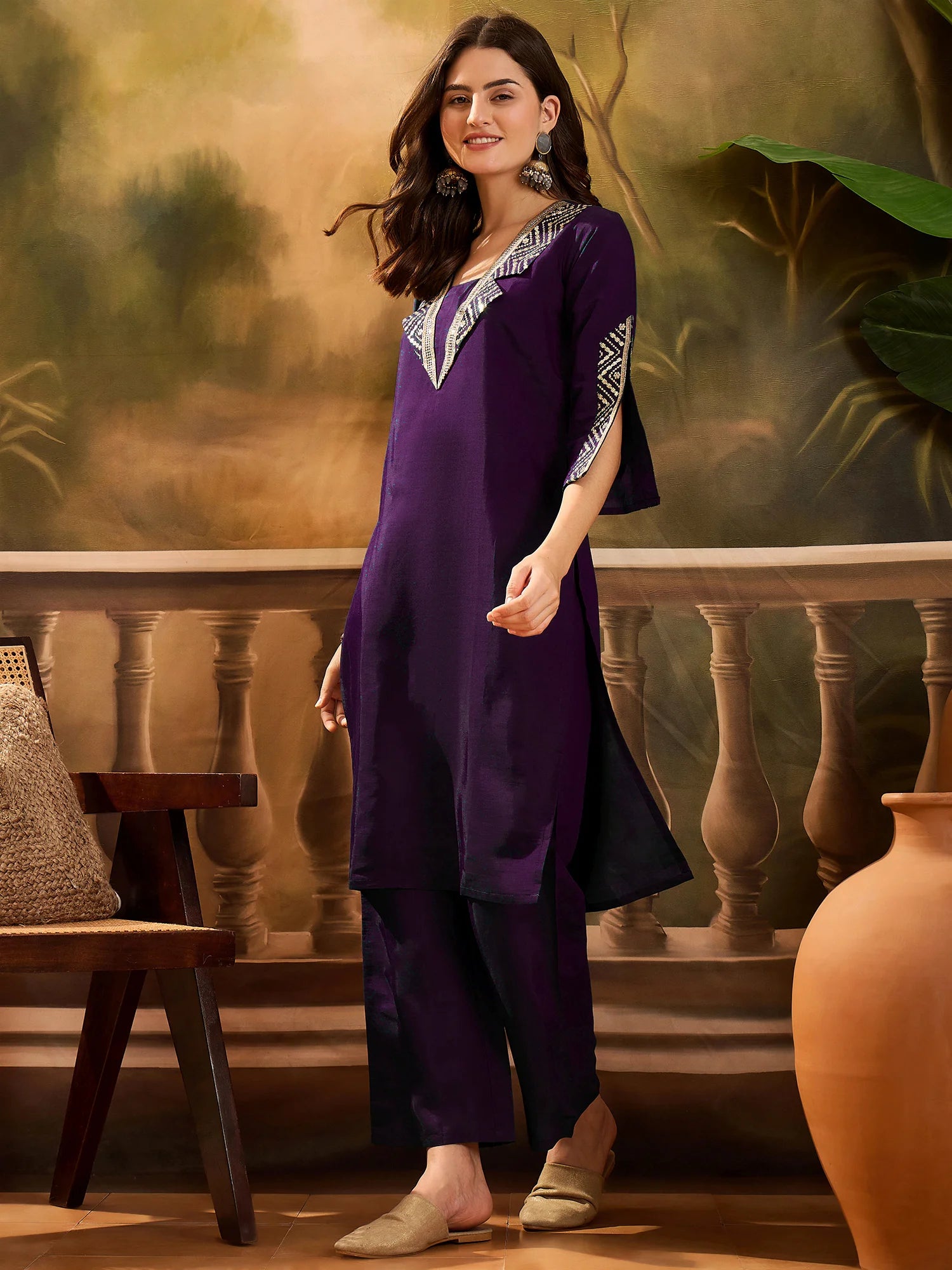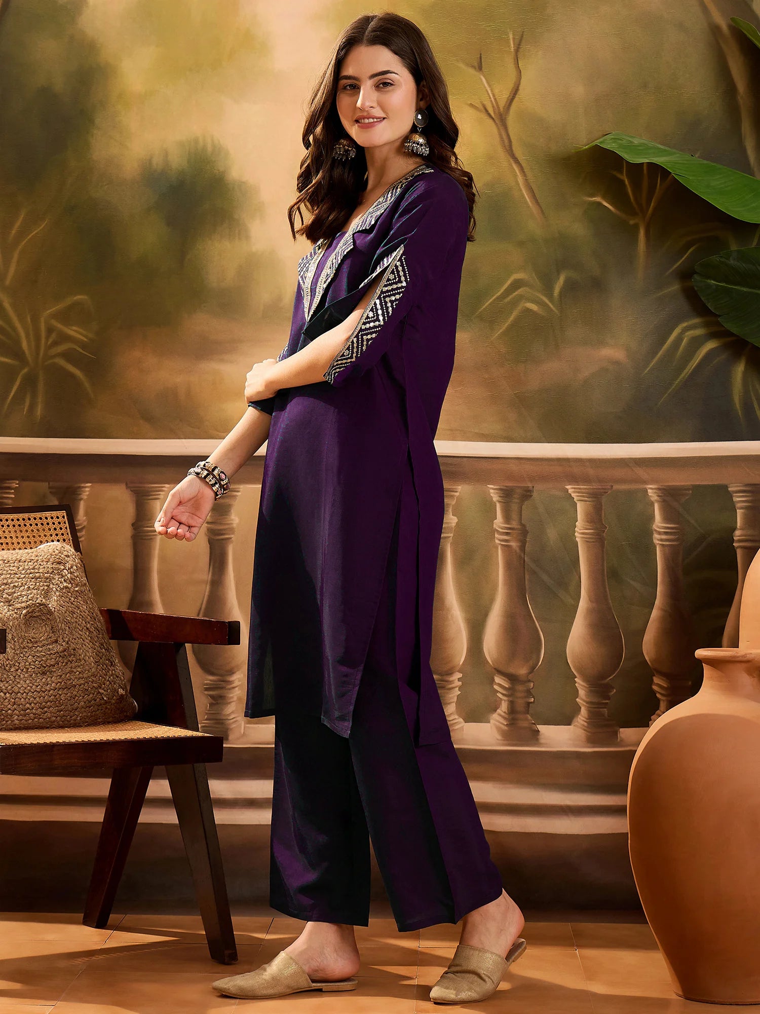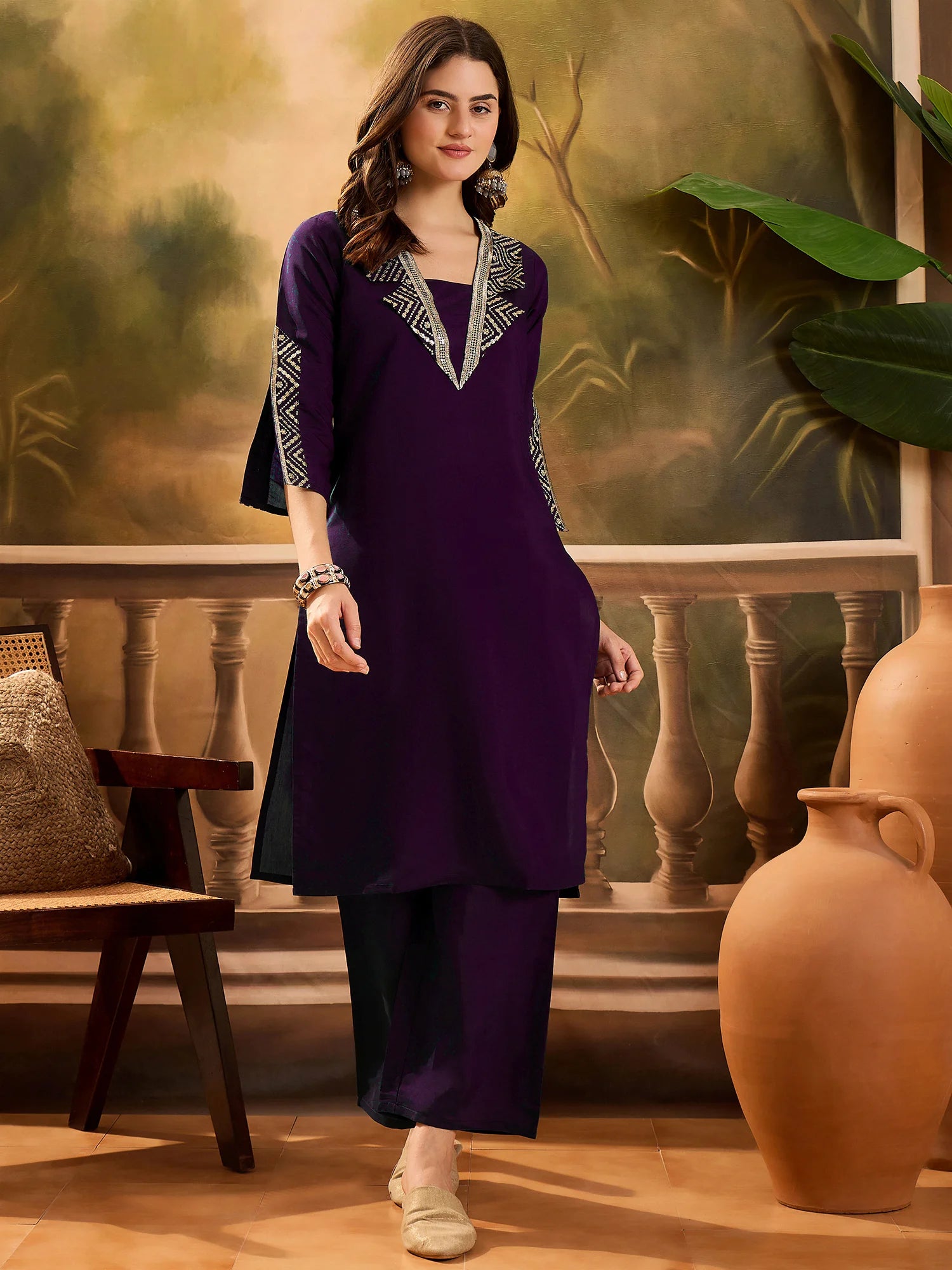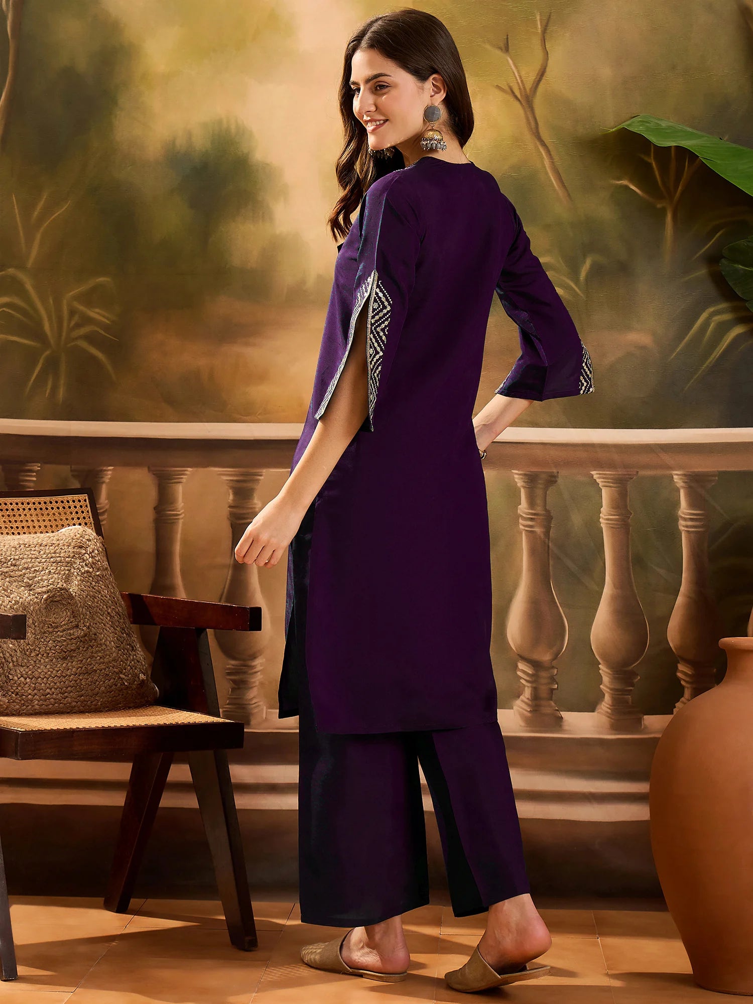 Purple Cotton Silk Embroidered Straight Kurta Palazzo Set