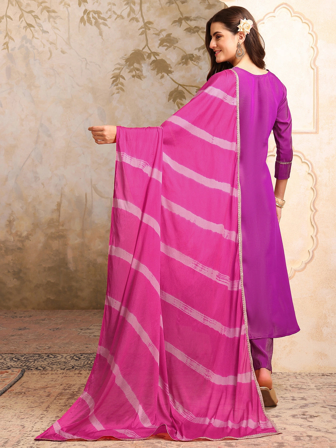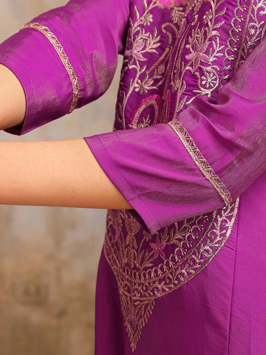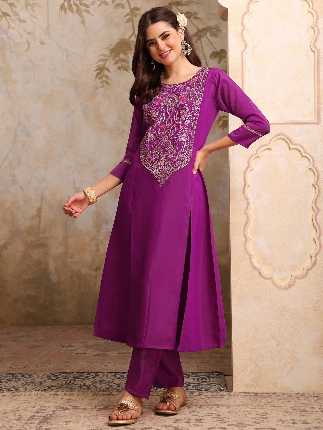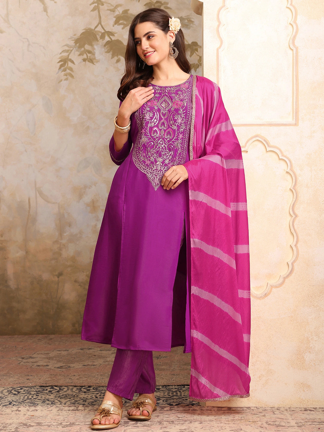 Purple Silk Blend Yoke Embroidery Embroidered A-line Kurta Pant With Dupatta Set