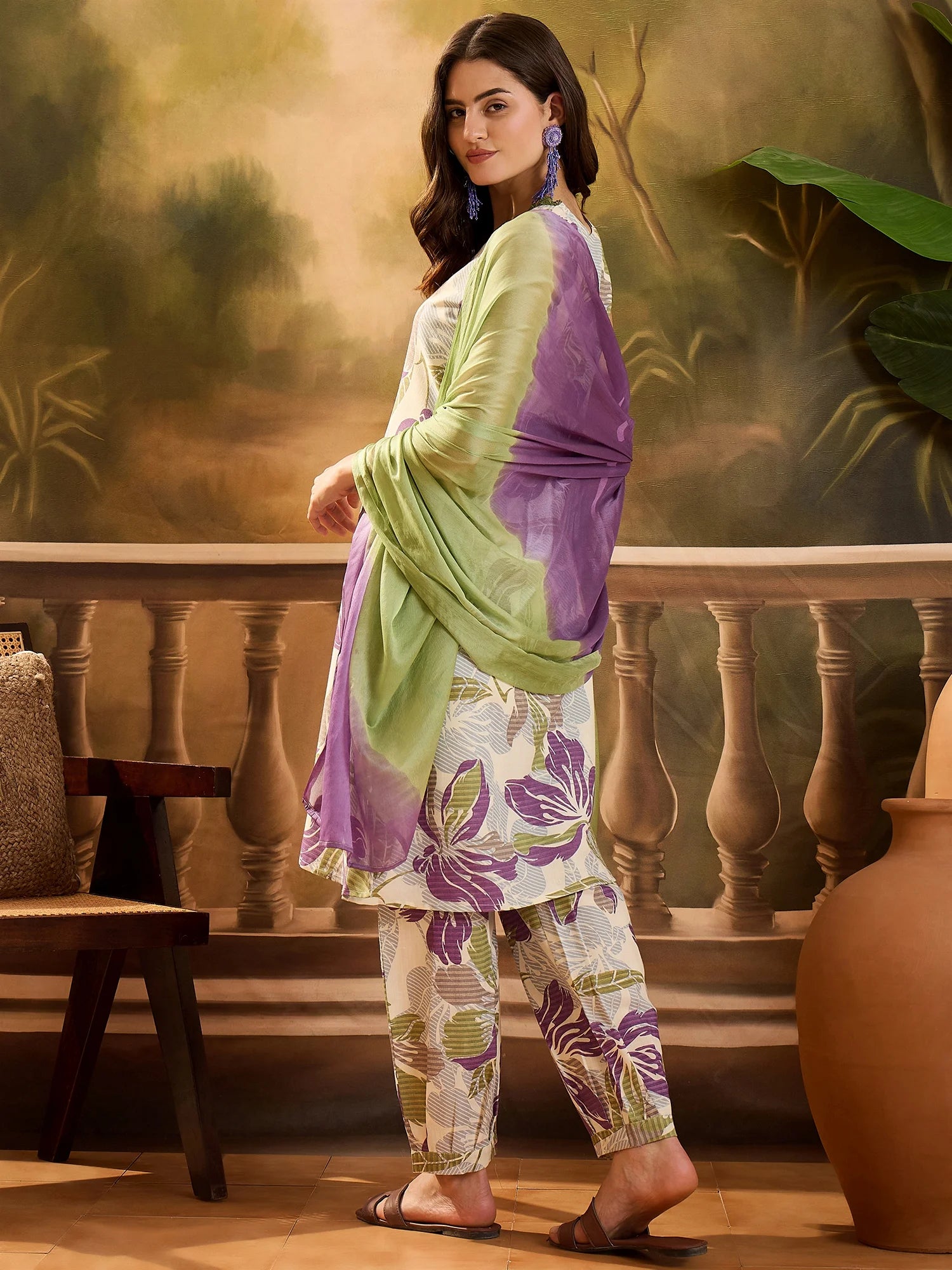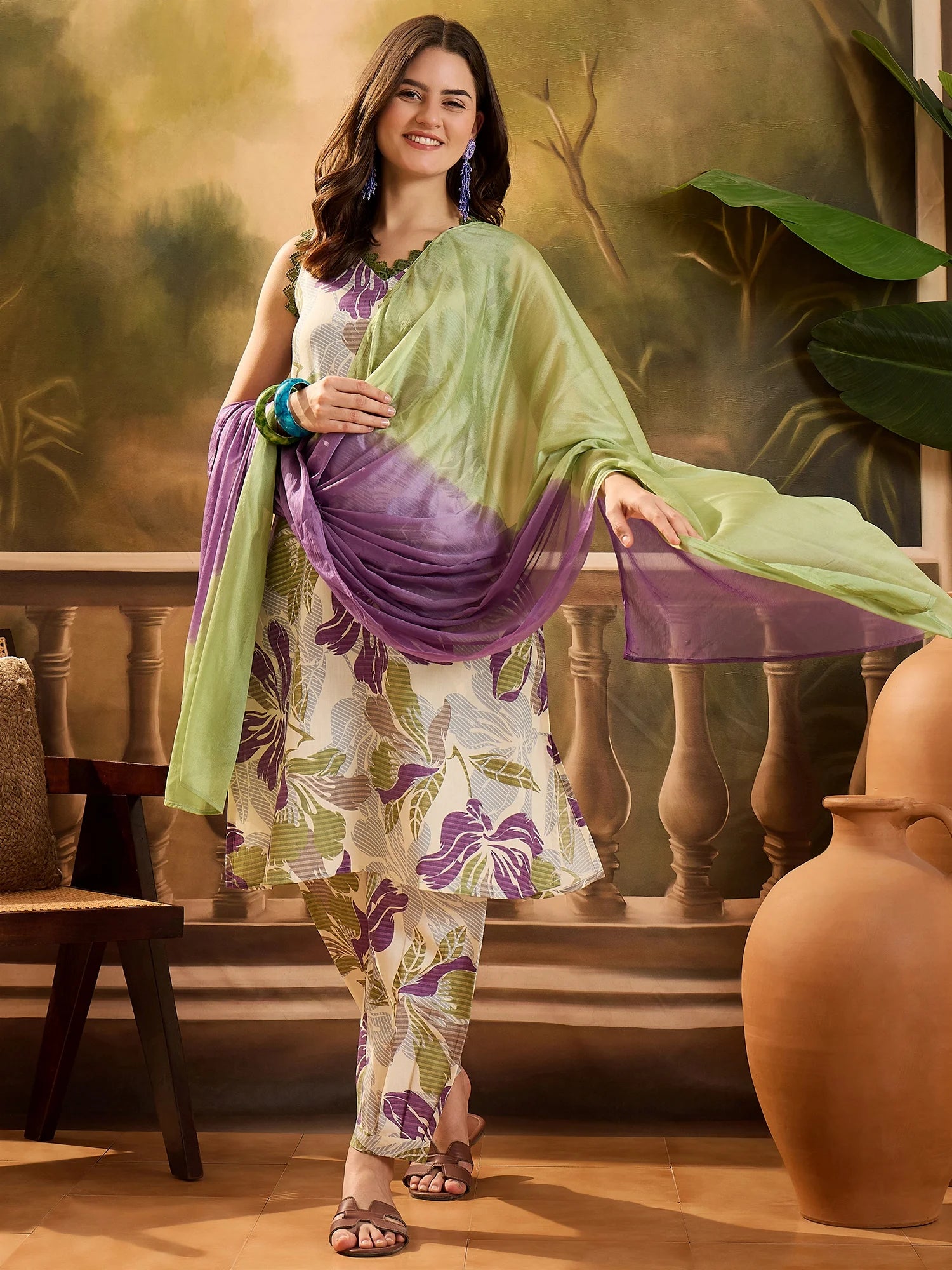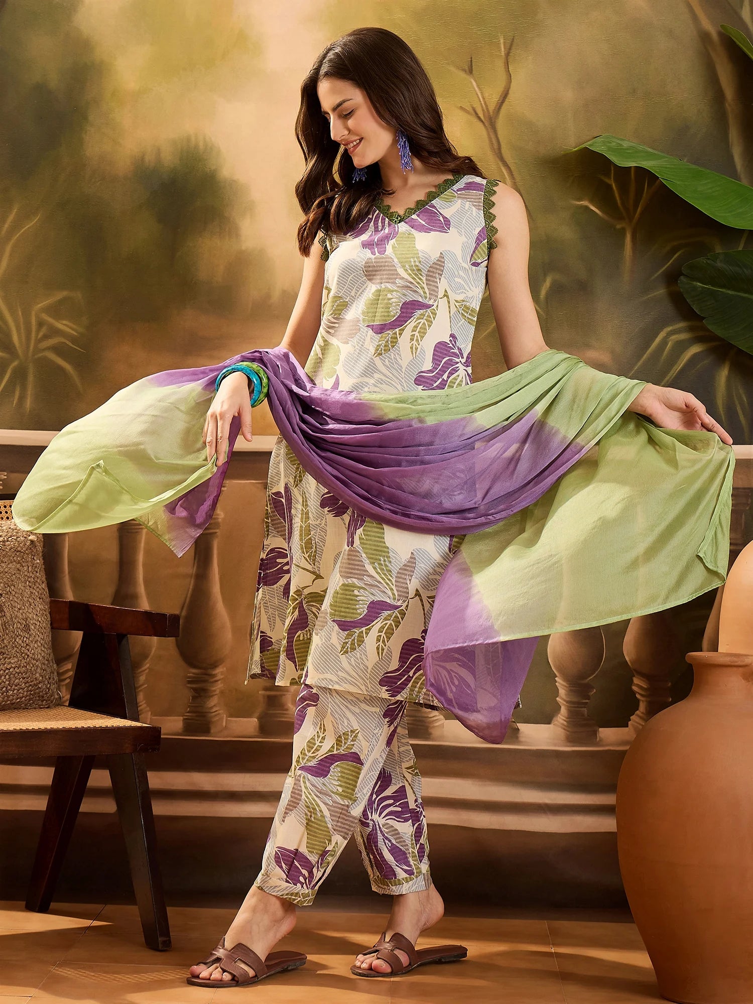 Purple & White Cotton Blend Floral Print Straight Sleeveless Kurta Salwar with Dupatta Set