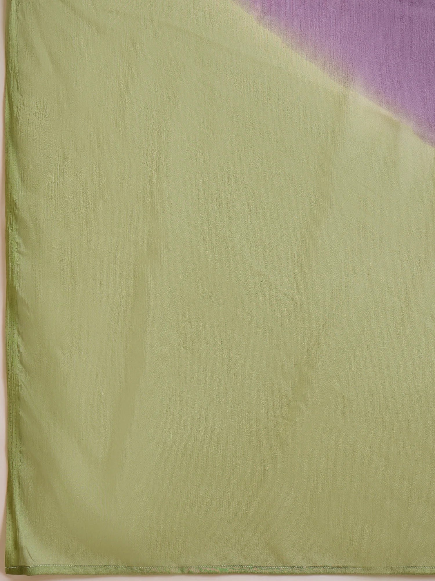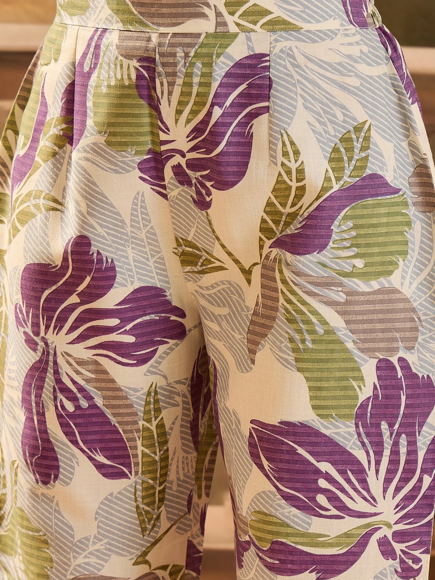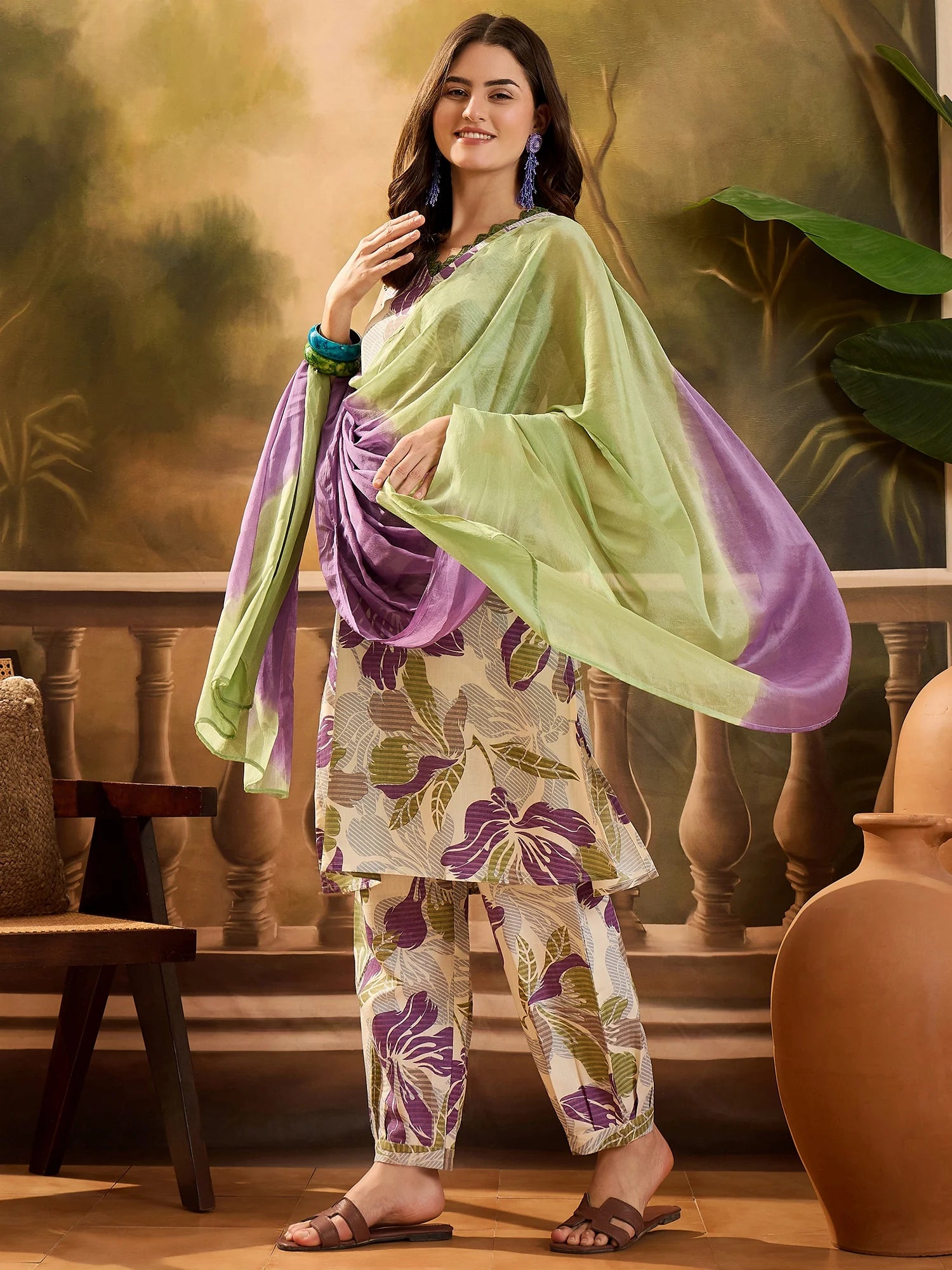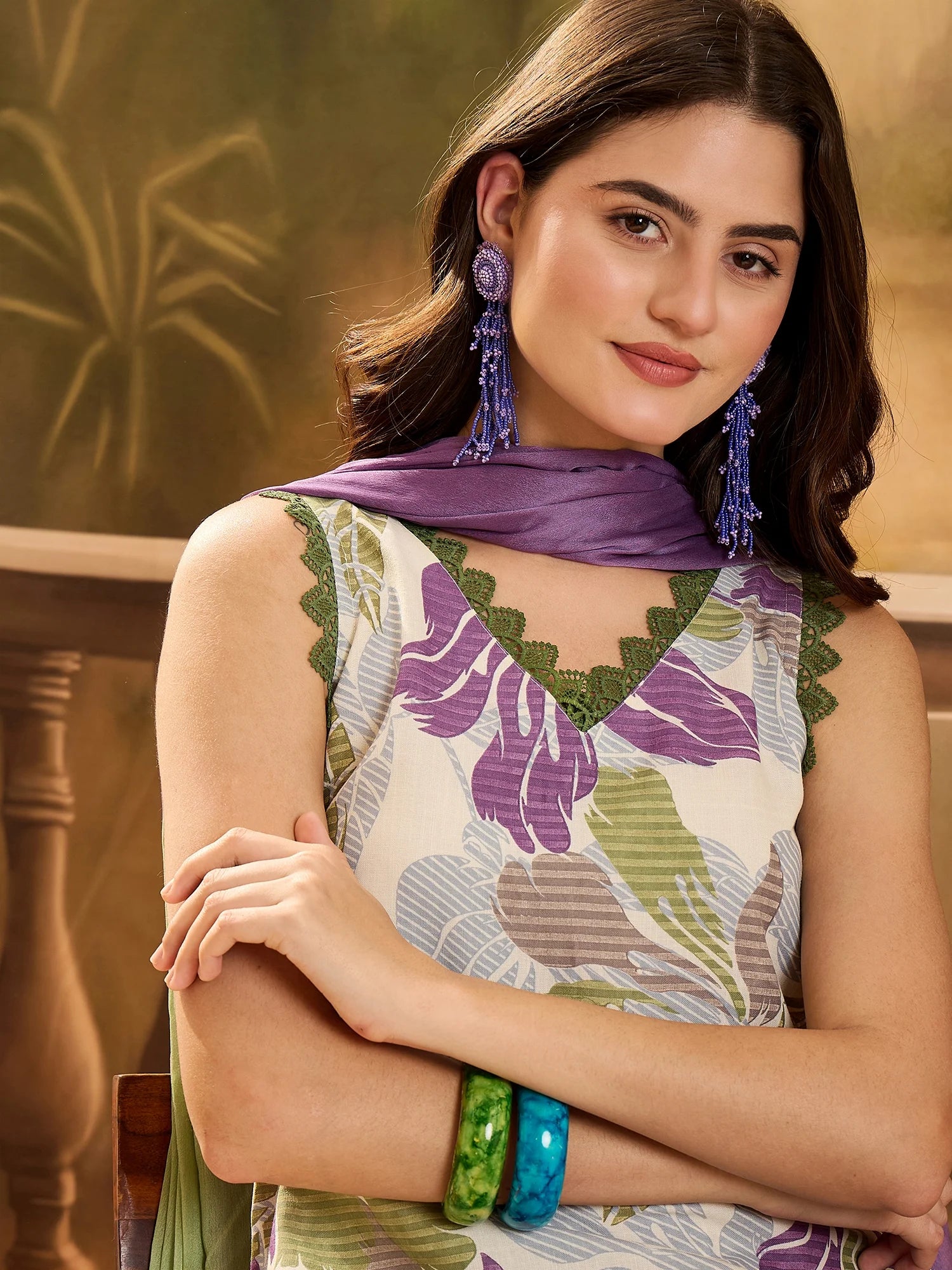 Purple & White Cotton Blend Floral Print Straight Sleeveless Kurta Salwar with Dupatta Set