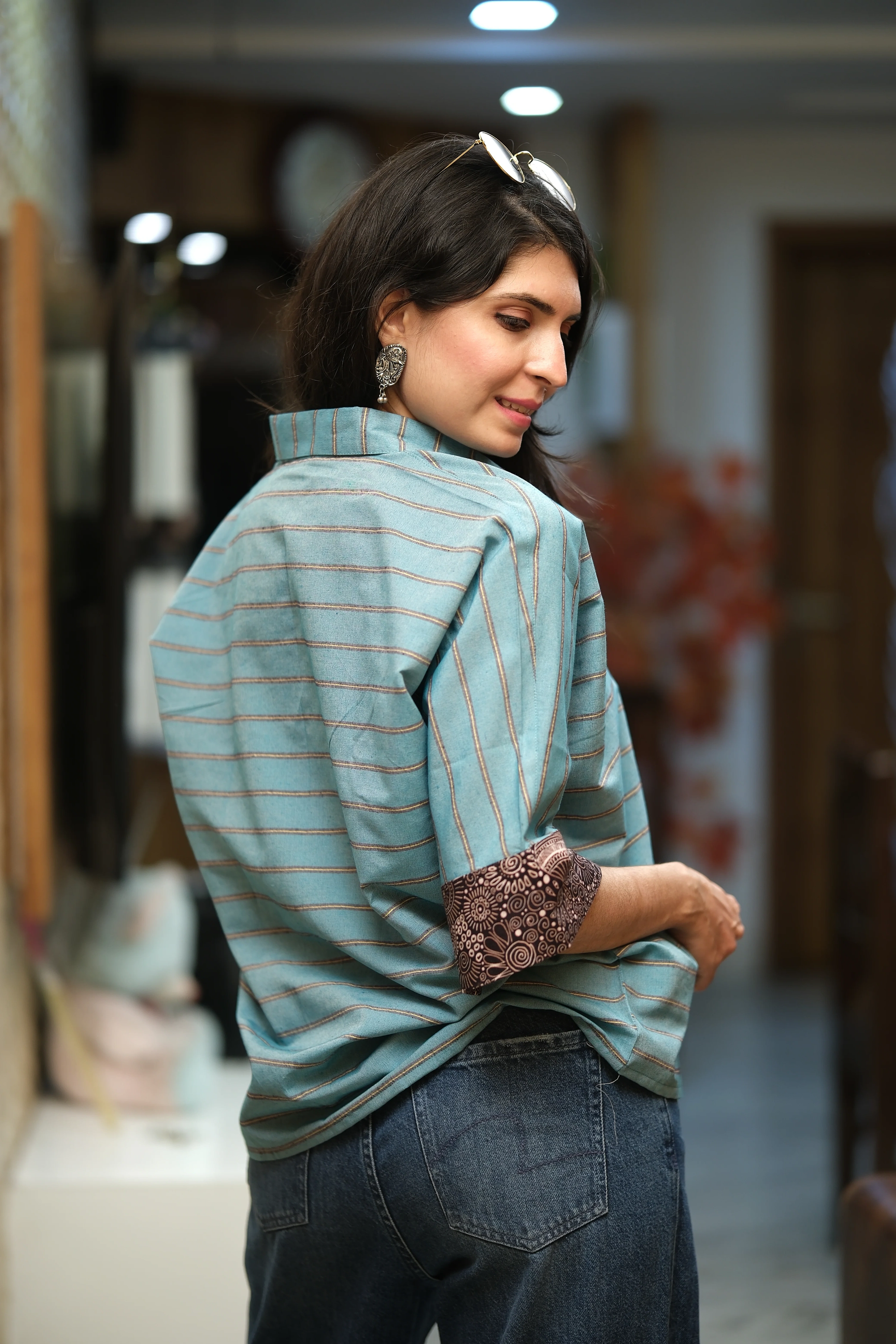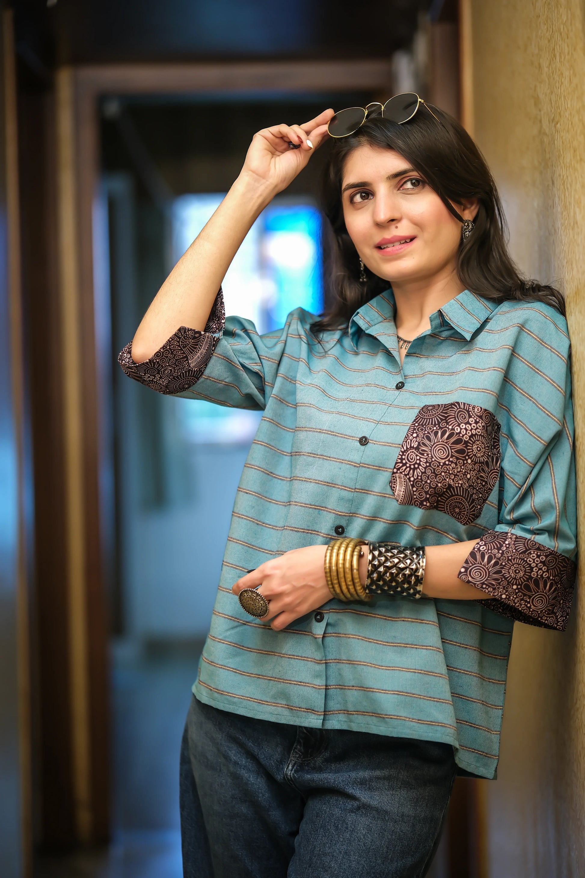 Upgrade your casual wardrobe with this chic Rama Green Cotton Blend striped Boxy Shirt. Designed in a relaxed fit, it features a striped base with contrasting printed details on the pocket and sleeve hems, adding a touch of ethnic flair to its modern silhouette. The button-down front and soft cotton-silk fabric ensure comfort with effortless style. Perfect for pairing with jeans, trousers, or skirts, this versatile shirt is ideal for both casual outings and smart-casual looks.