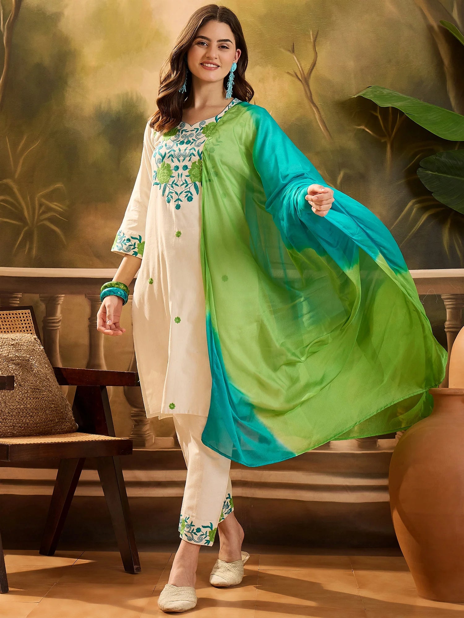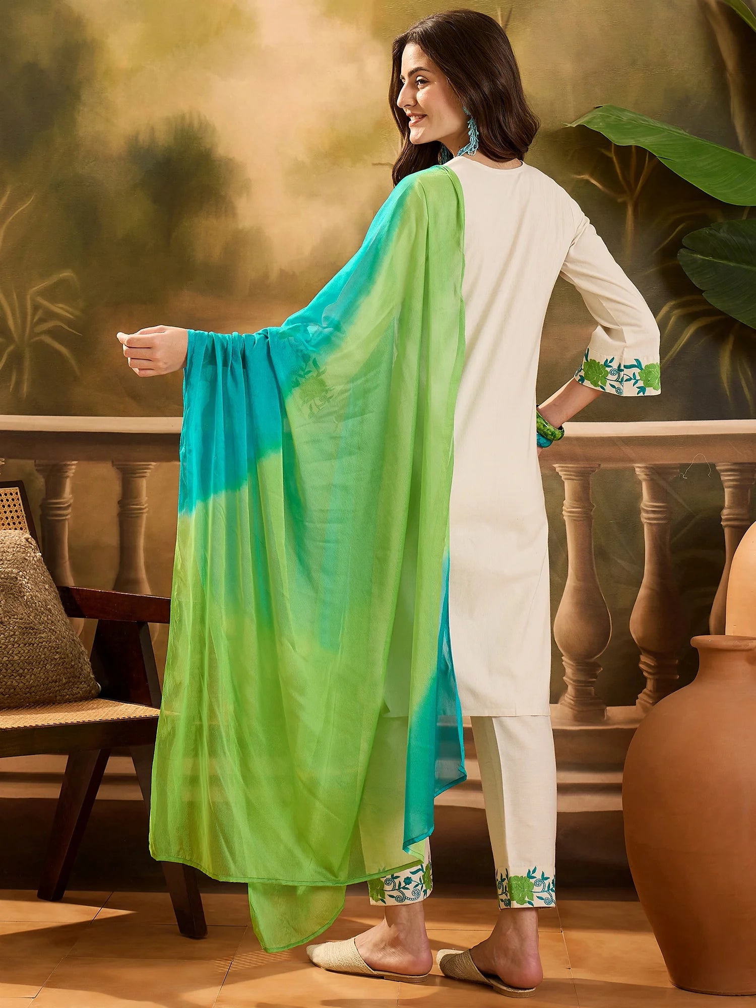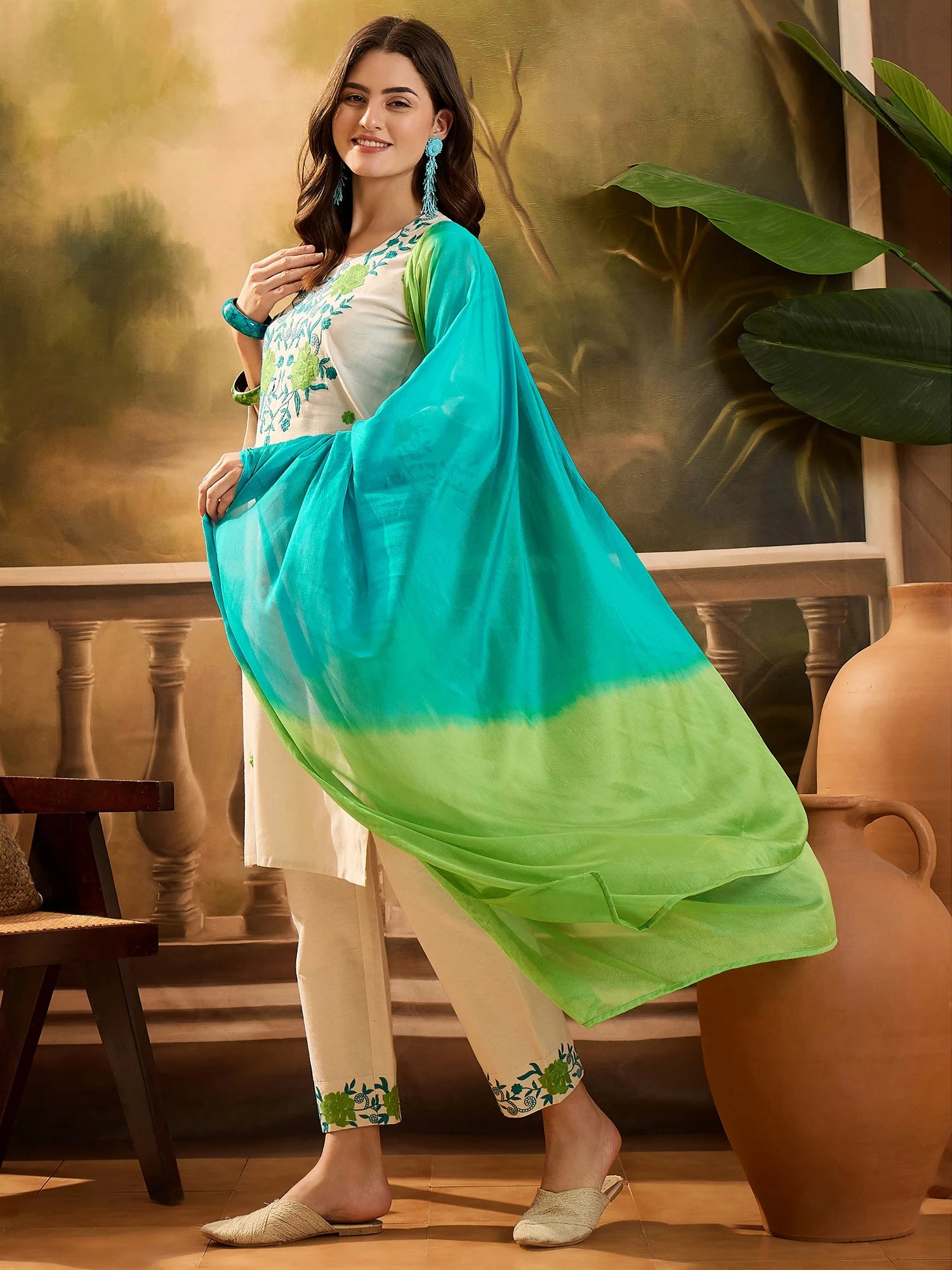 Rama Cotton Blend Floral Embroidered Kurta Pant and Dupatta Set