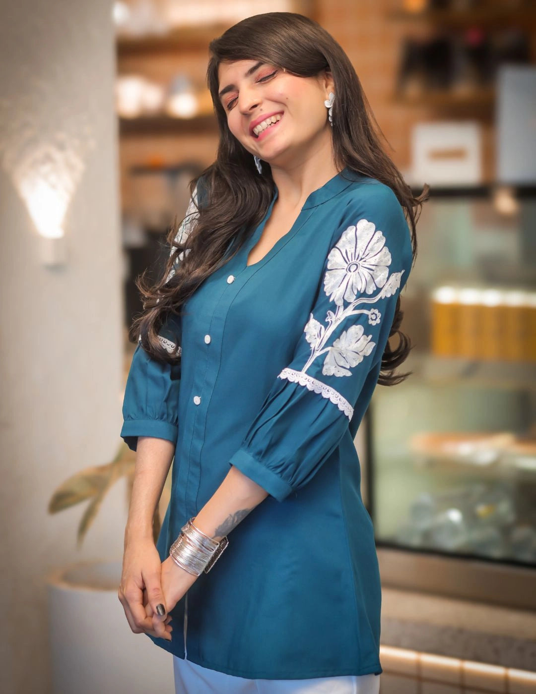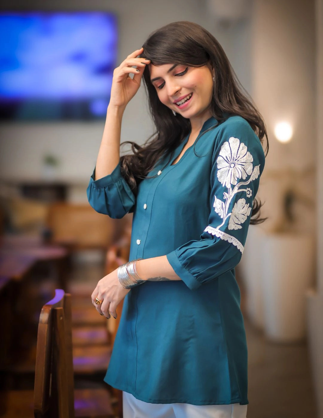 Refresh your everyday wardrobe with this elegant rayon embroidered peplum top. Designed in a vibrant magenta hue, it features delicate floral embroidery on the sleeves and a flattering straight fit for all-day comfort. Perfect for both office and casual wear, this versatile short kurti pairs beautifully with jeans or trousers, giving you a chic yet effortless look.