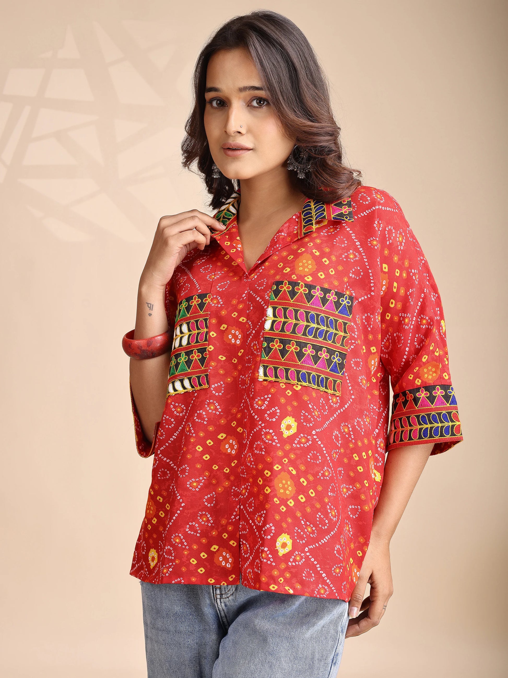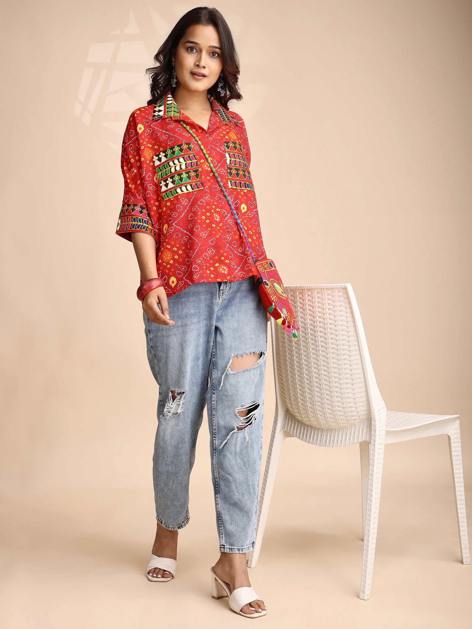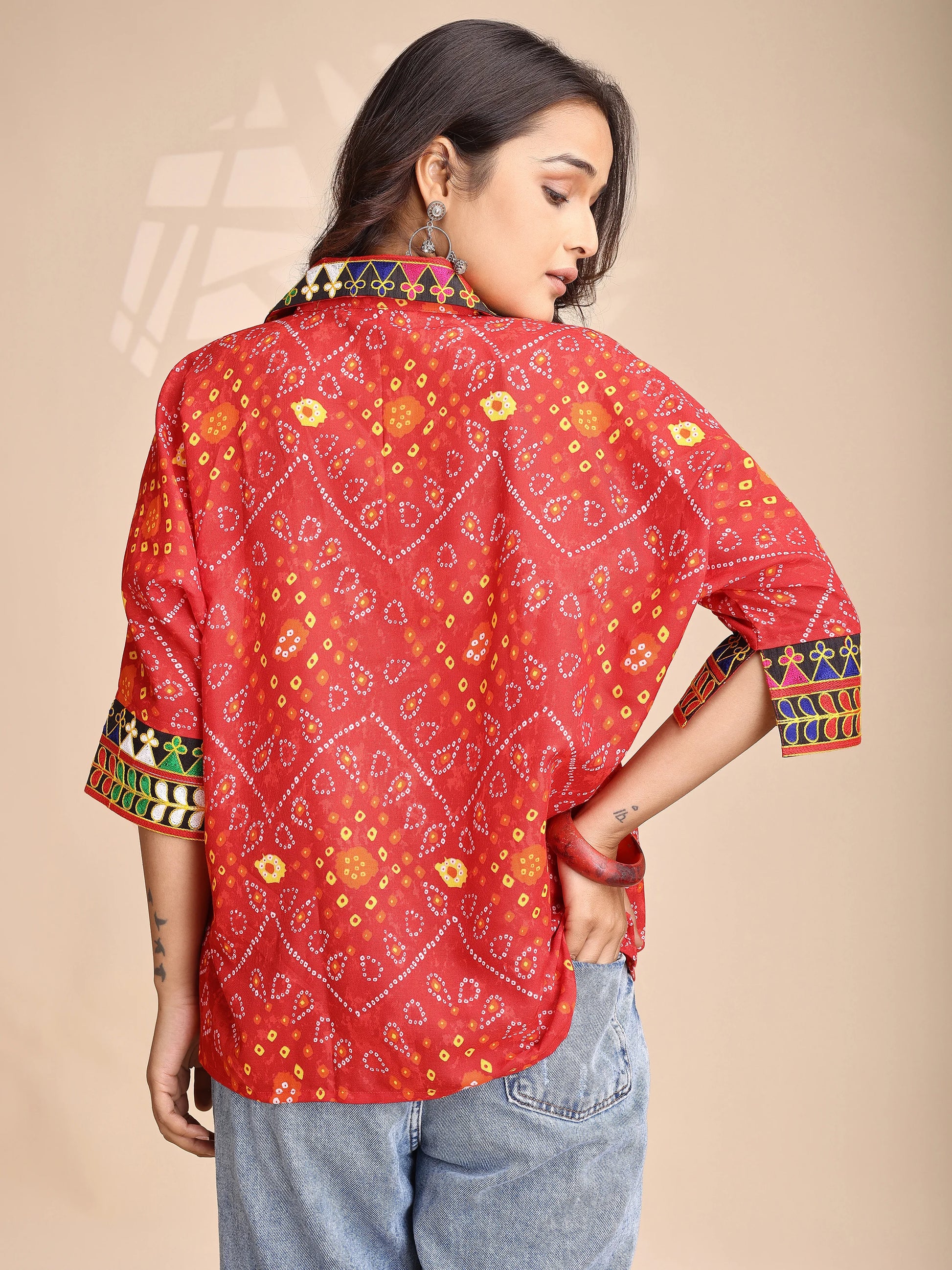 Red Cotton Blend Bandhani print and Embroidered Relex fit Pocket Boxy Shirt Style Top