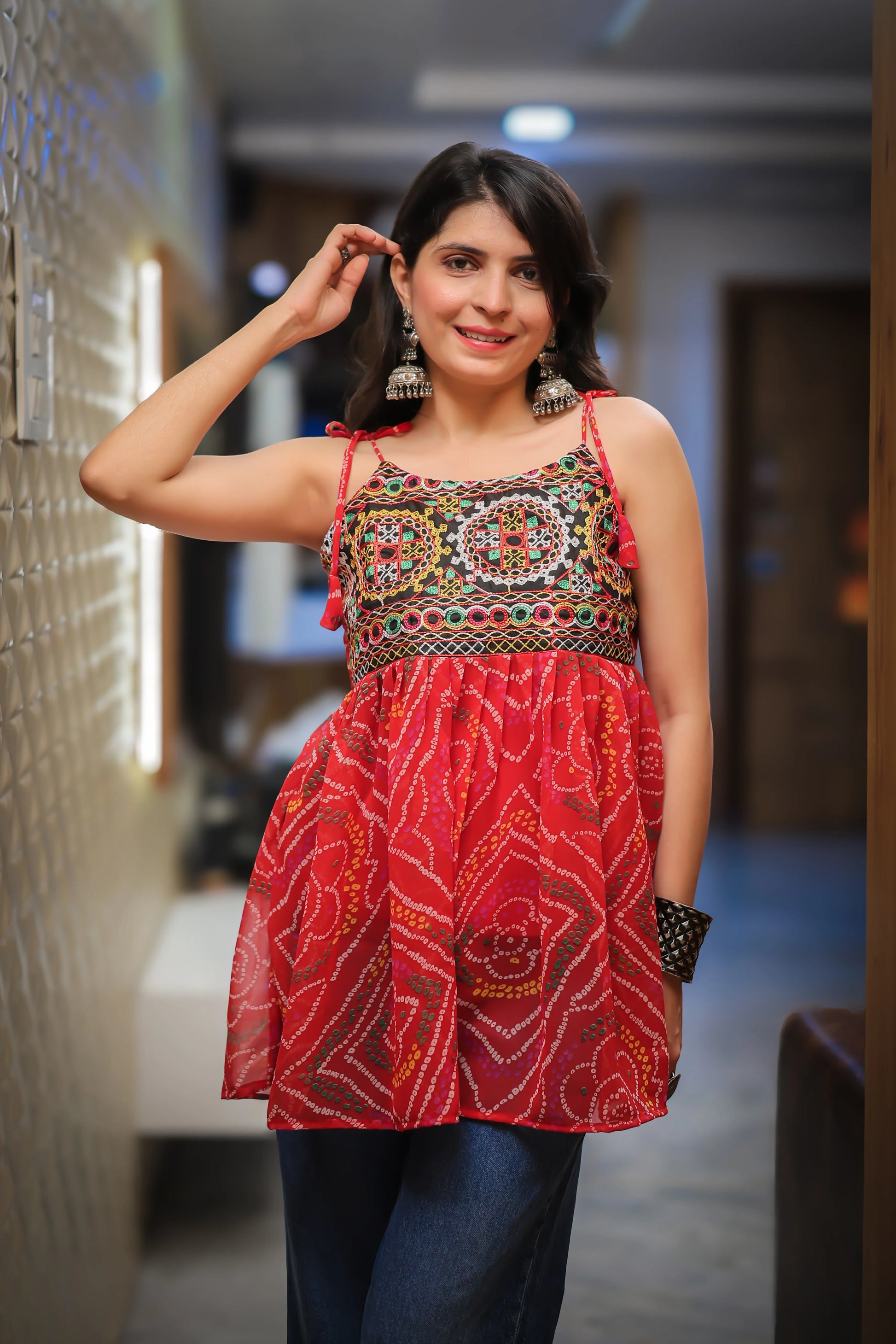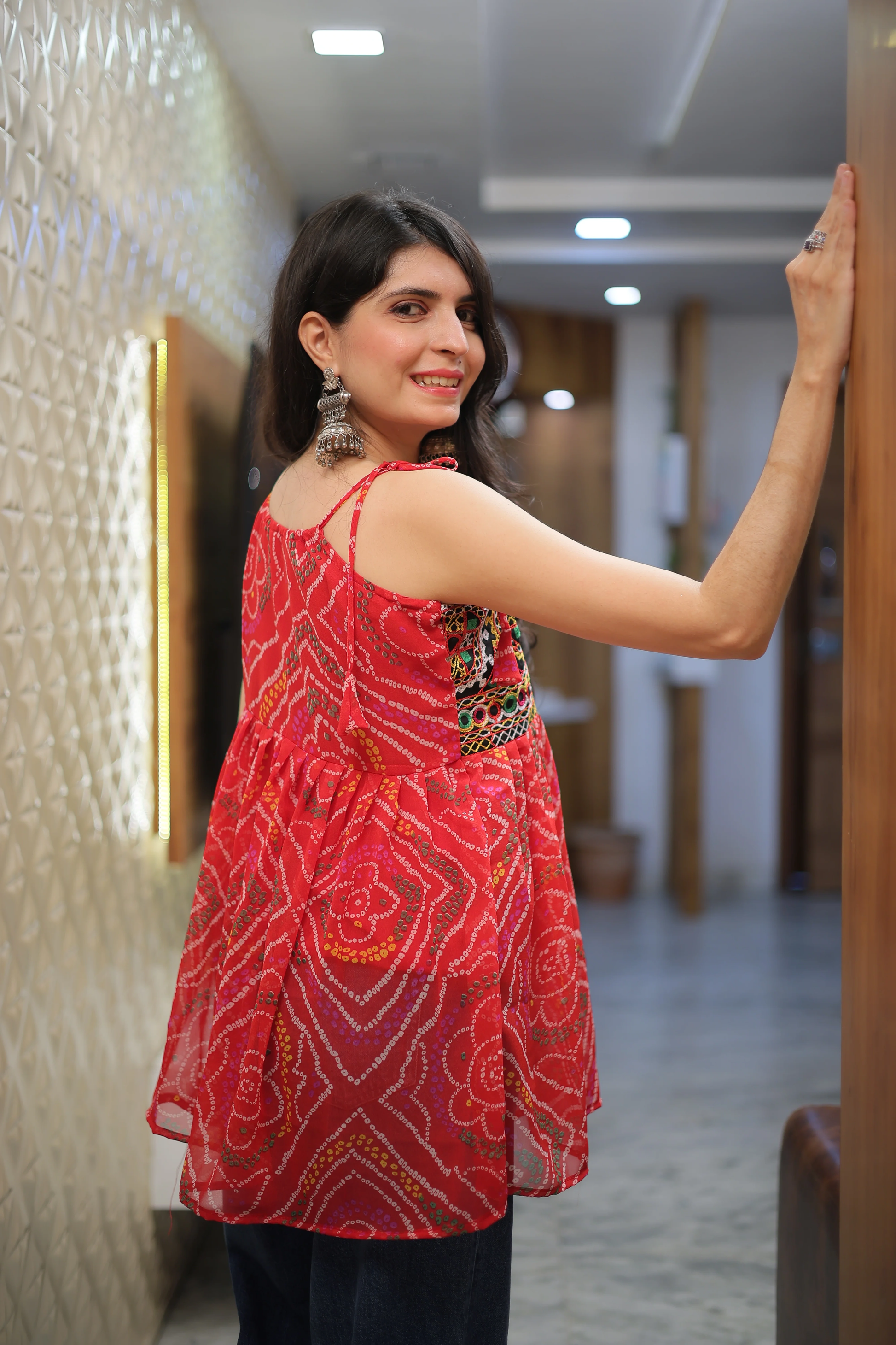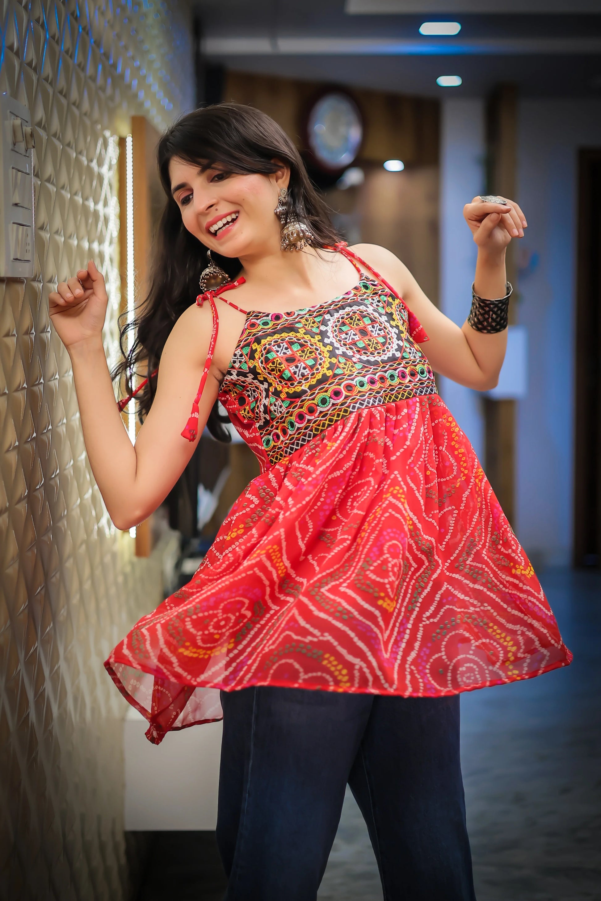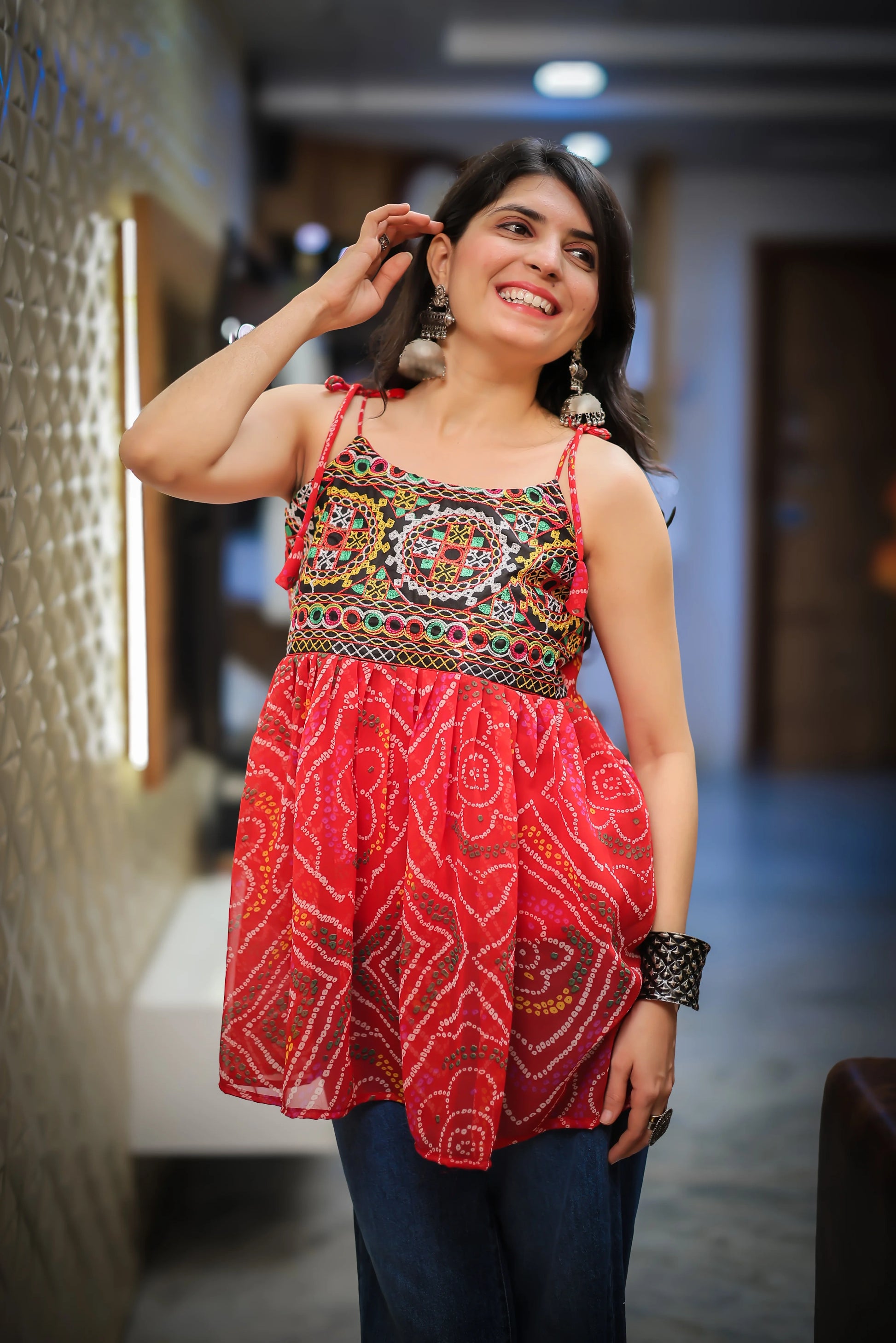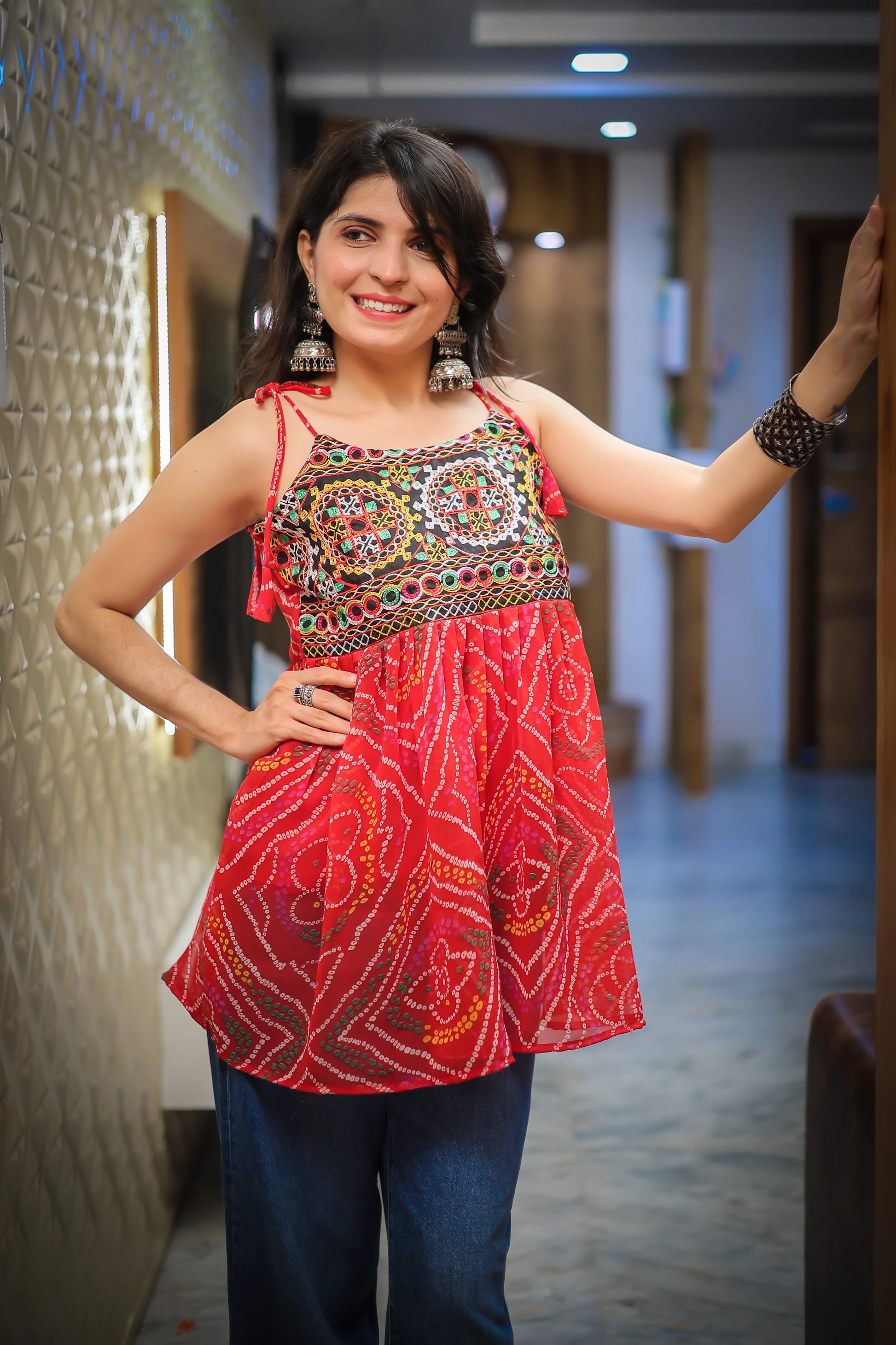 Red bandhani top with intricate threadwork on the yoke and vivid ethnic patterns throughout. Designed with an A-line flared cut and adjustable tie-up shoulders for effortless style and comfort. Perfect for Navratri, festive gatherings, or everyday ethnic-casual outfits. Easily styled with denim or ethnic bottoms for a trendy fusion ensemble.