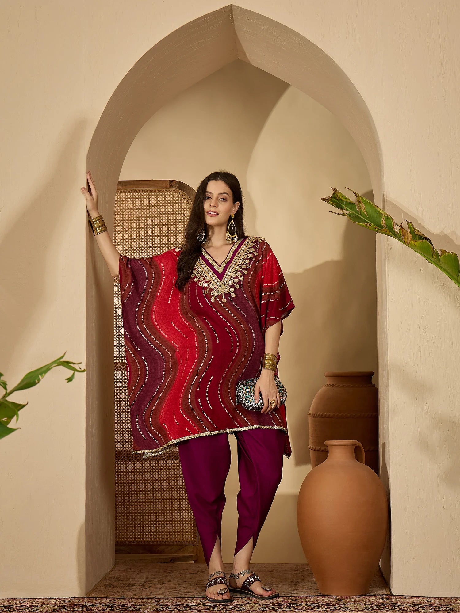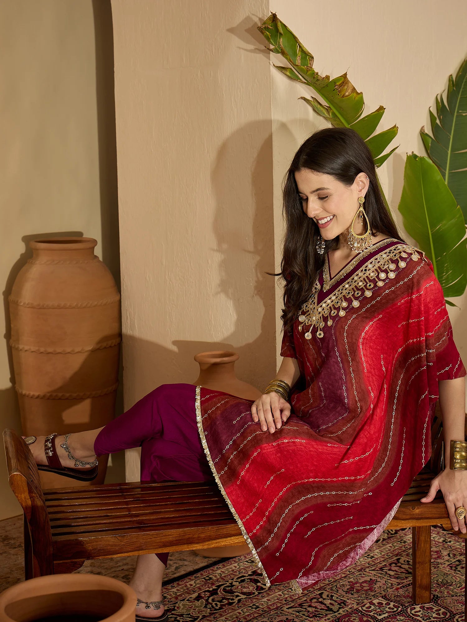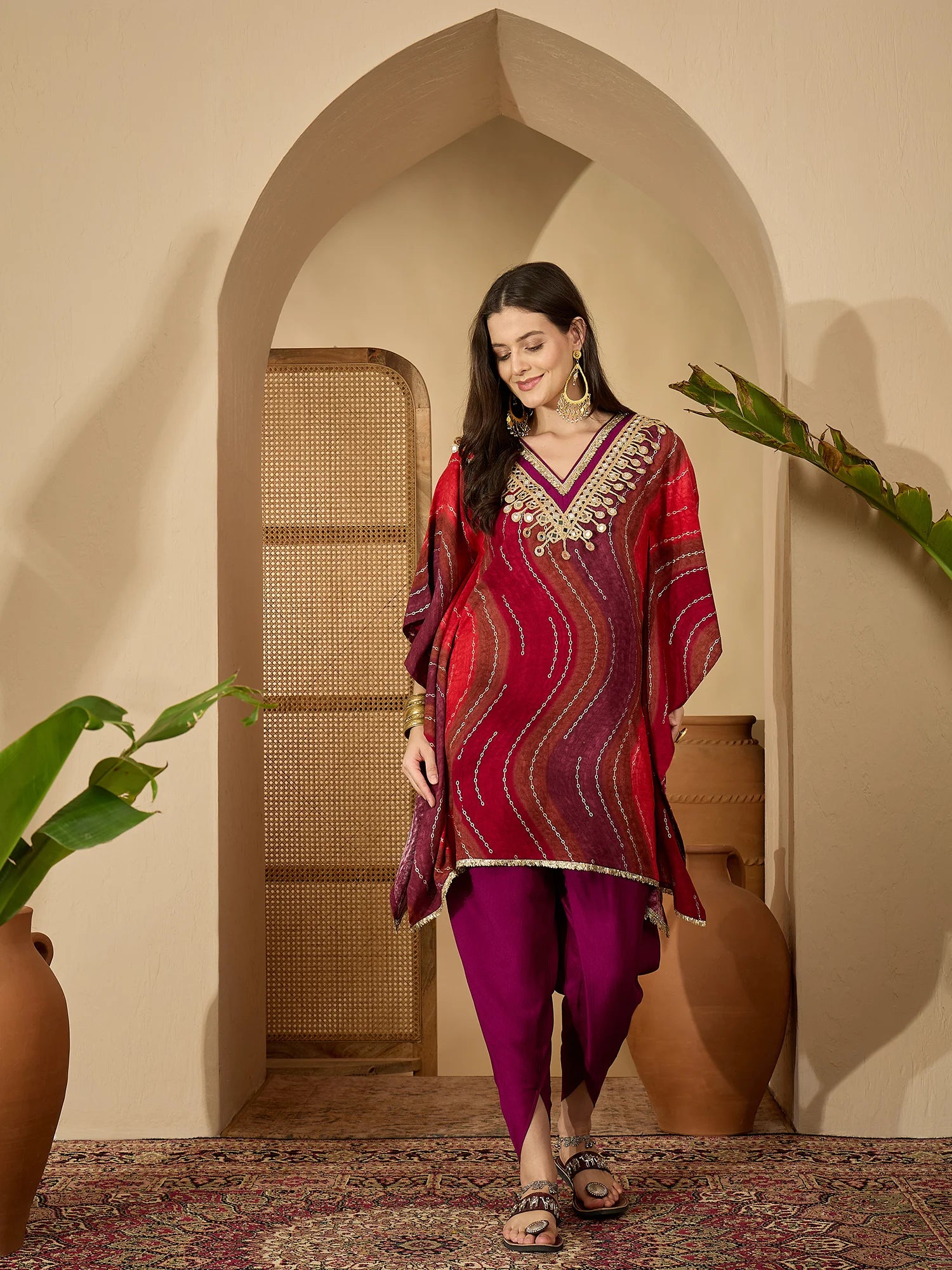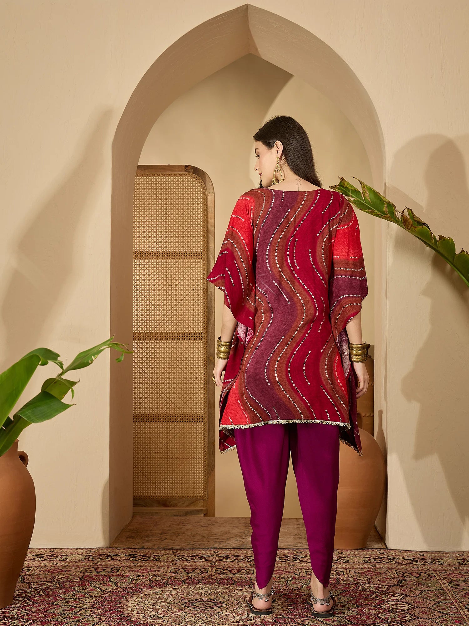 Red Viscose Rayon Leheriya Print Kaftan Kurta with Dhoti Pant Set