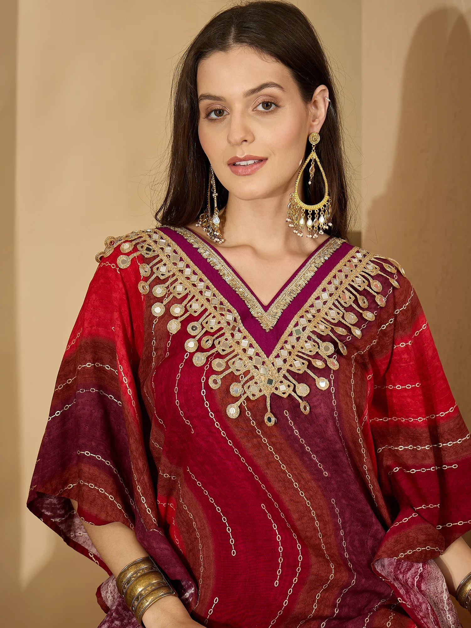 Elevate your ethnic wardrobe with this stunning Rayon Embroidered Kaftan Kurta Dhoti Set for women. Crafted from soft and breathable rayon fabric, this ensemble features a flowy kaftan-style kurta adorned with intricate embroidery and sequin detailing around the neckline and hem. Paired with a matching dhoti pant, the outfit offers comfort with a touch of elegance — perfect for festive occasions, mehendi functions, or intimate celebrations. The relaxed silhouette flatters all body types, while the earthy Red tones add a vibrant yet graceful charm.
