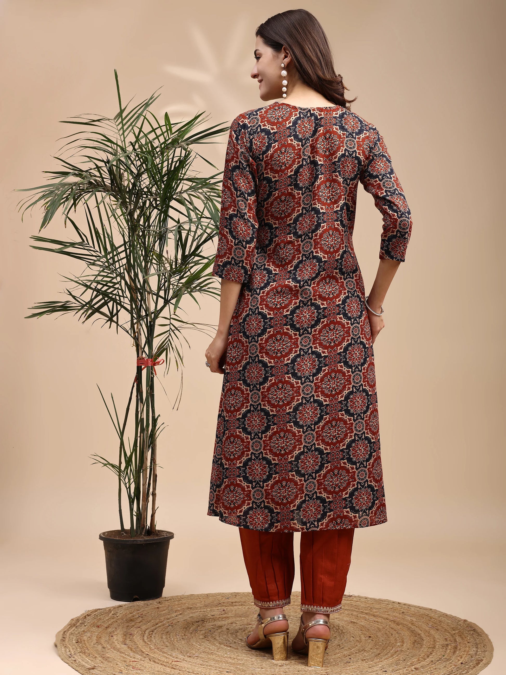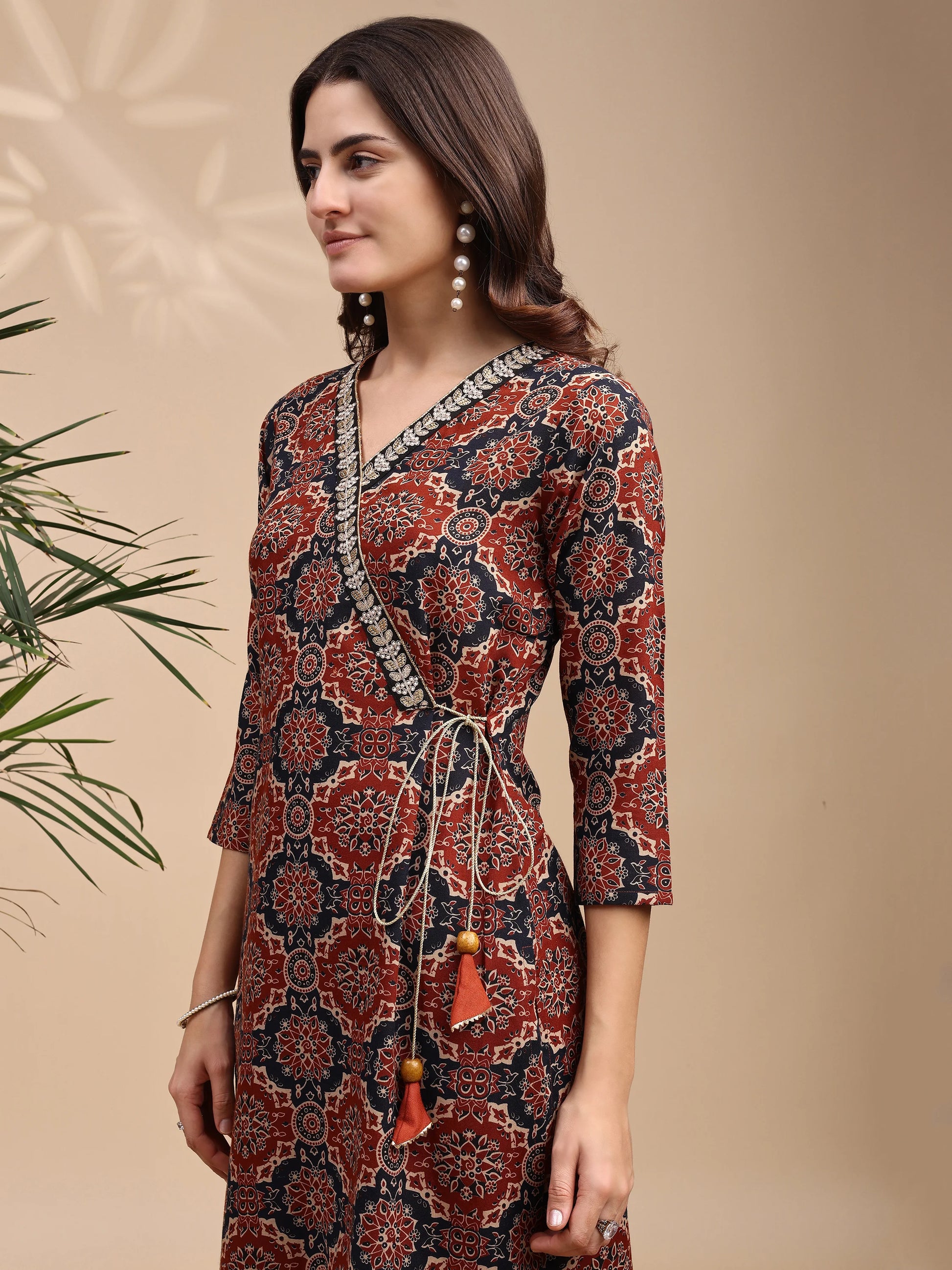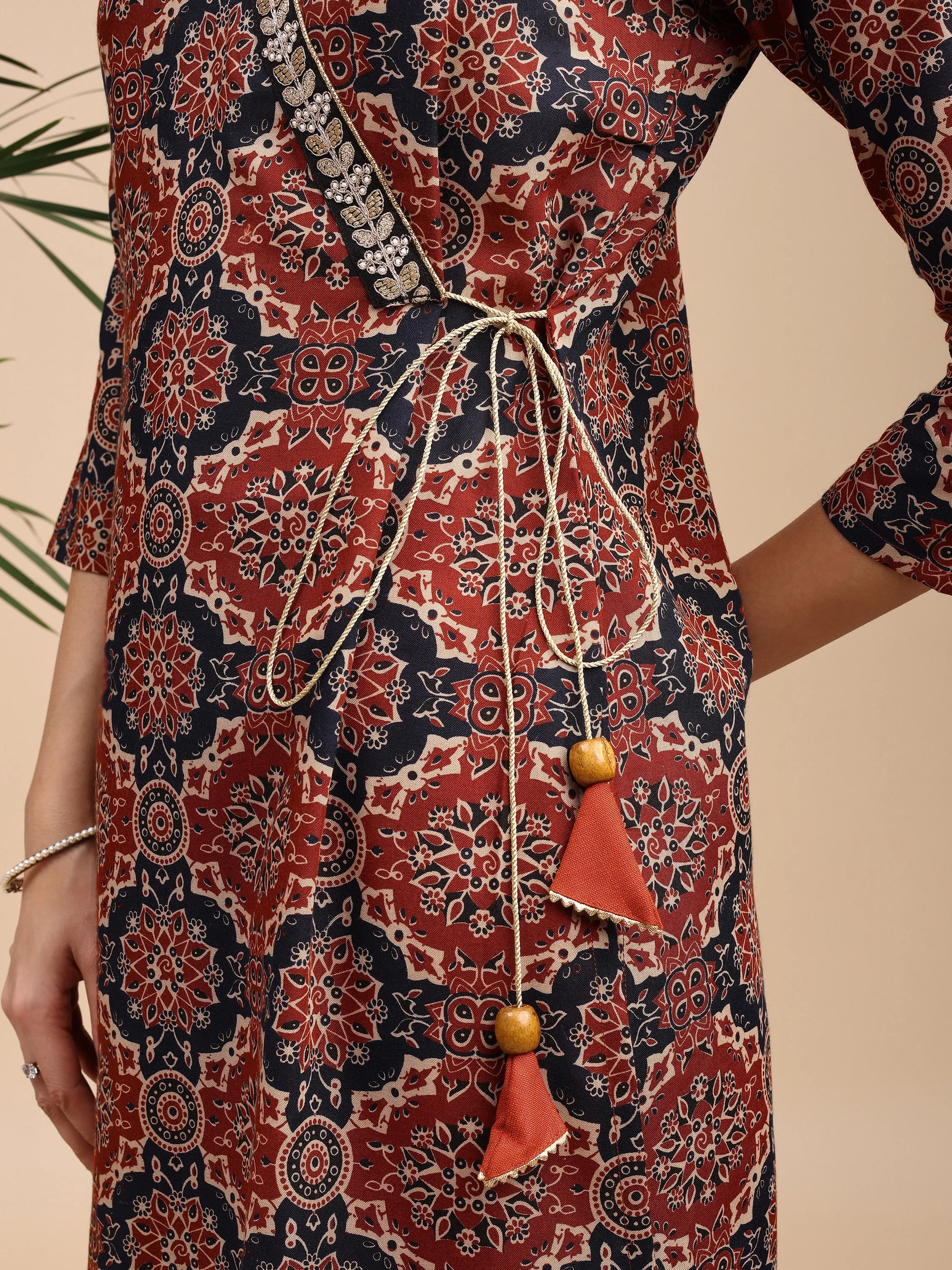 Make a style statement in this rust-colored Ajrakh-inspired short kurti with classic prints and trendy tassel detailing on the side. The soft, comfy fit makes it ideal for daily wear while keeping your ethnic vibe on point.