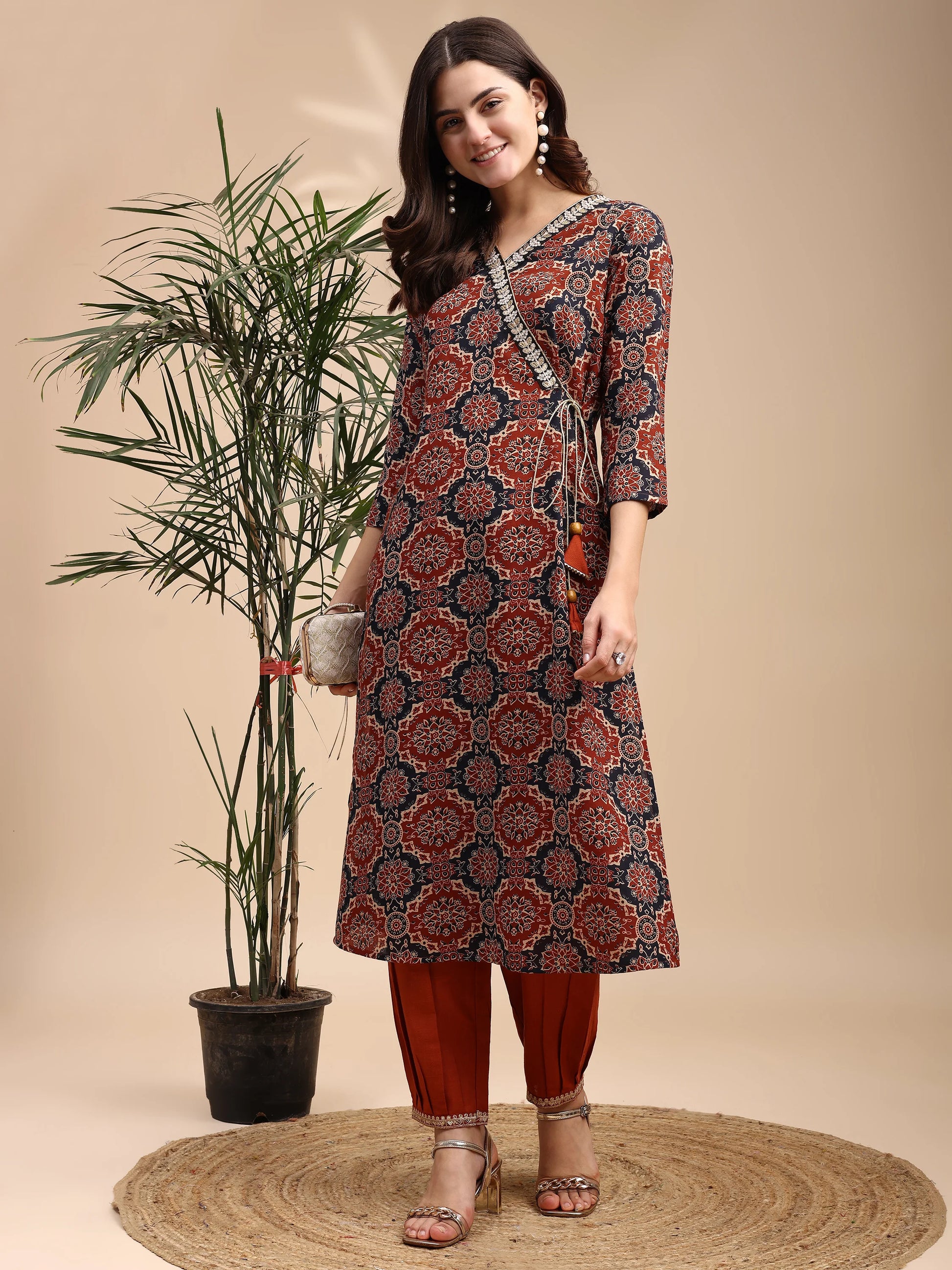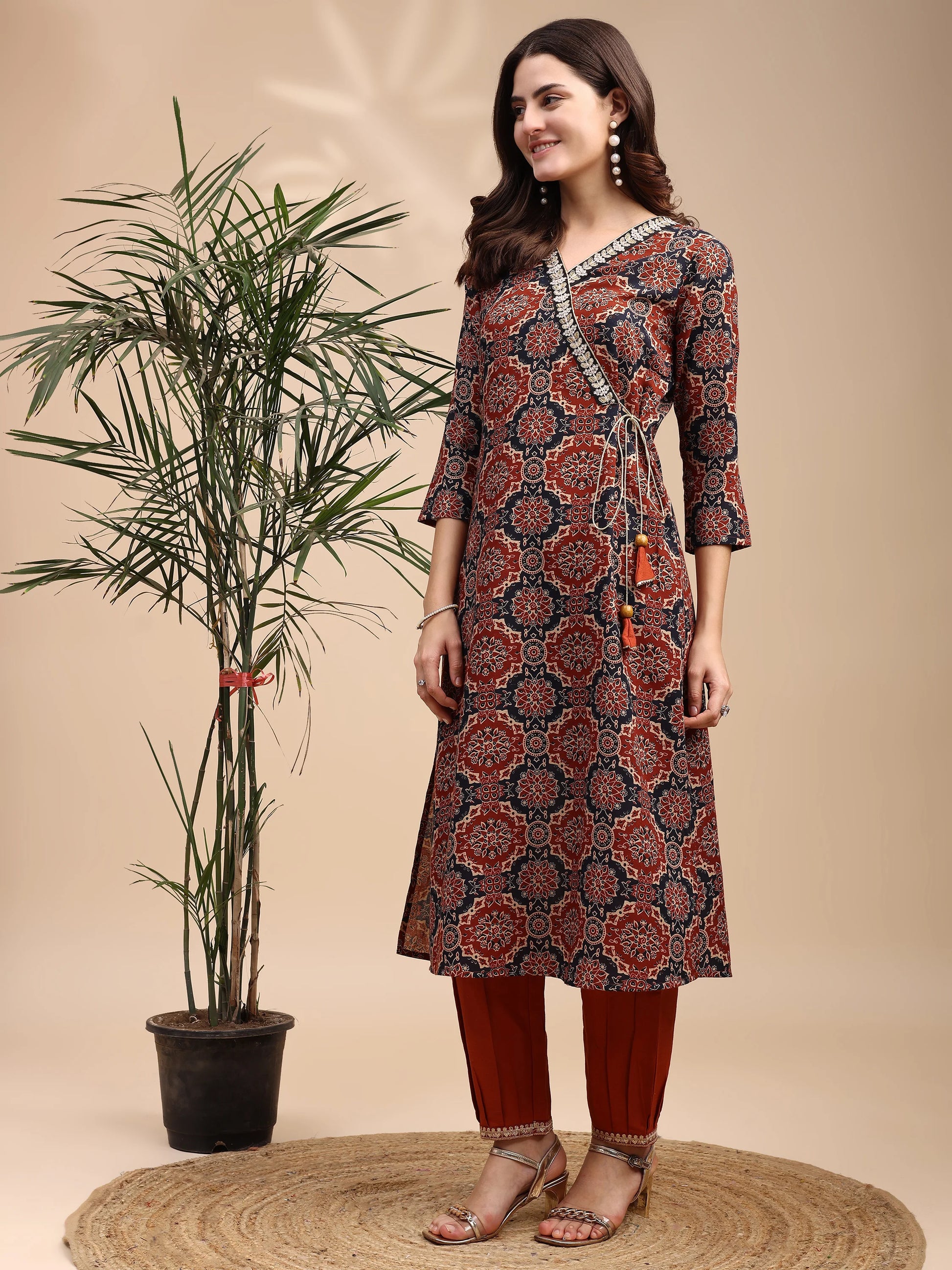 Rust Cotton Blend Ajrak Print Angrakha Knot Kurta