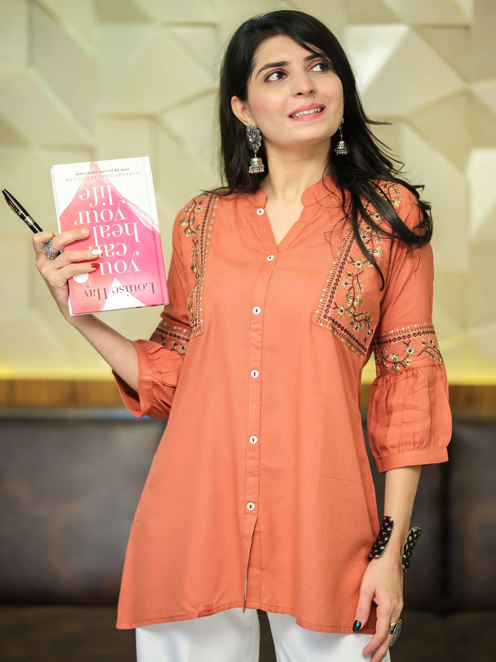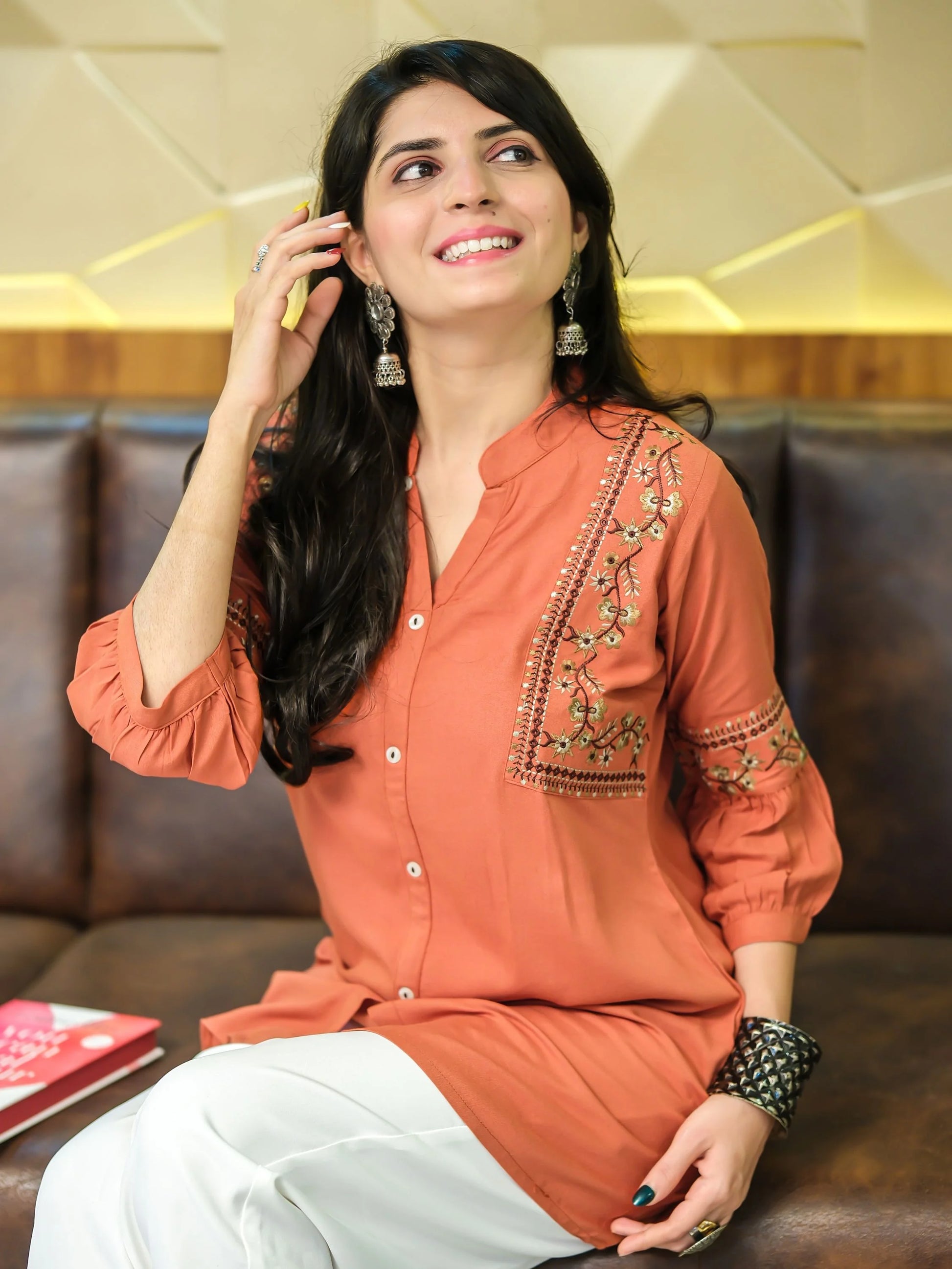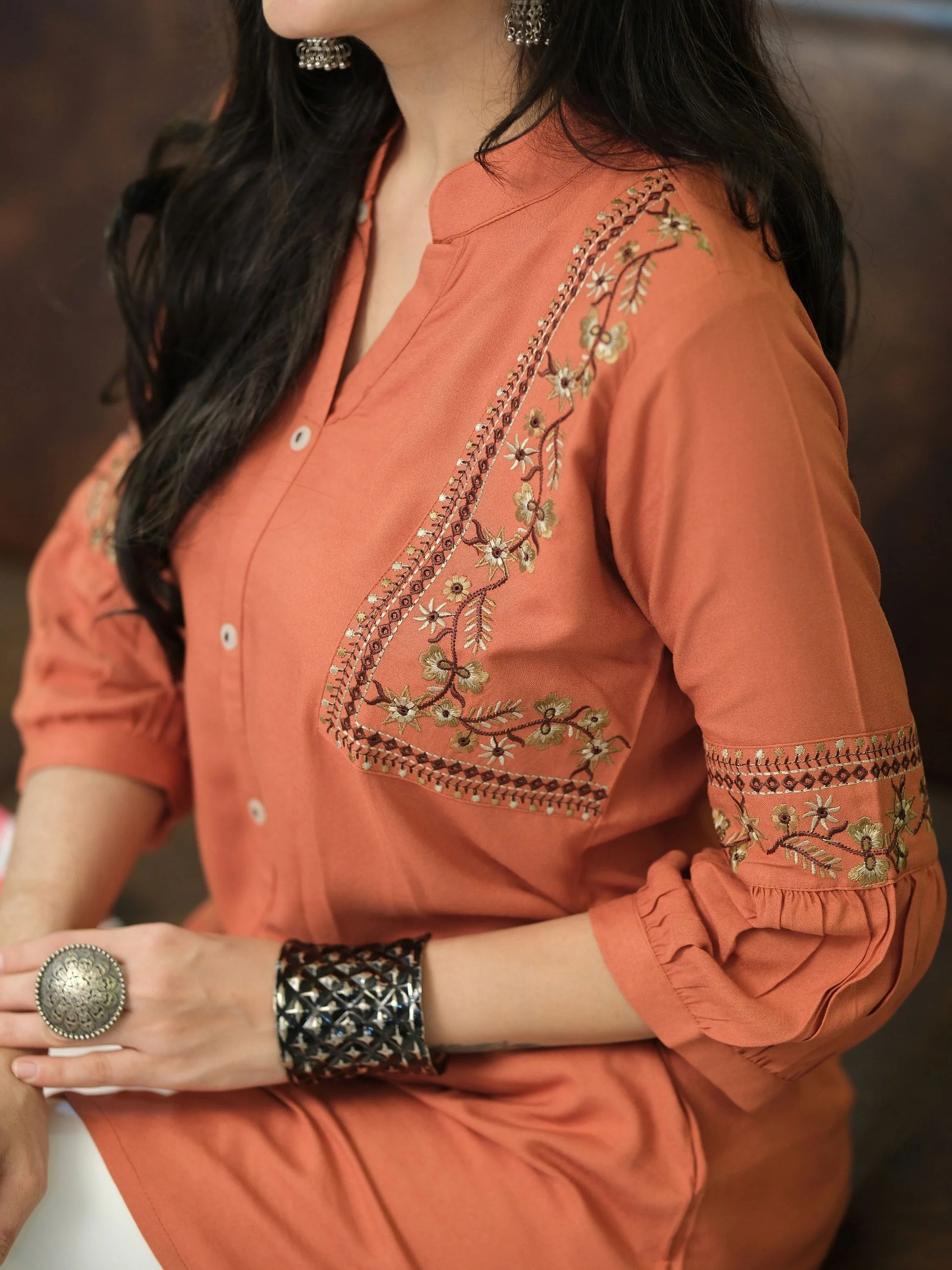 Elevate your style with this exquisite Rust Kurti from Youthnic, crafted from soft and breathable Viscose Rayon fabric. Its Round neck design and intricate front panel embroidery add a touch of elegance, making it a perfect choice for parties and special occasions. The kurta features regular 3/4 sleeves, providing a comfortable and stylish fit. With its above-knee length, this kurta pairs beautifully with both blue and black jeans, offering versatile styling options