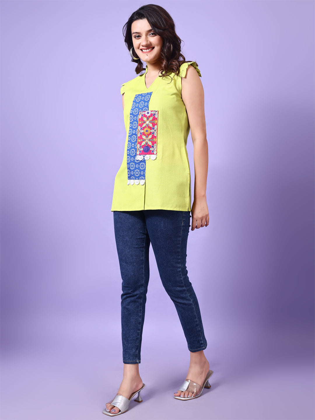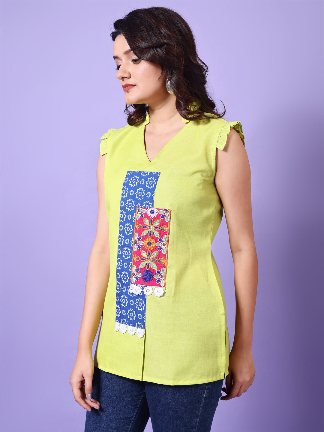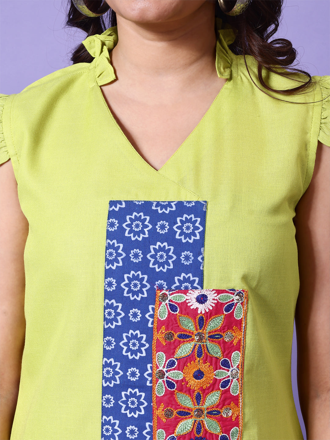 Parrot Green Straight Cotton Patch Work Embroidered Short Tunic Top