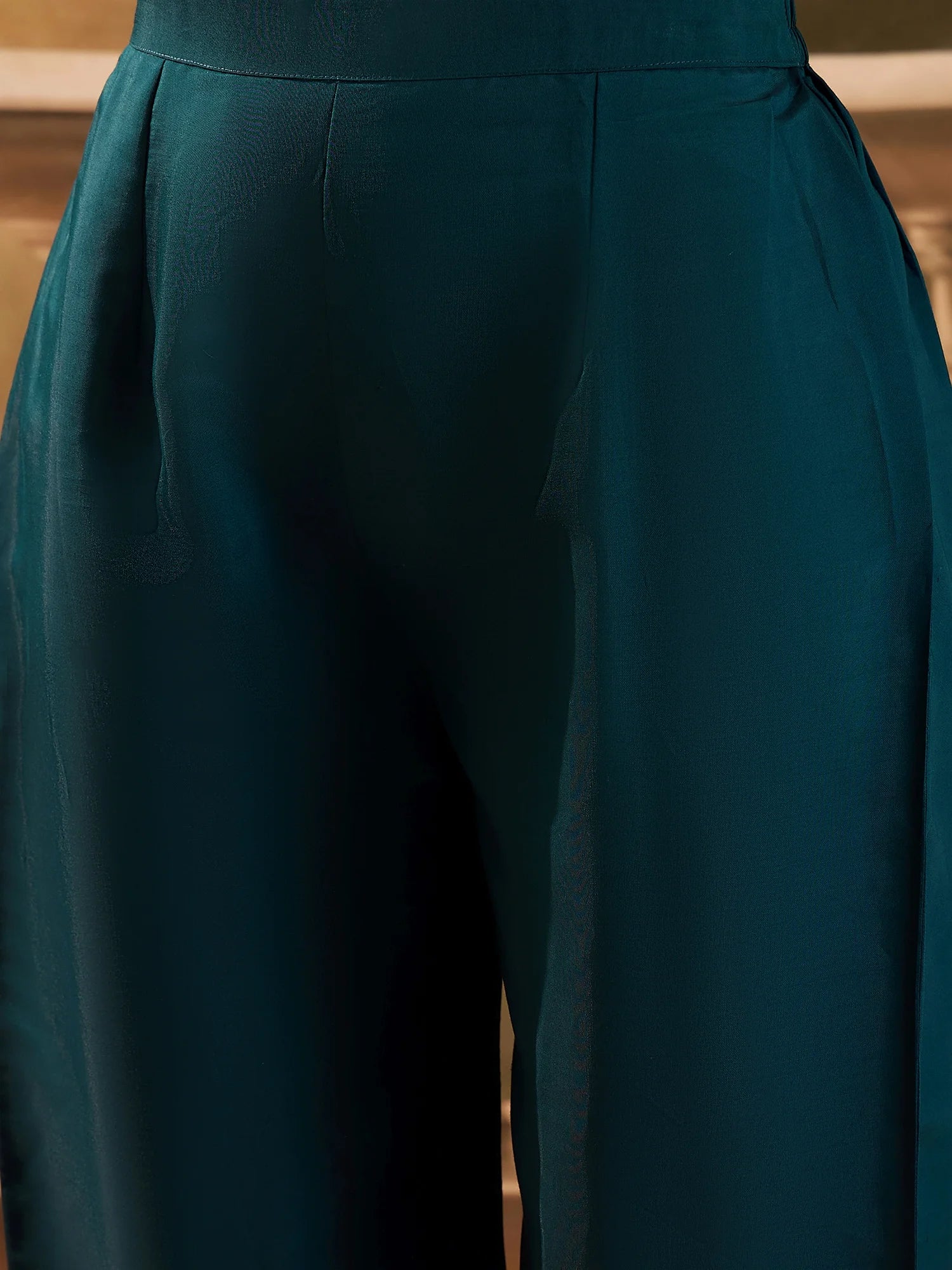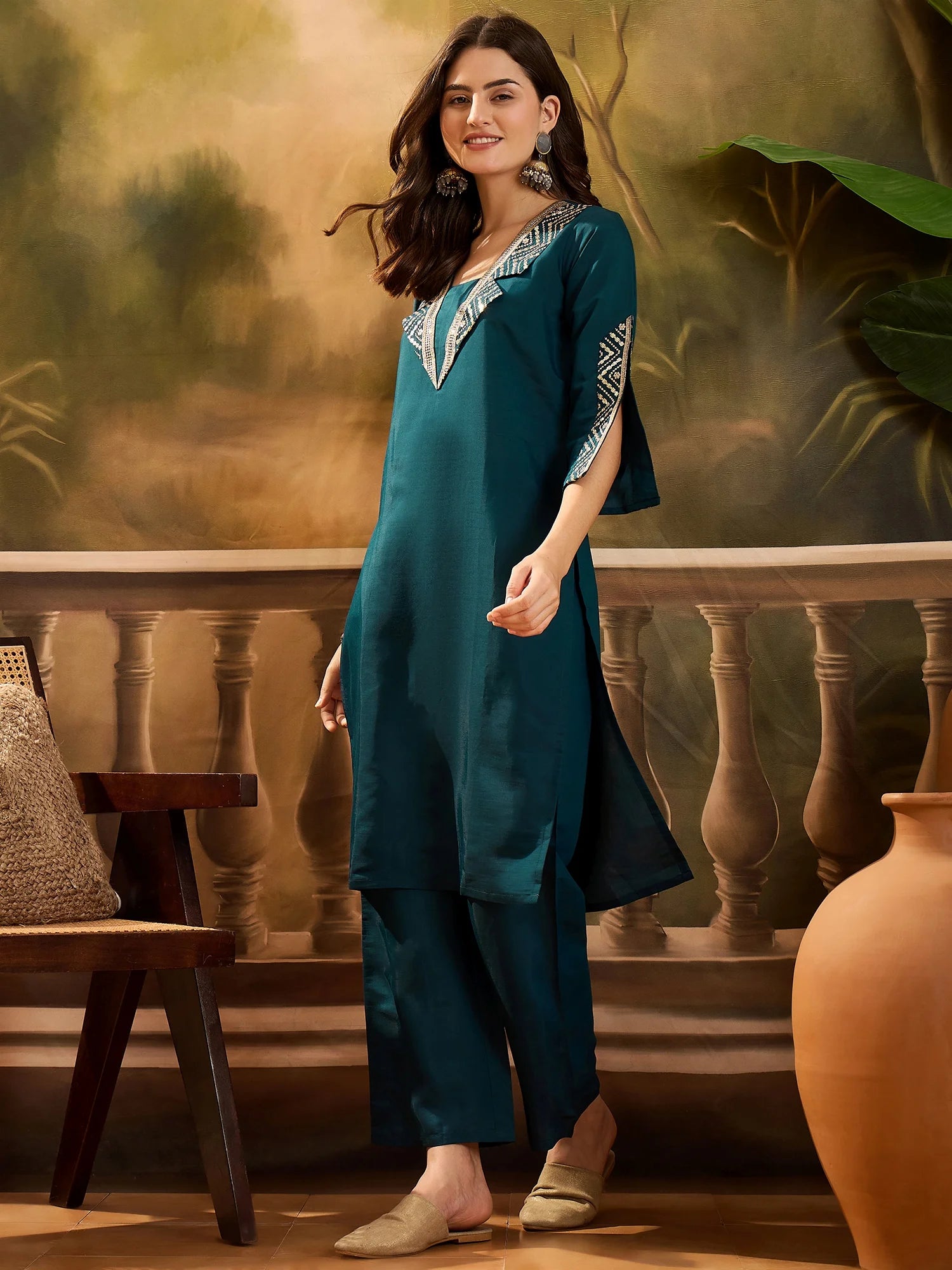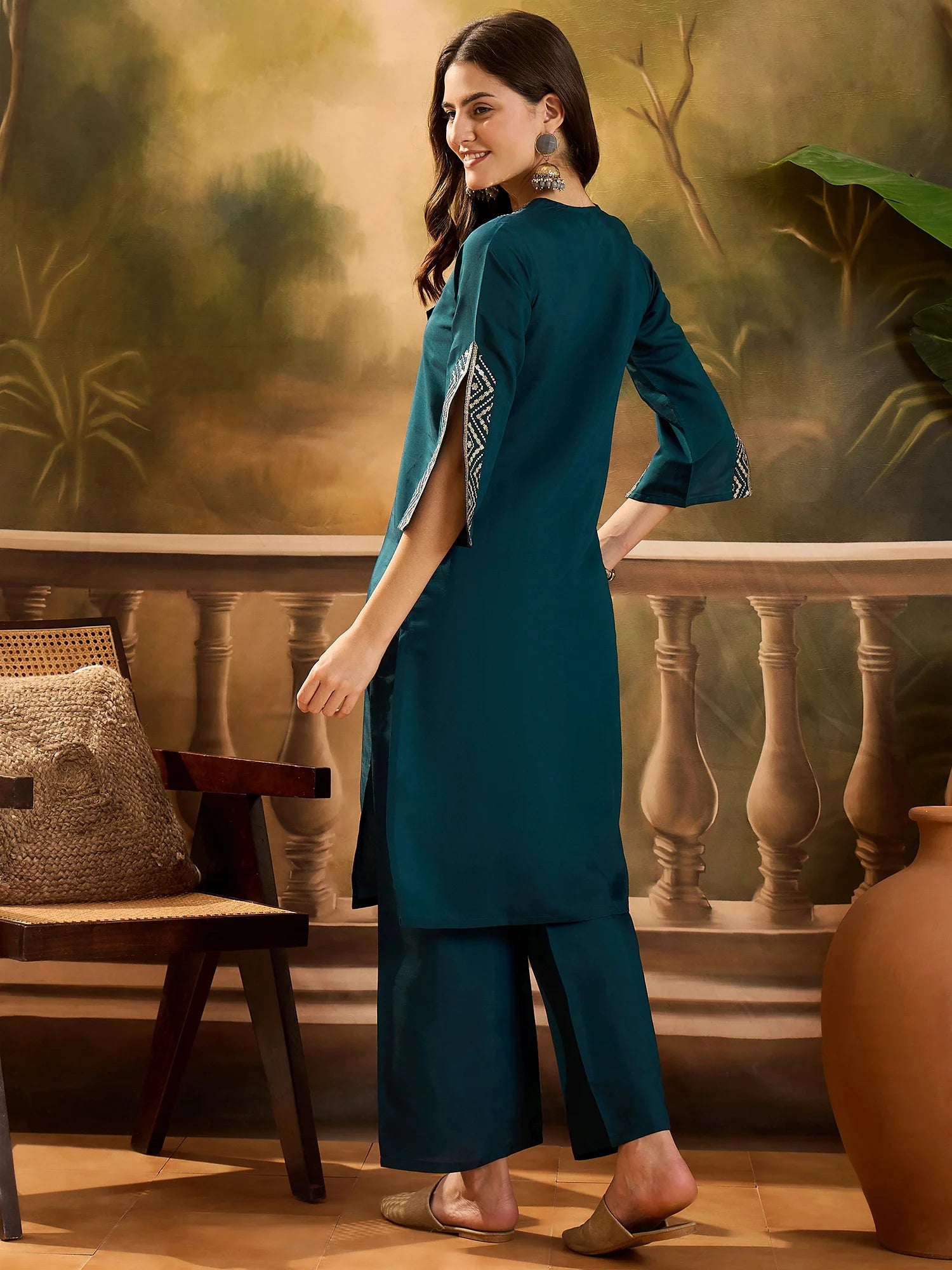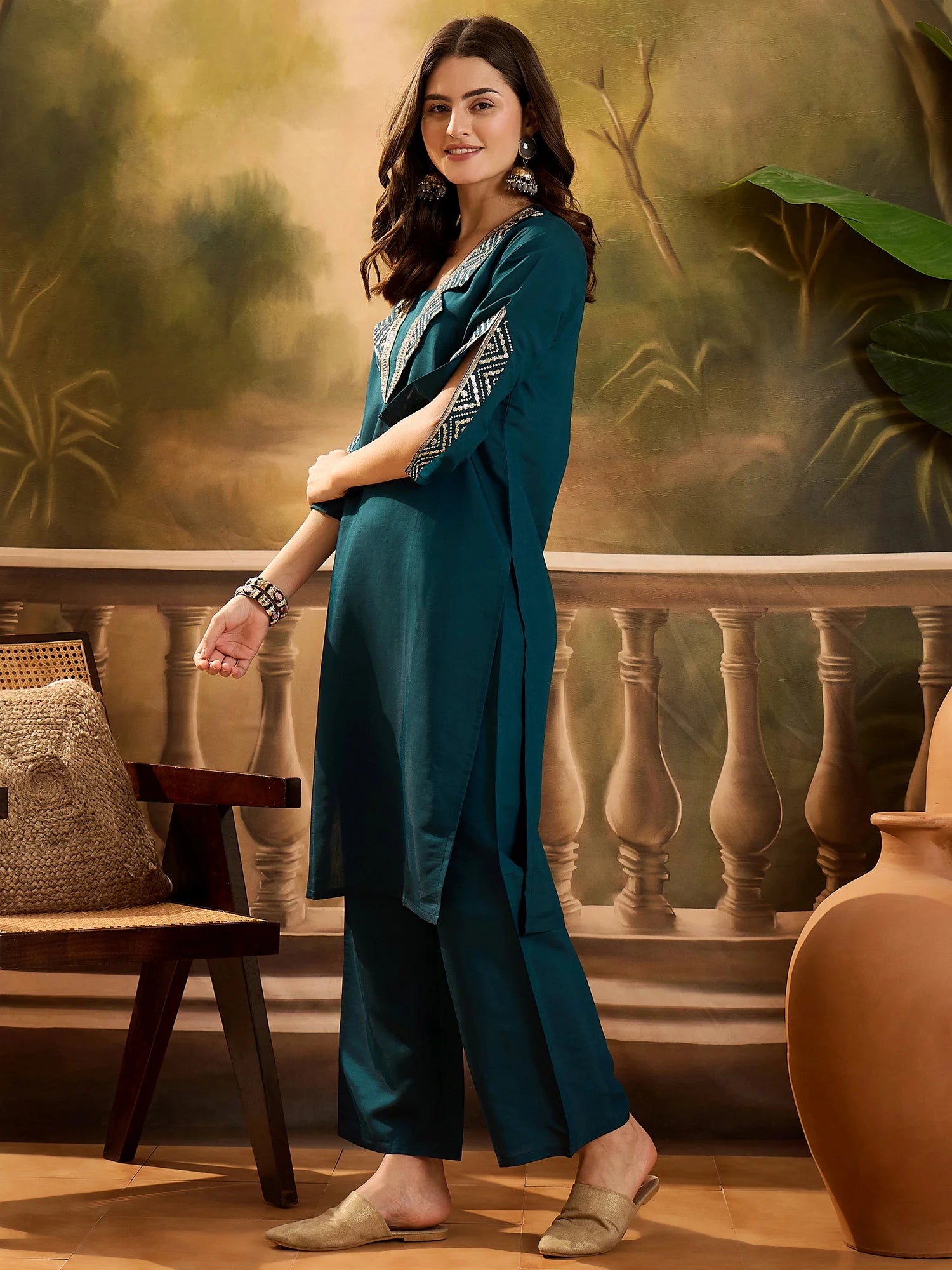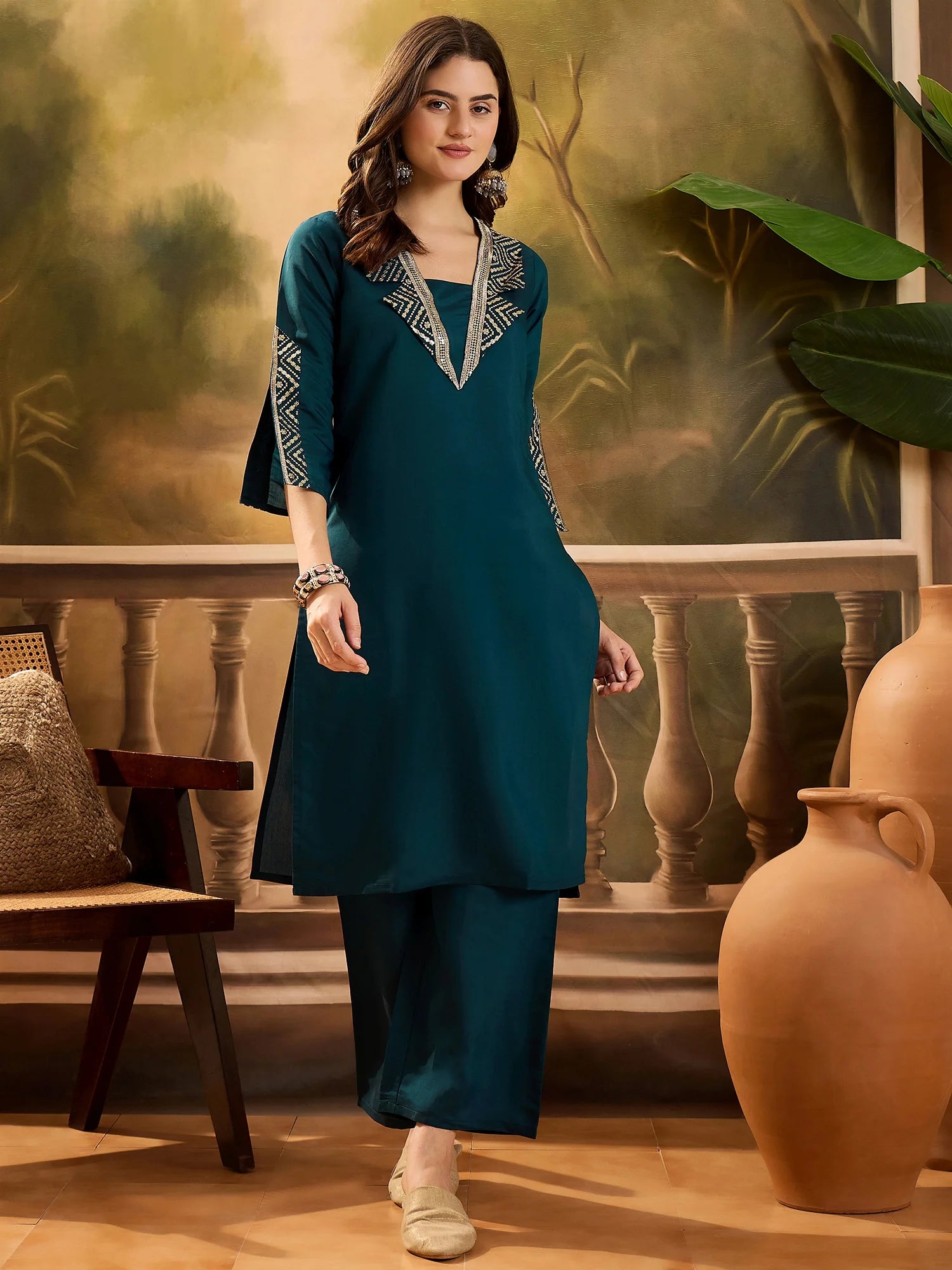 Refresh your ethnic collection with this elegant teal cotton blend kurta and palazzo set. Designed with intricate embroidery on the neckline and sleeves, this straight-cut kurta offers a classy yet comfortable look. Paired with matching palazzos, it’s perfect for festive occasions, family gatherings, or casual ethnic wear. Made from breathable fabric, this set ensures all-day comfort with effortless style.
