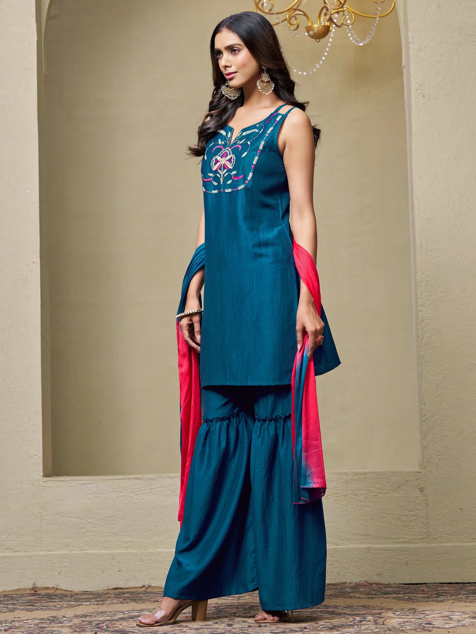 Teal Cotton Silk Embroidered Straight Kurta Sharara With Dupatta Set