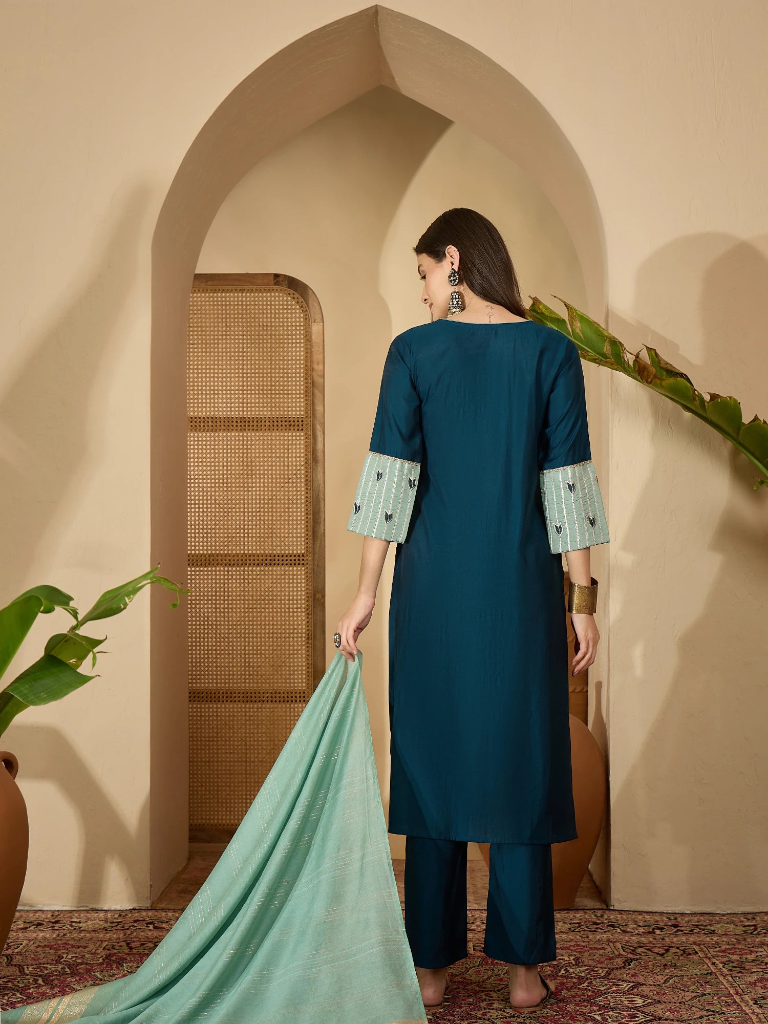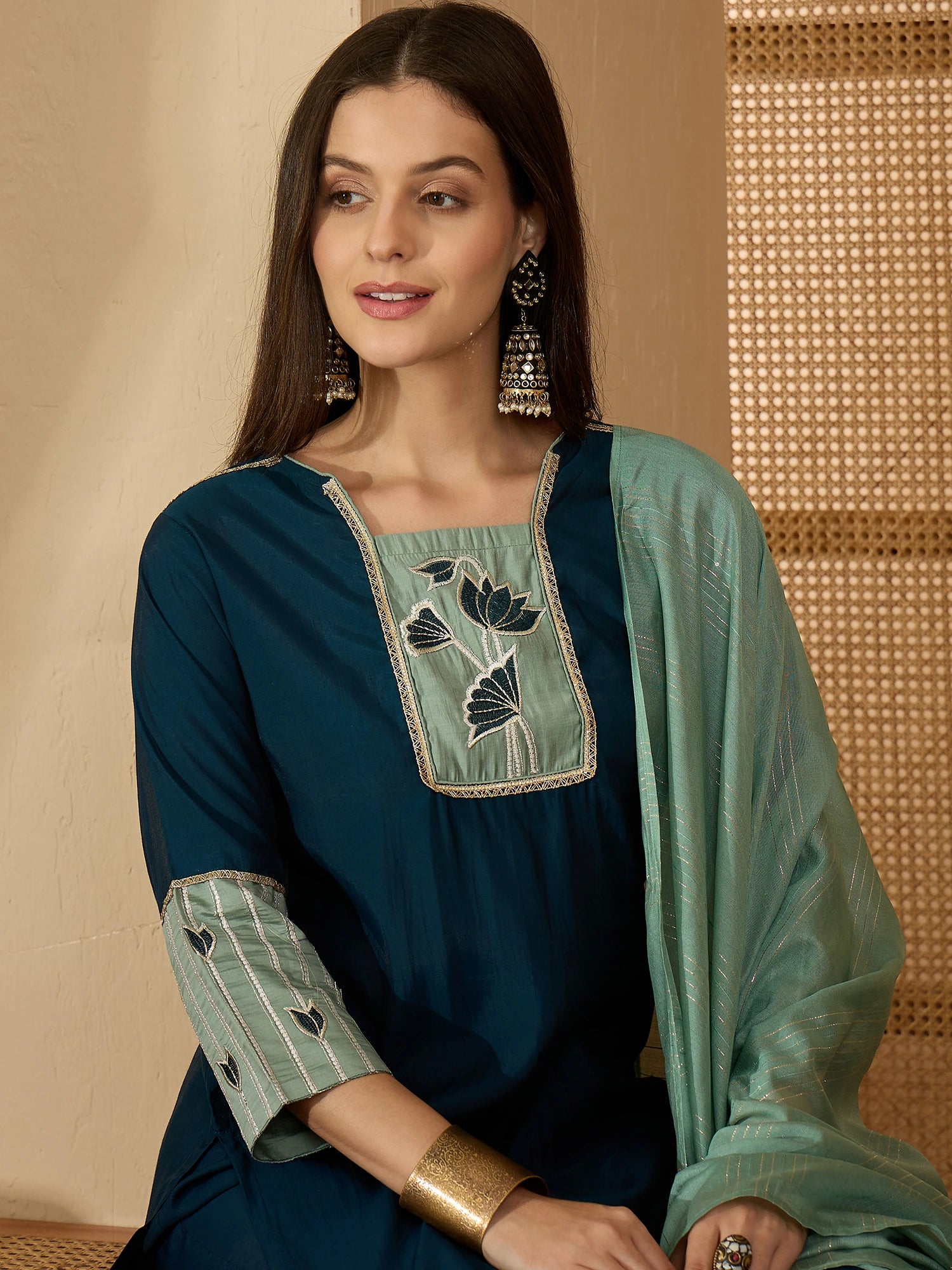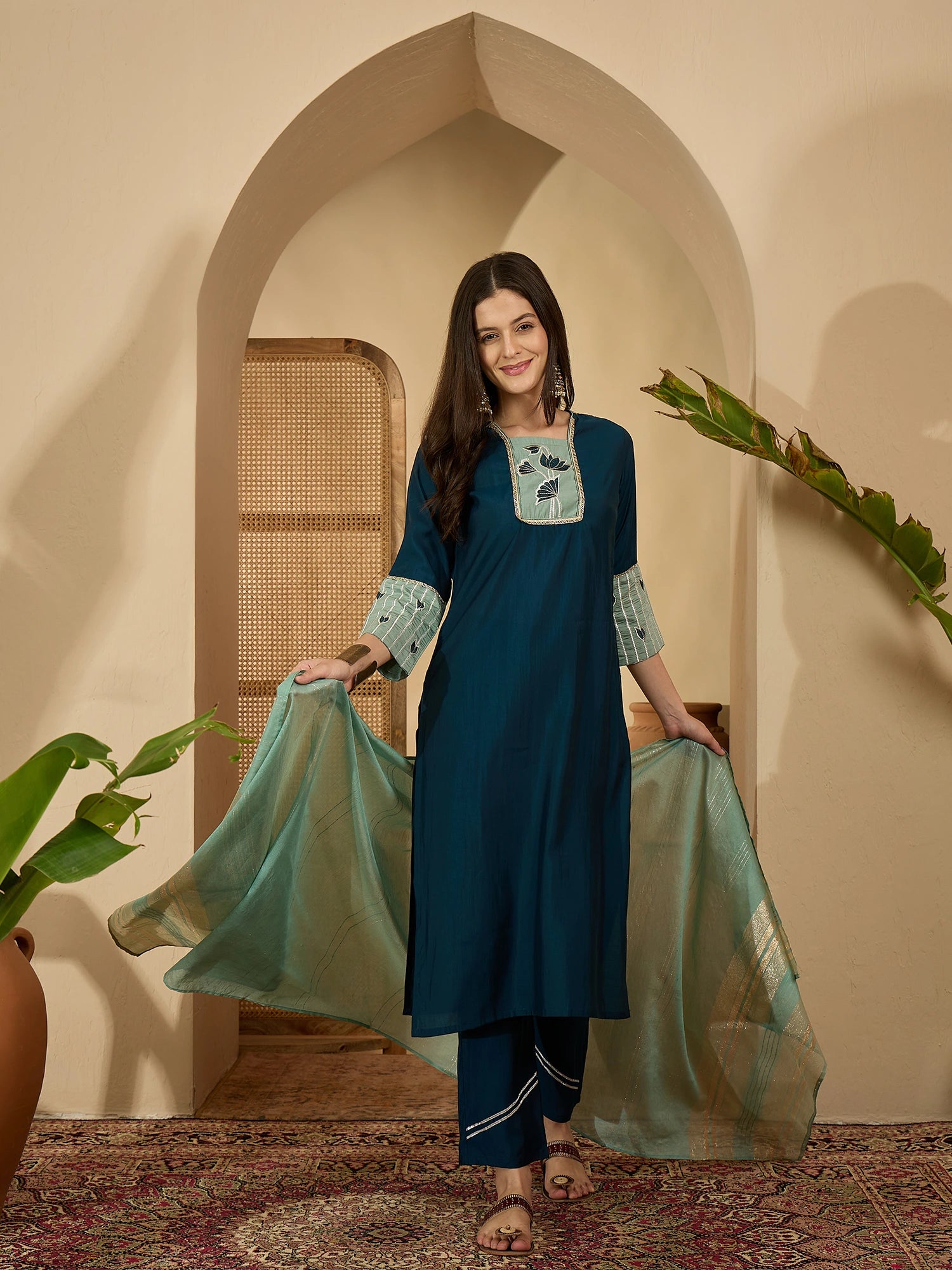 Teal Silk Blend Embroidered Straight Kurta Pant with Dupatta Set