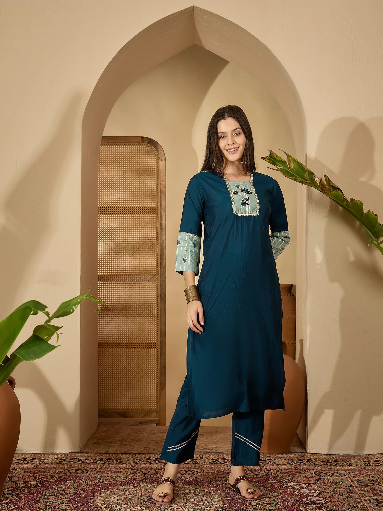 Brighten up your festival wardrobe with Youthnic's Teal Chanderi Cotton Kurta Pant With Woven Chanderi Dupatta Set,This Kurta Set is perfect for festival wear, adding a fresh and trendy vibe to your festival and wedding style. The lightweight Chanderi fabric and relaxed fit ensure all-day comfort.Pair it and create your own effortless look, embracing the best of modern ethnic fashion.