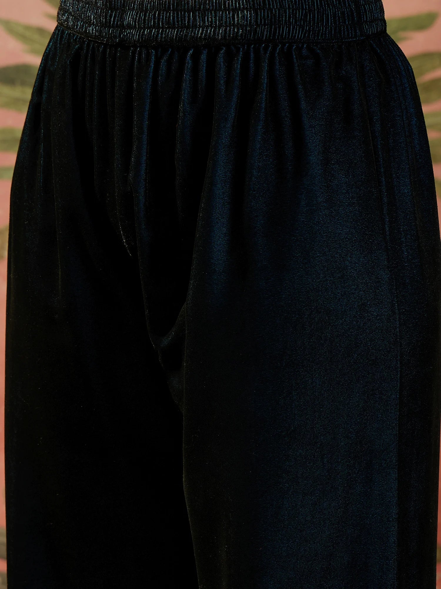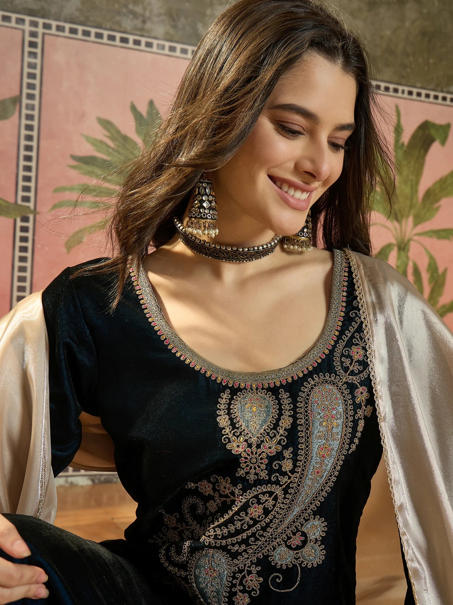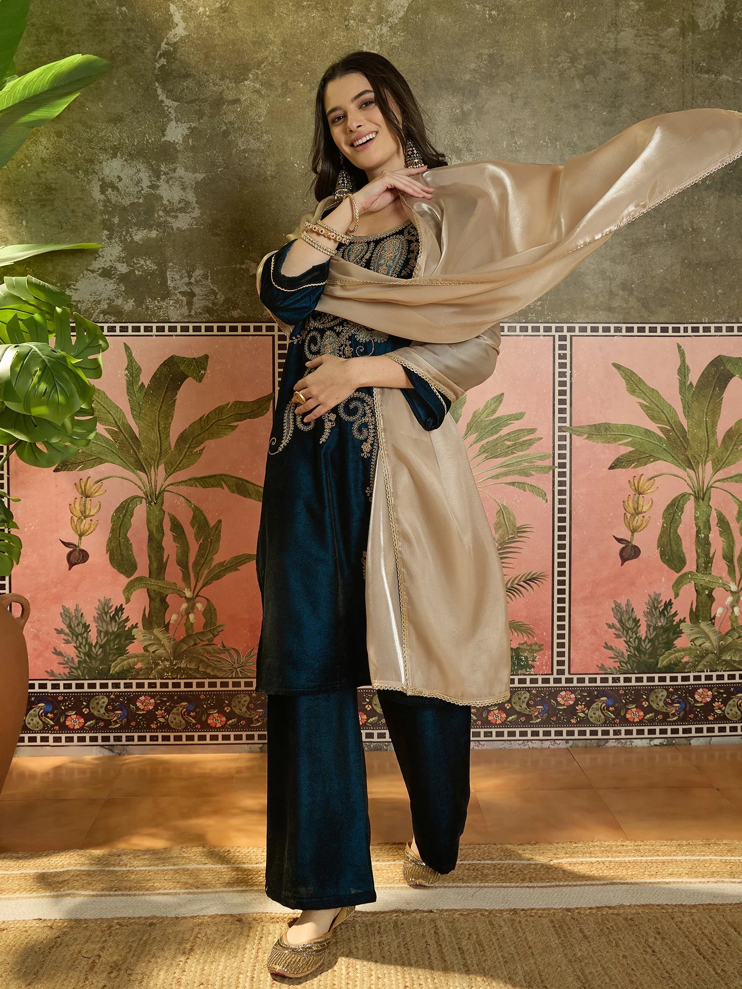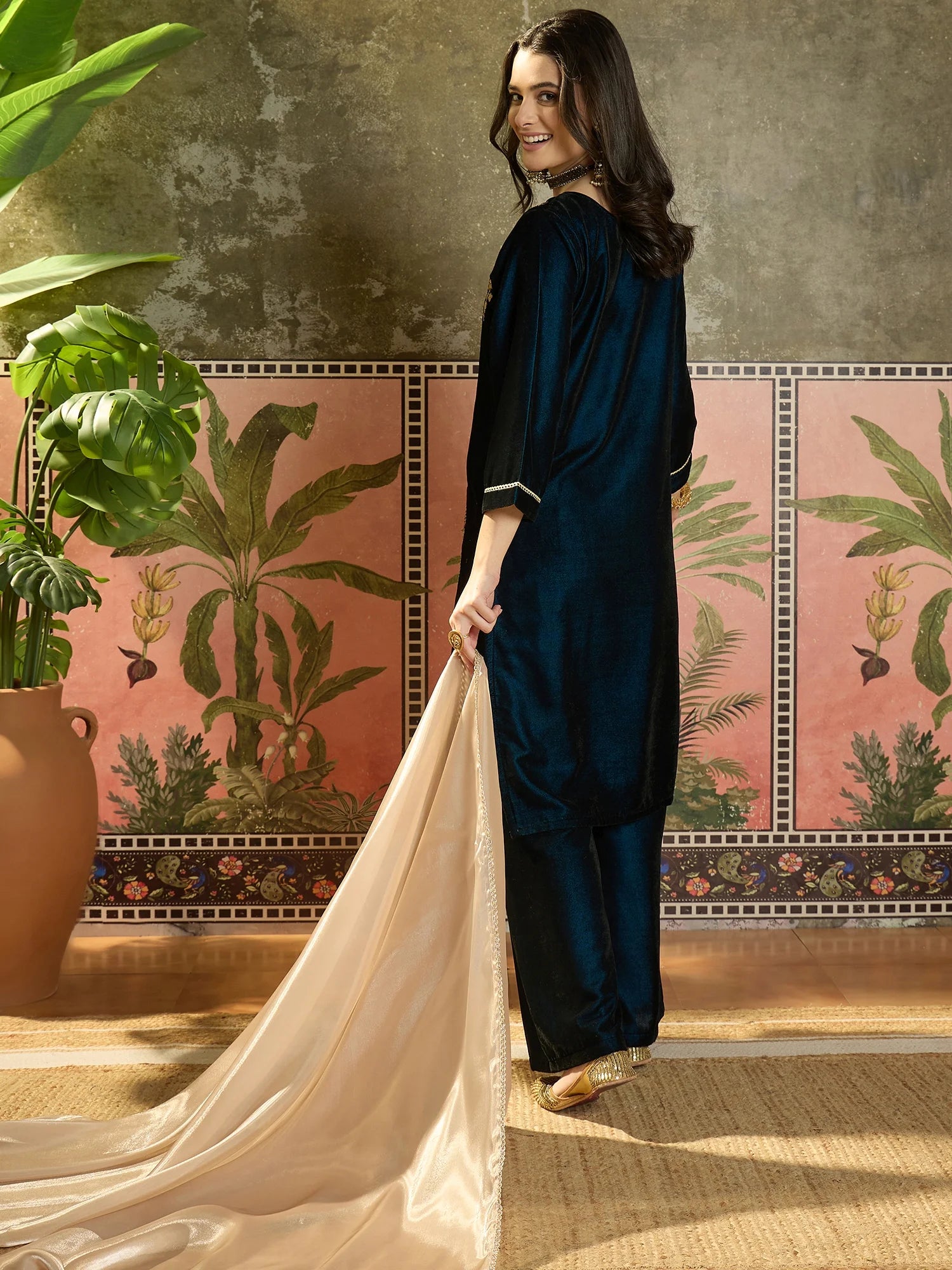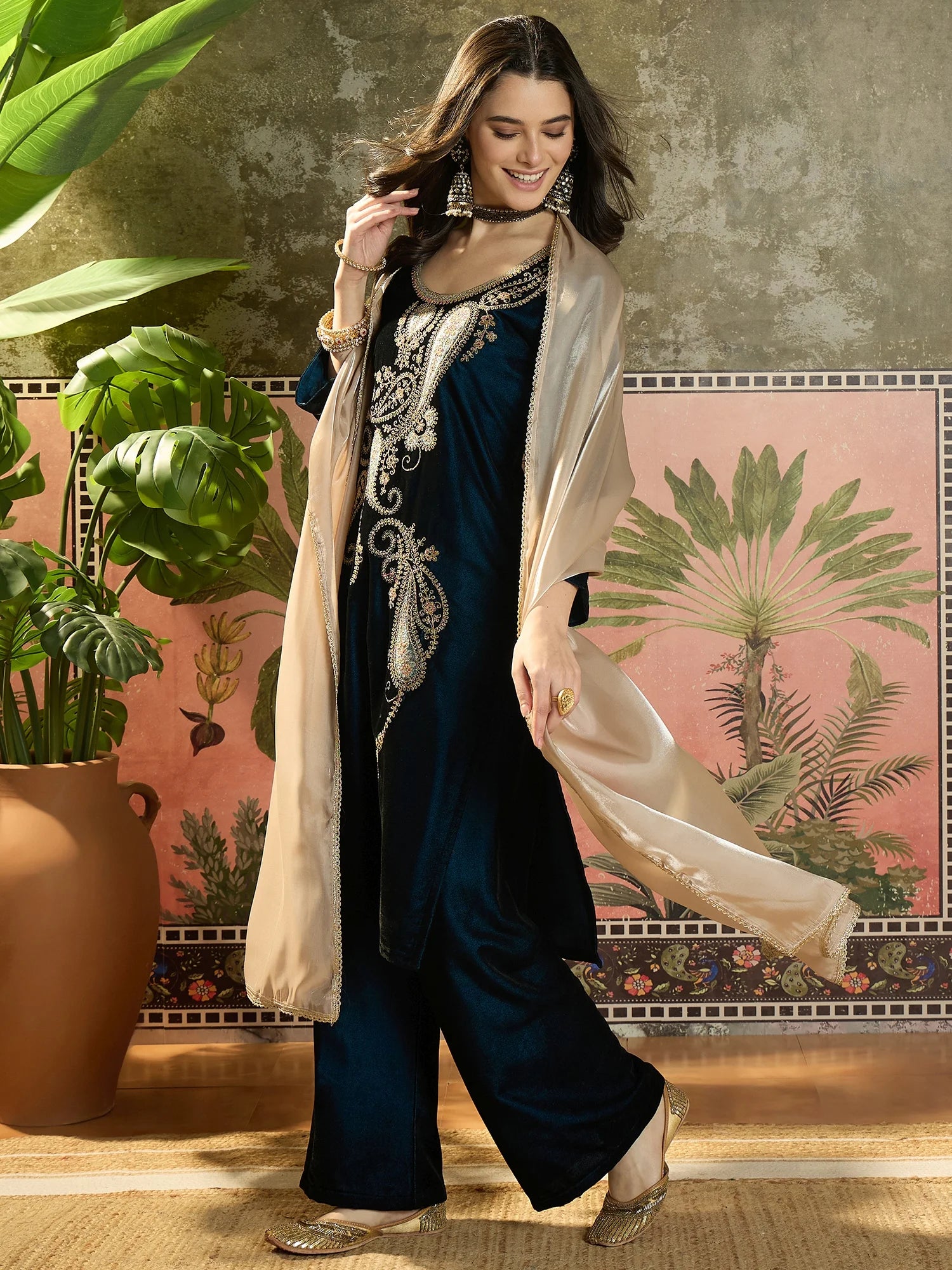 Teal Velvet Embroidered Straight kurta palazzo with Dupatta Set
