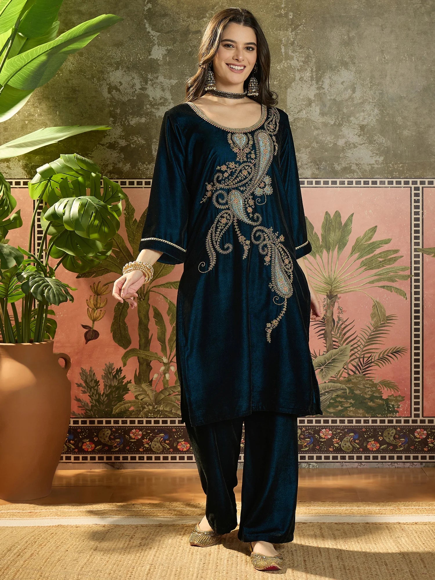 Elevate your winter wardrobe with this elegant teal velvet embroidered kurta set, designed for both comfort and festive charm. The rich velvet fabric gives the outfit a luxurious feel, while the detailed golden and blue thread embroidery adds a touch of traditional sophistication.