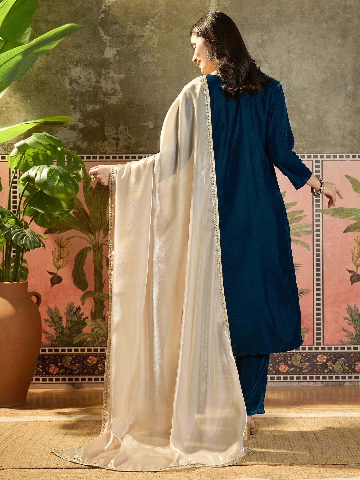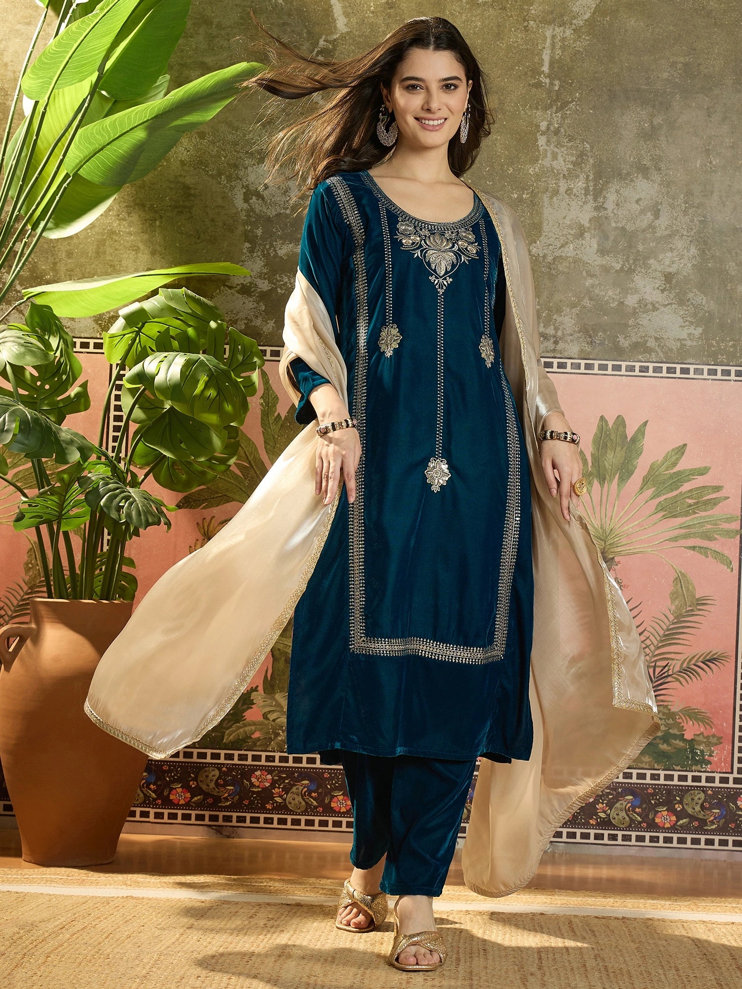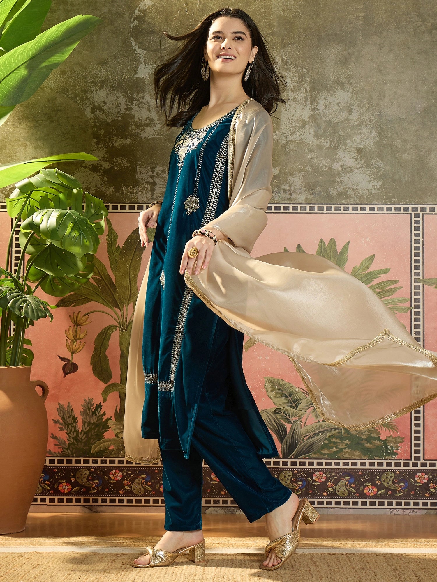 Teal Velvet Embroidery Straight Kurta Pant With Dupatta Set