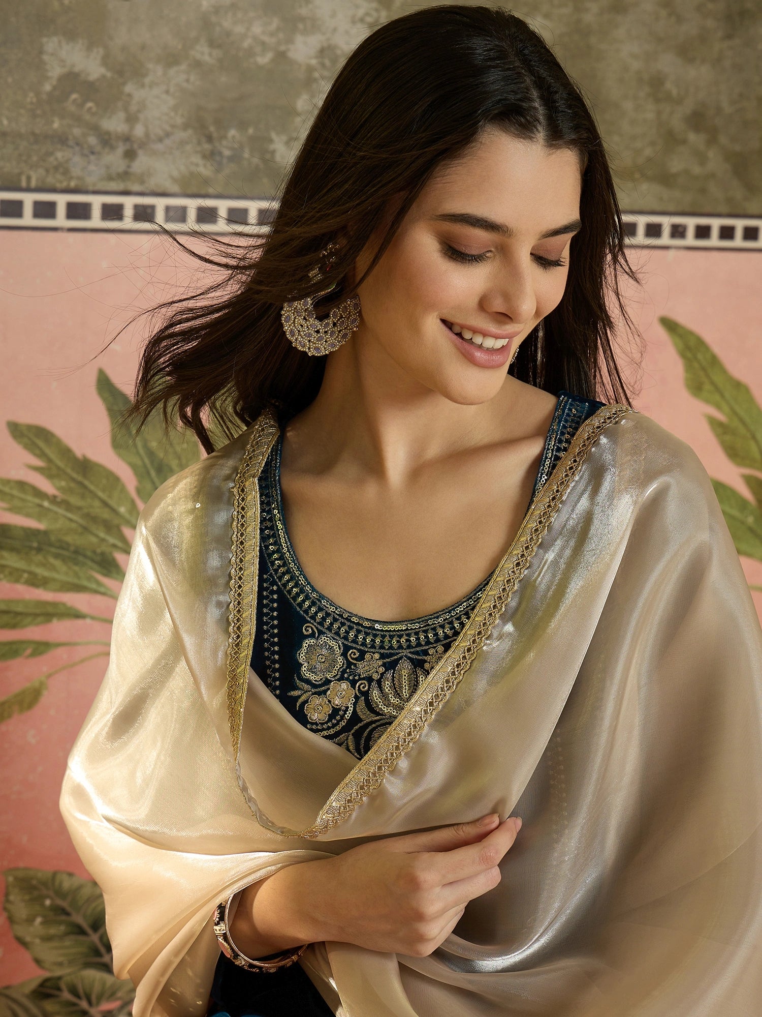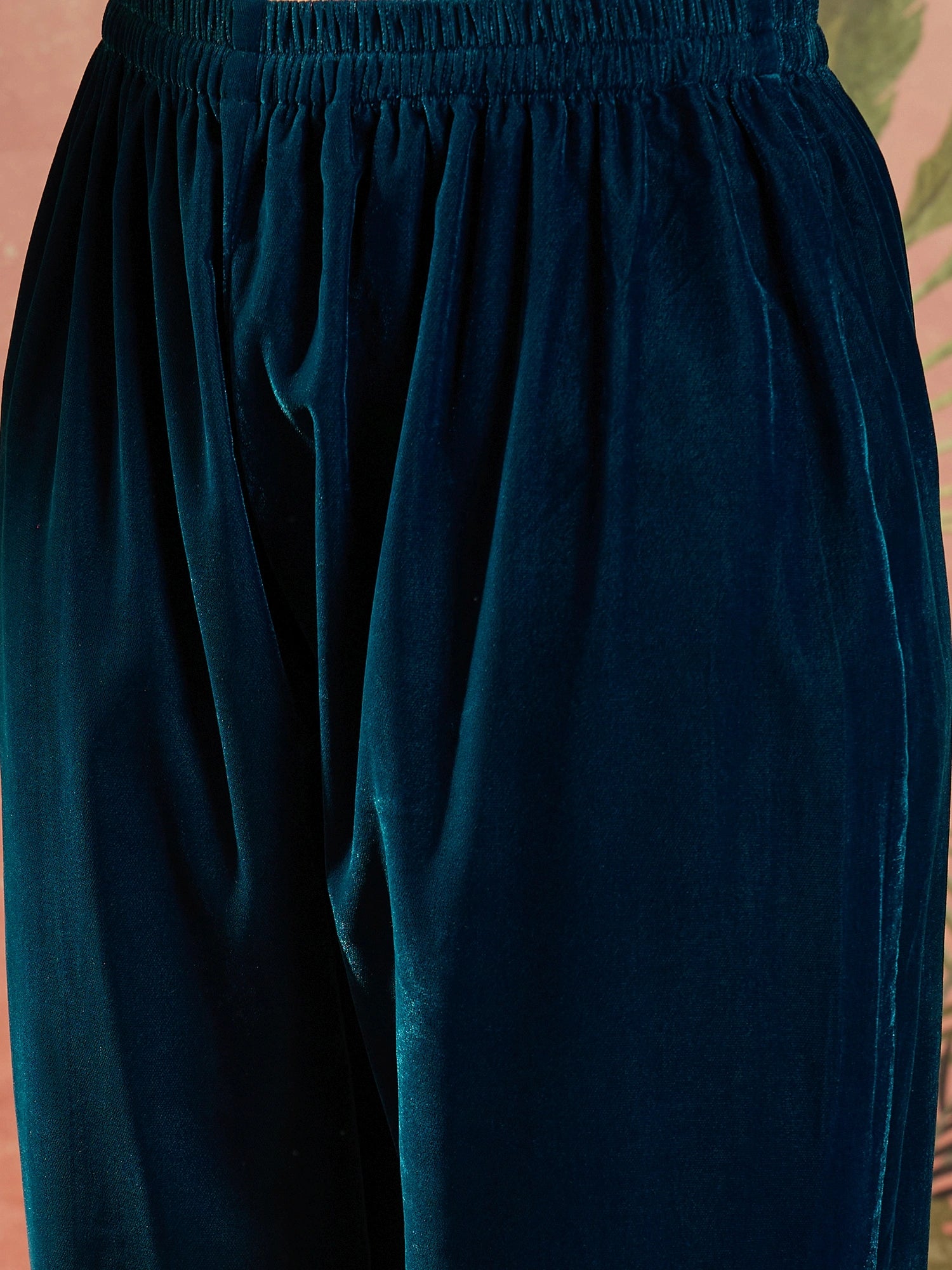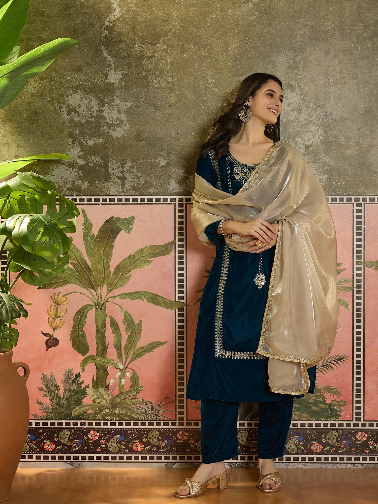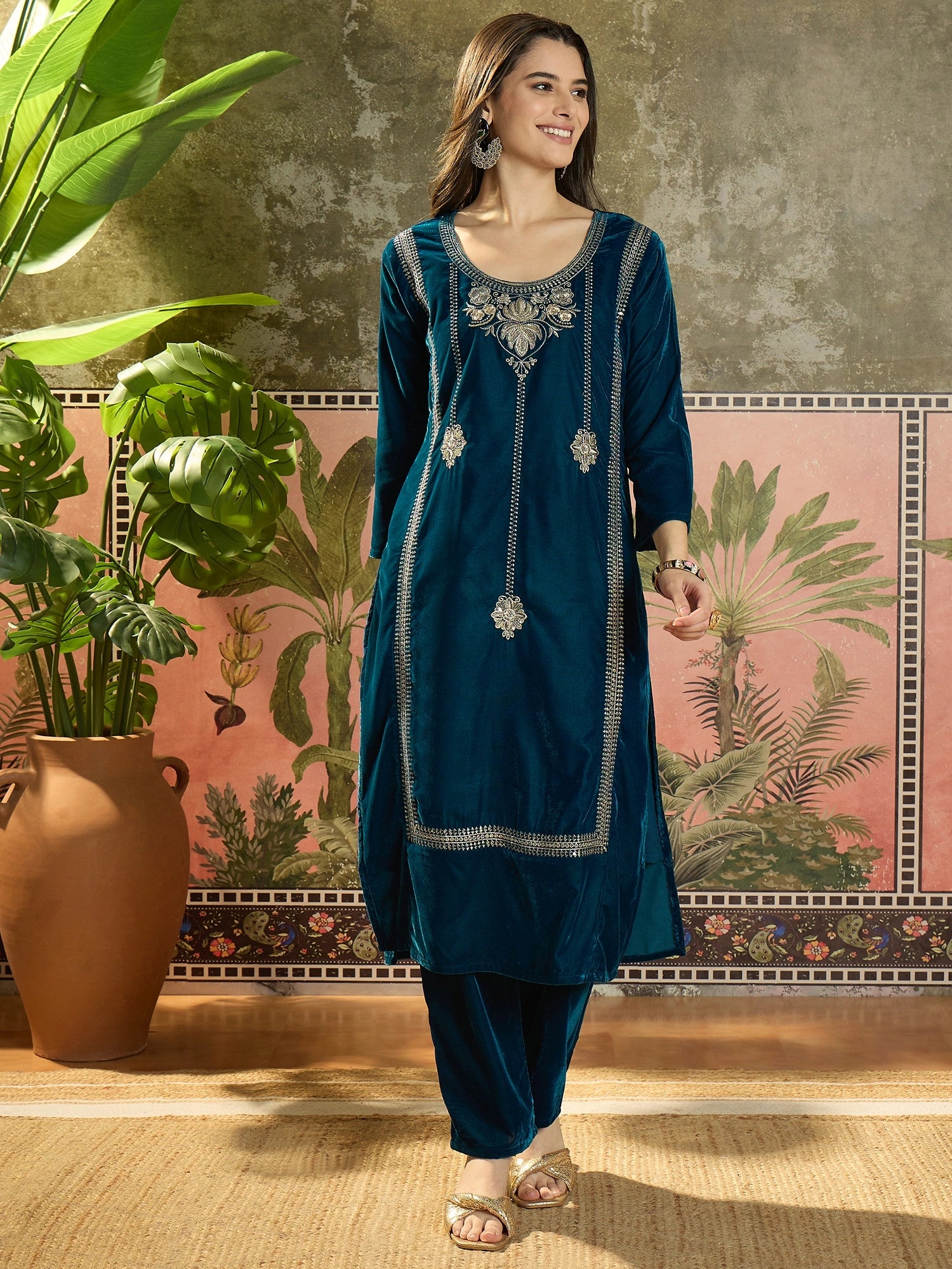 Teal Velvet Embroidery Straight Kurta Pant With Dupatta Set