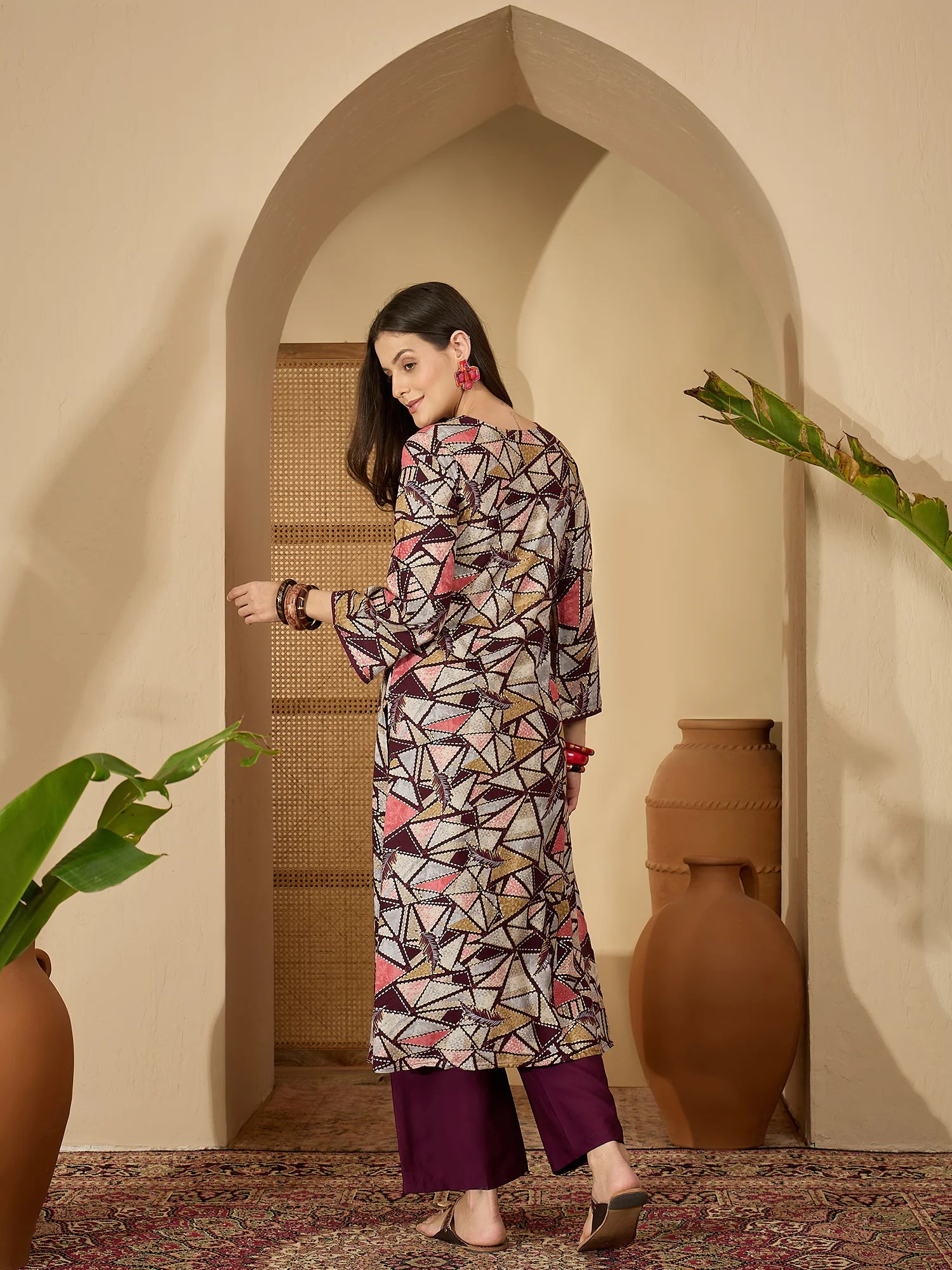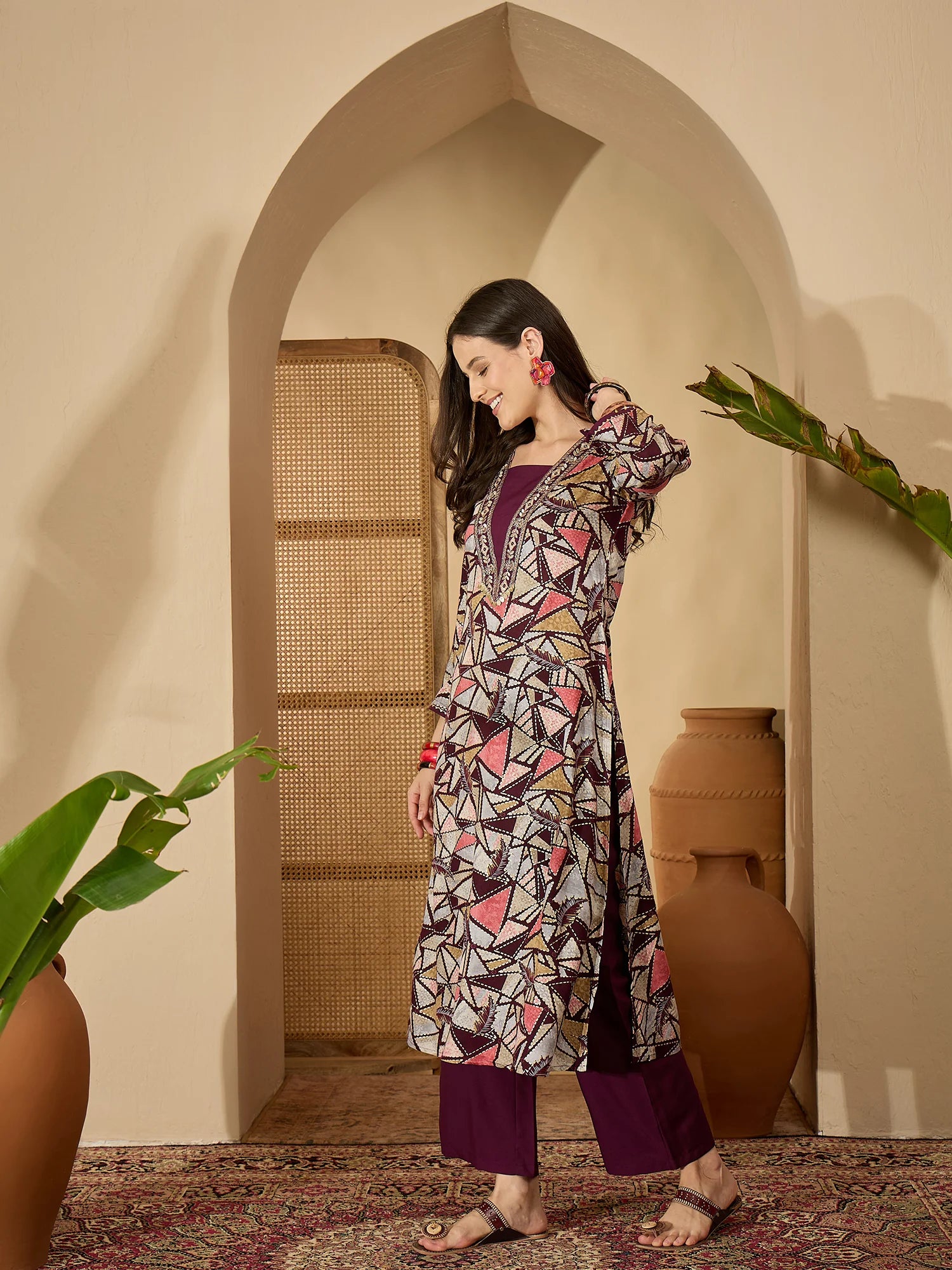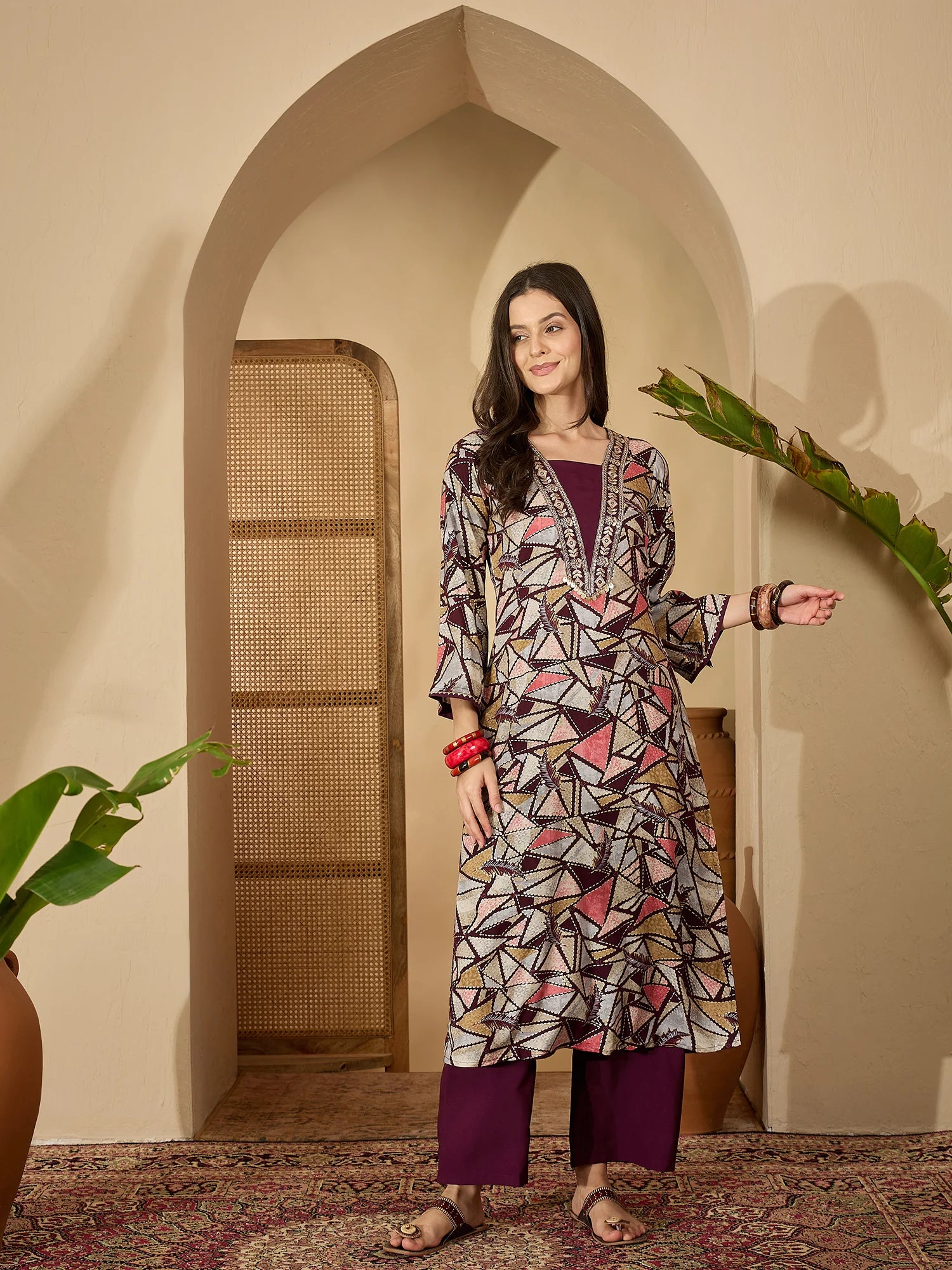 Wine Rayon Abstract Print & Embroidered A-line Bell Sleeves Long Kurta