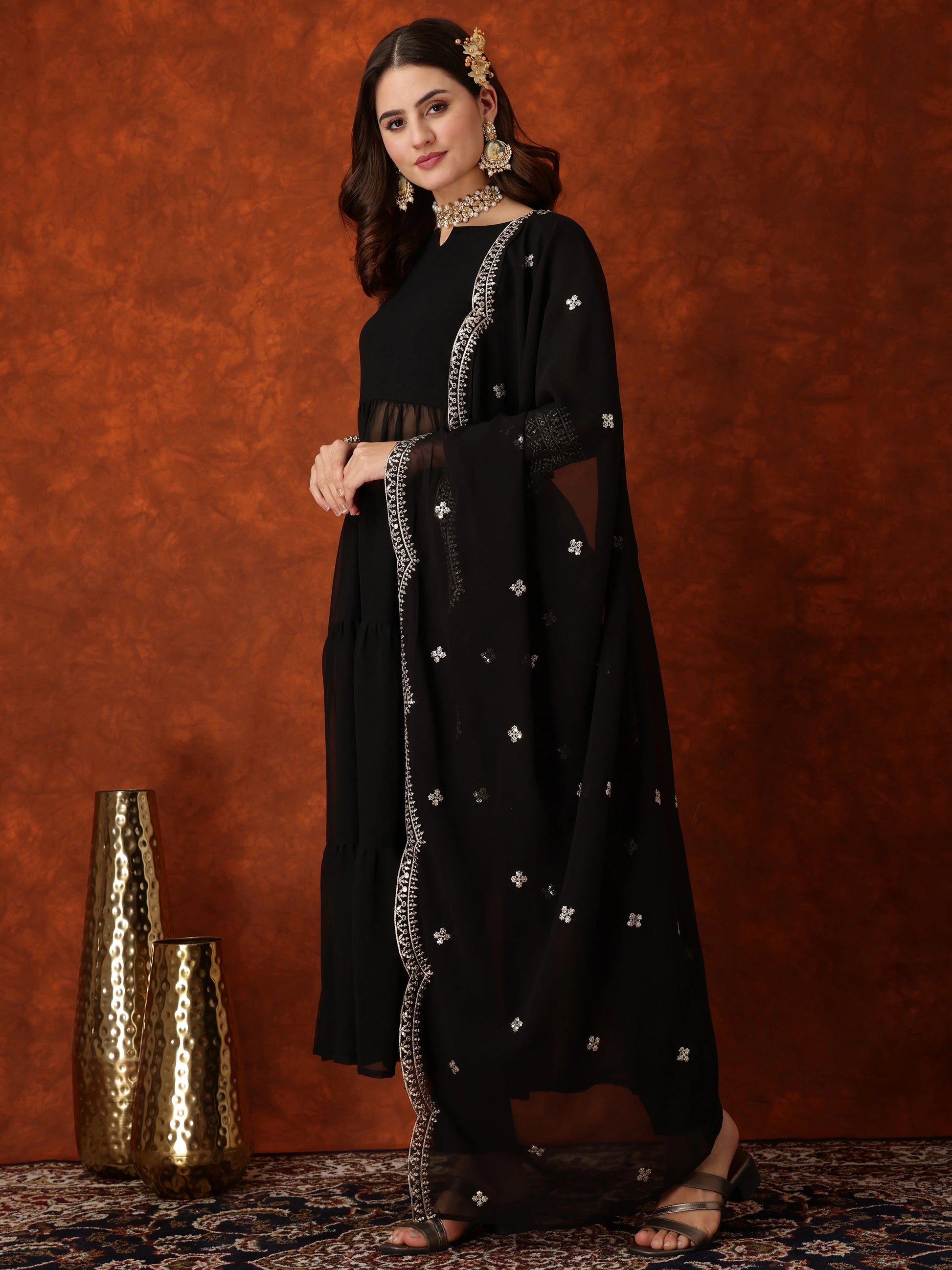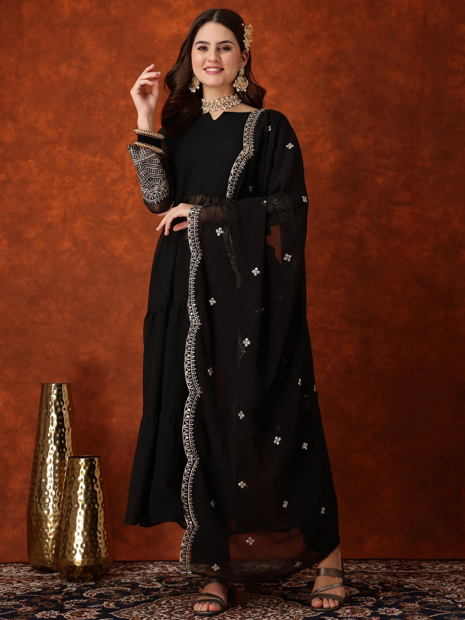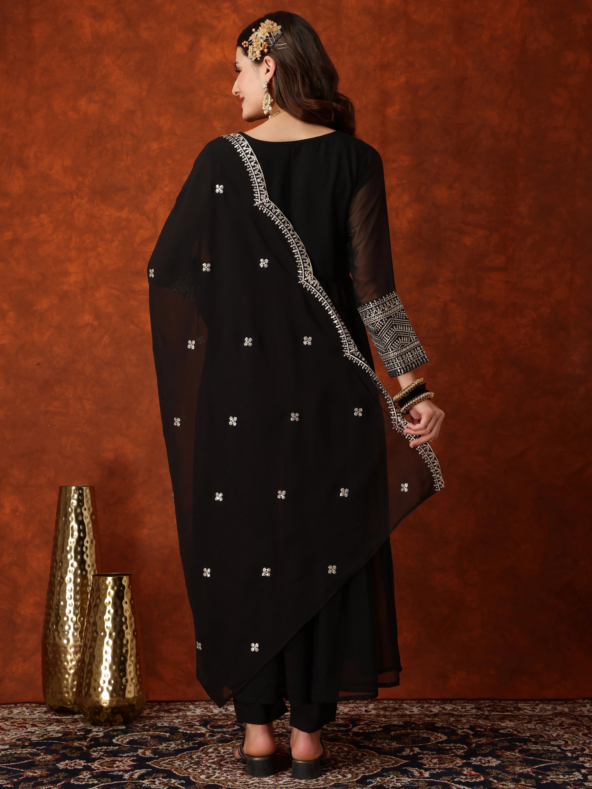 Black Georgette Embroidered Anarkali Kurta Pant with Dupatta Set