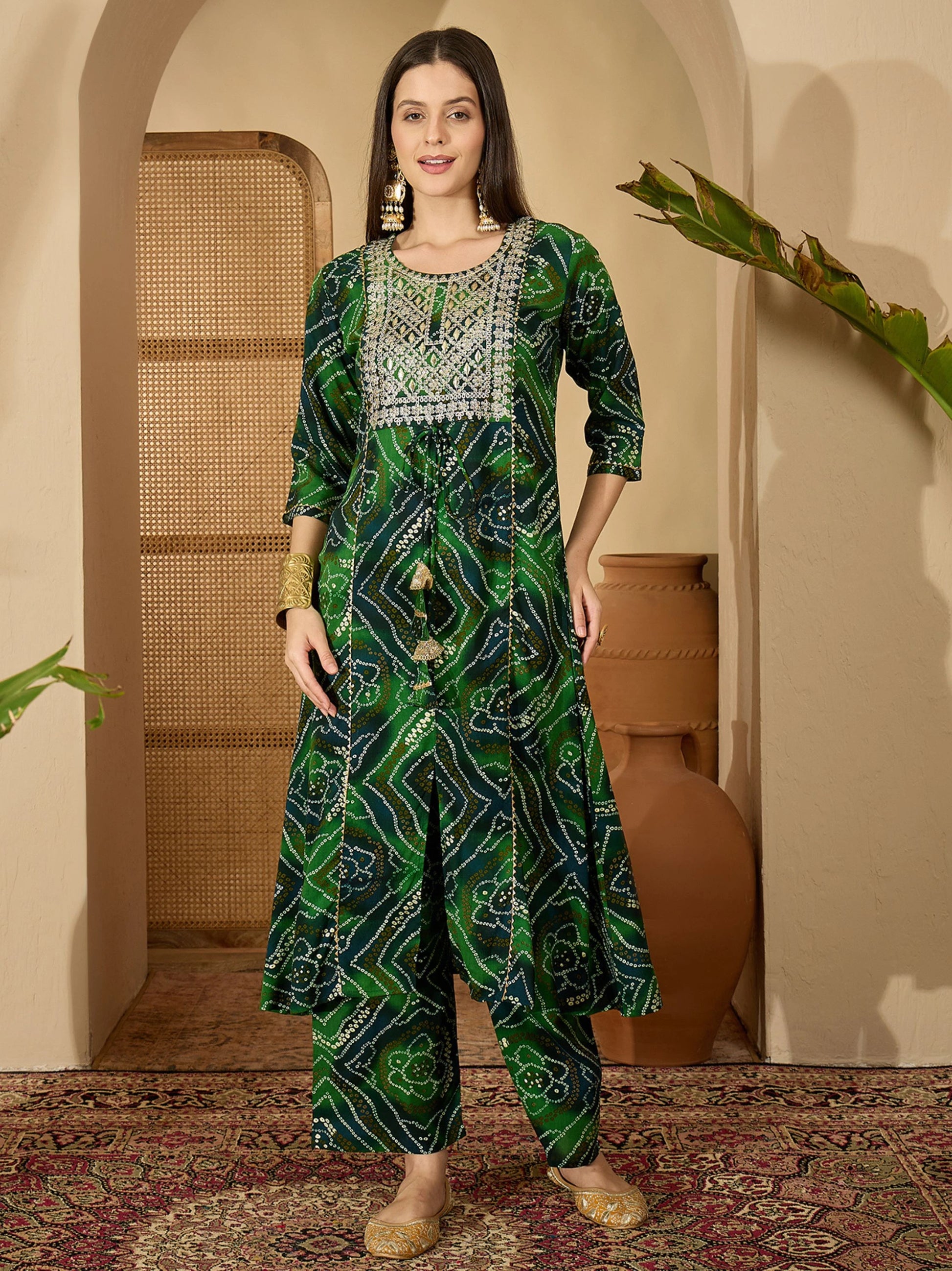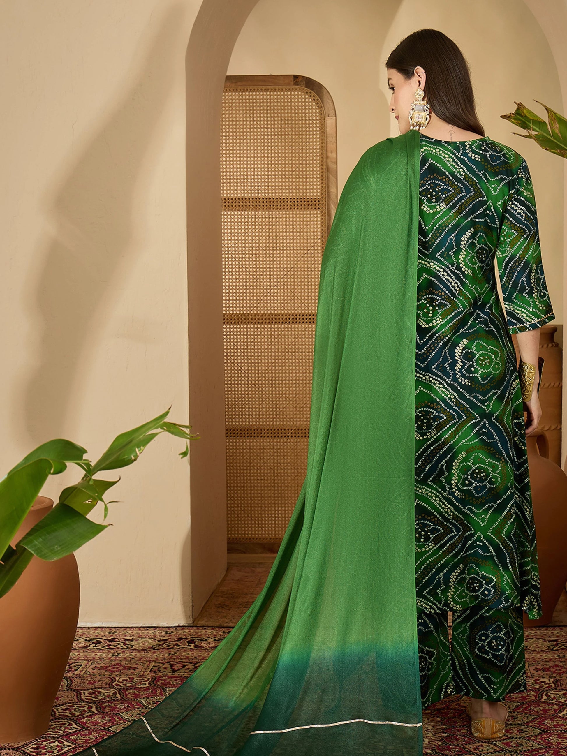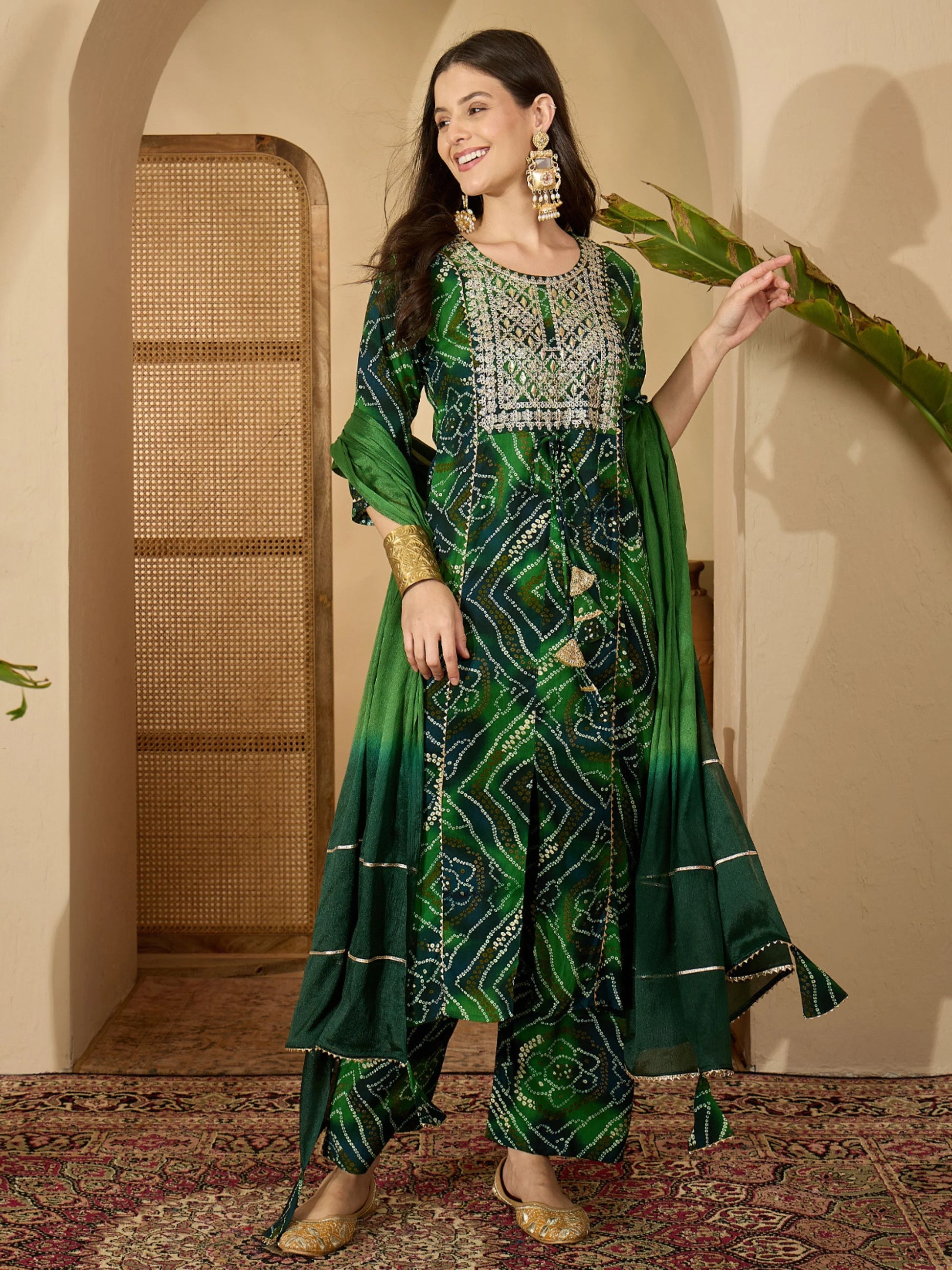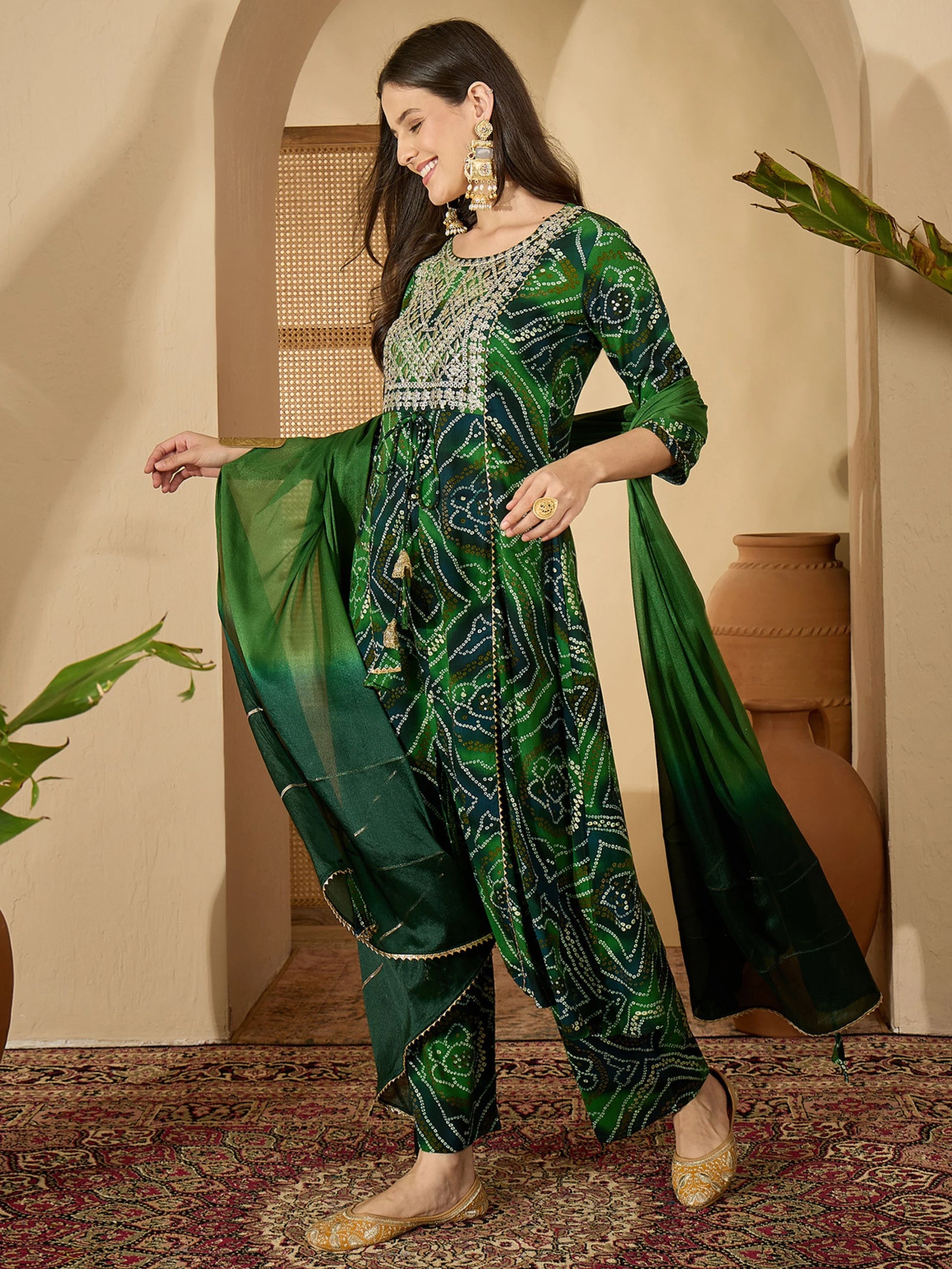 Green Pure Viscose Yoke Embroidery Bandhani Print Kurta Palazzo and Dupatta Set