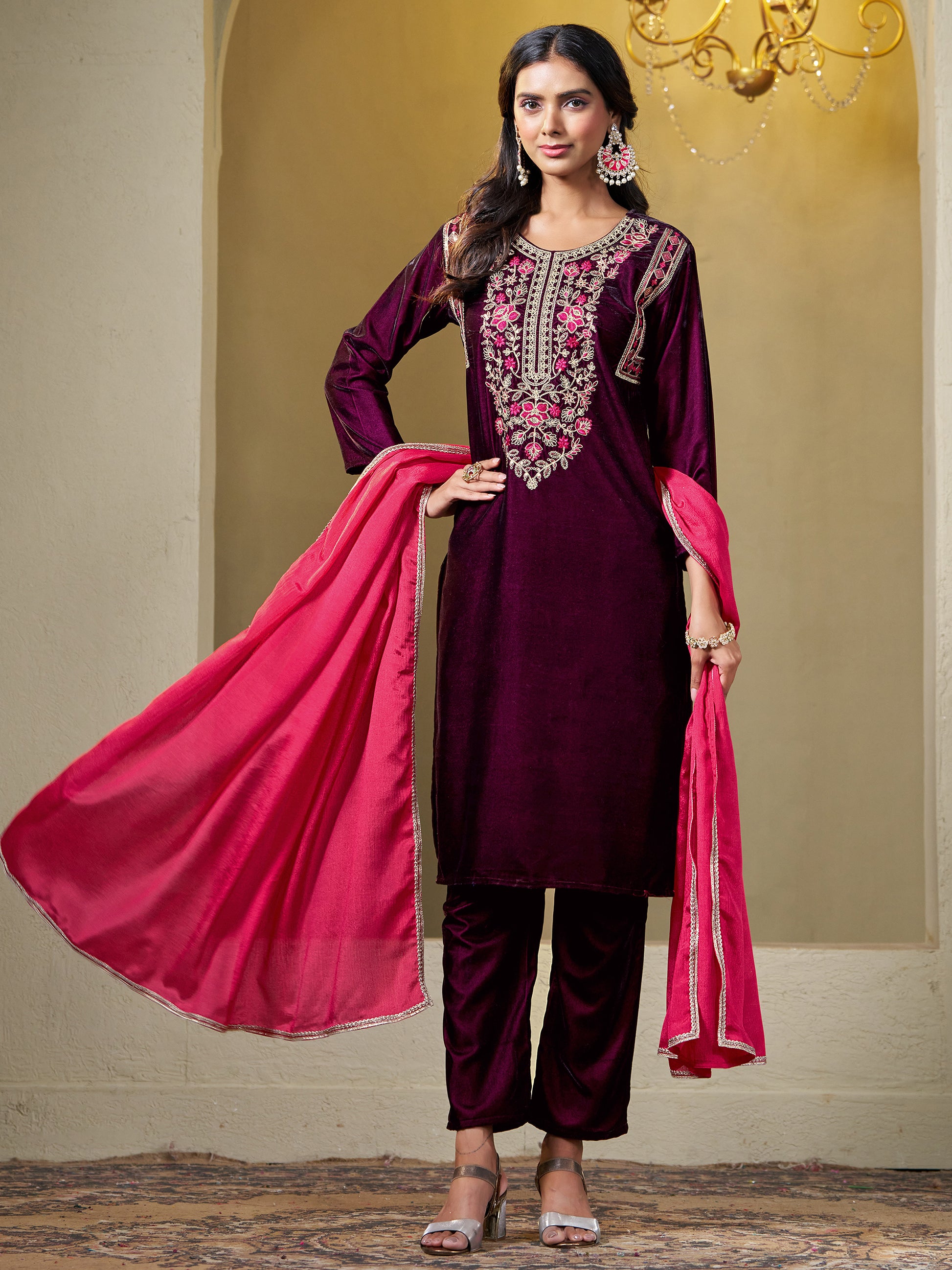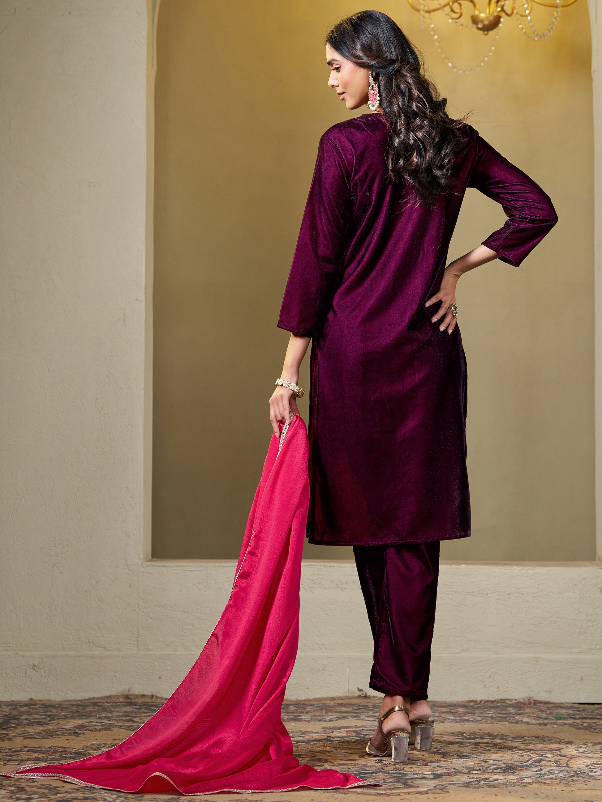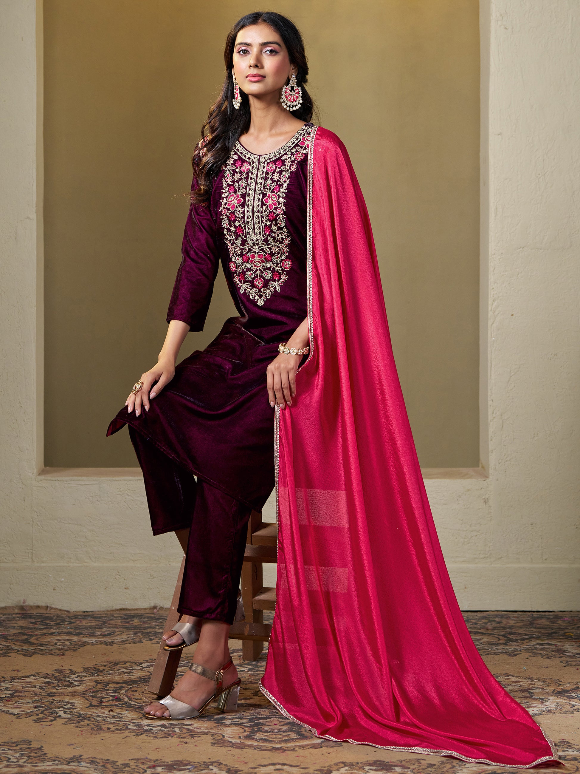Wine Velvet Yoke Embroidery Straight Kurta Pant With Dupatta Set