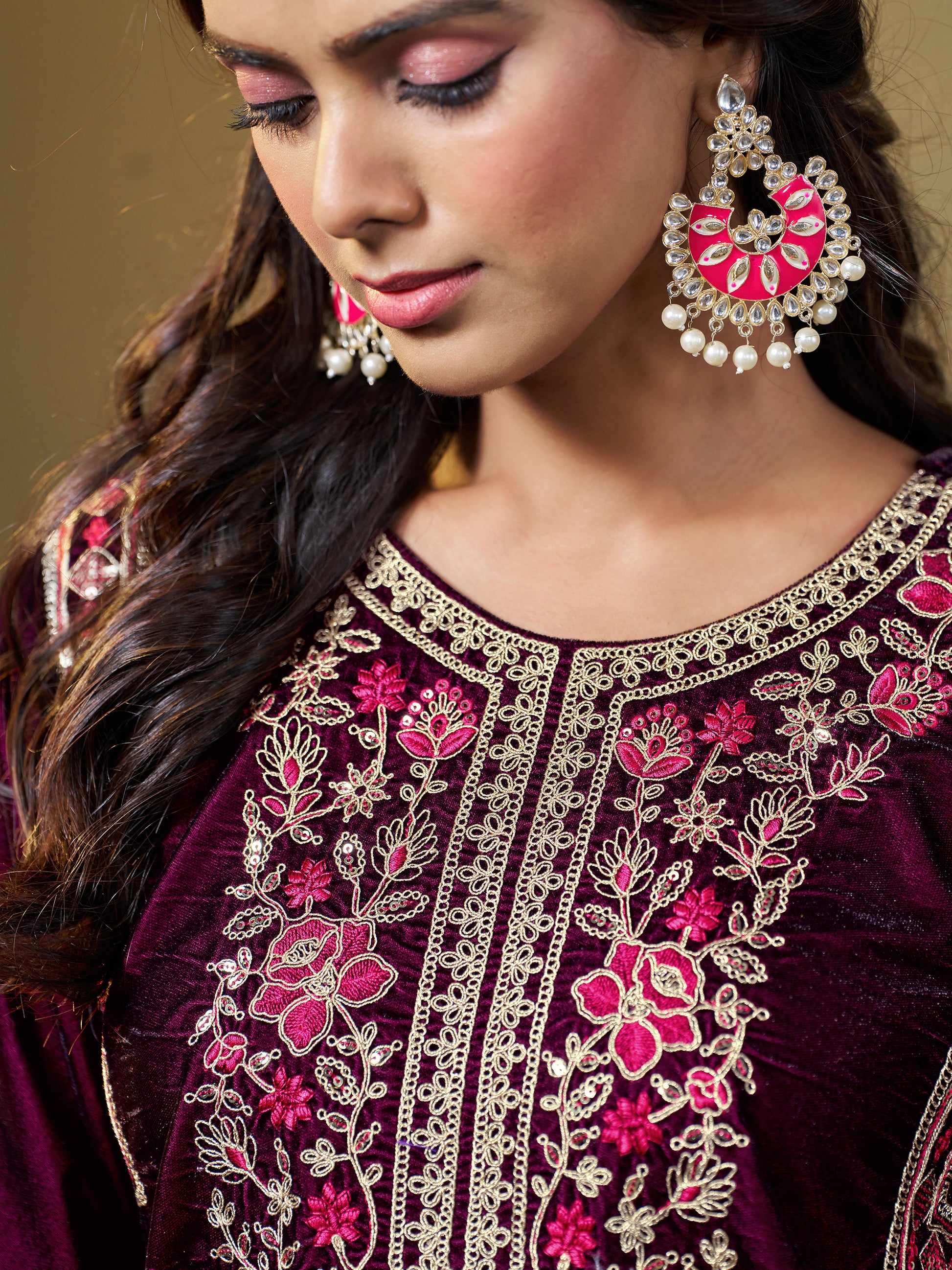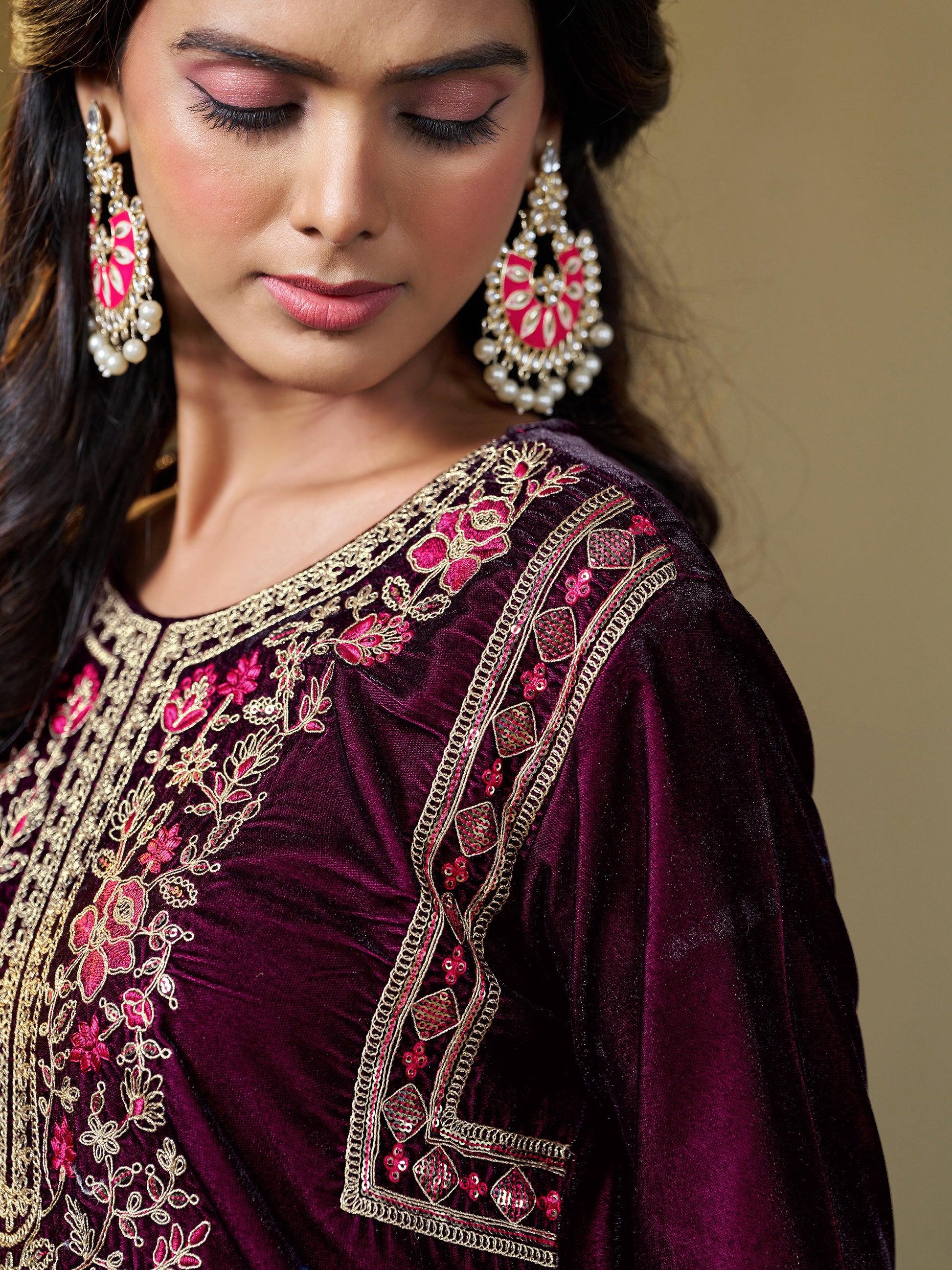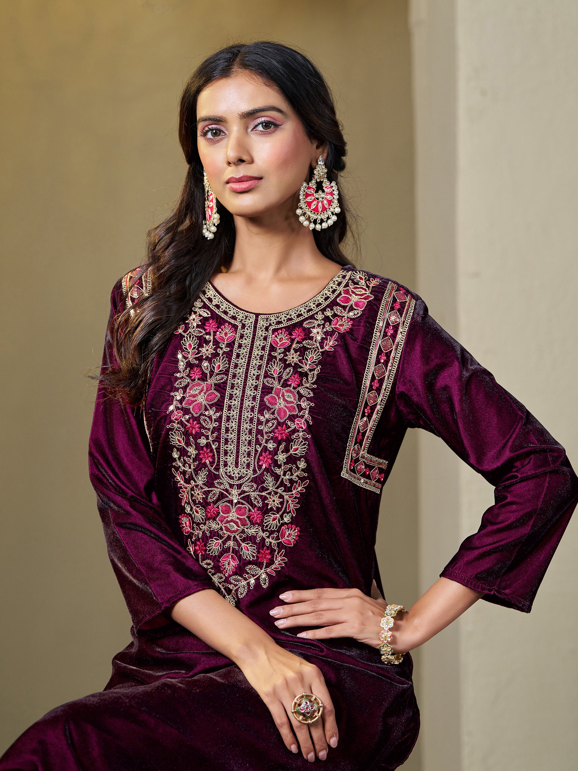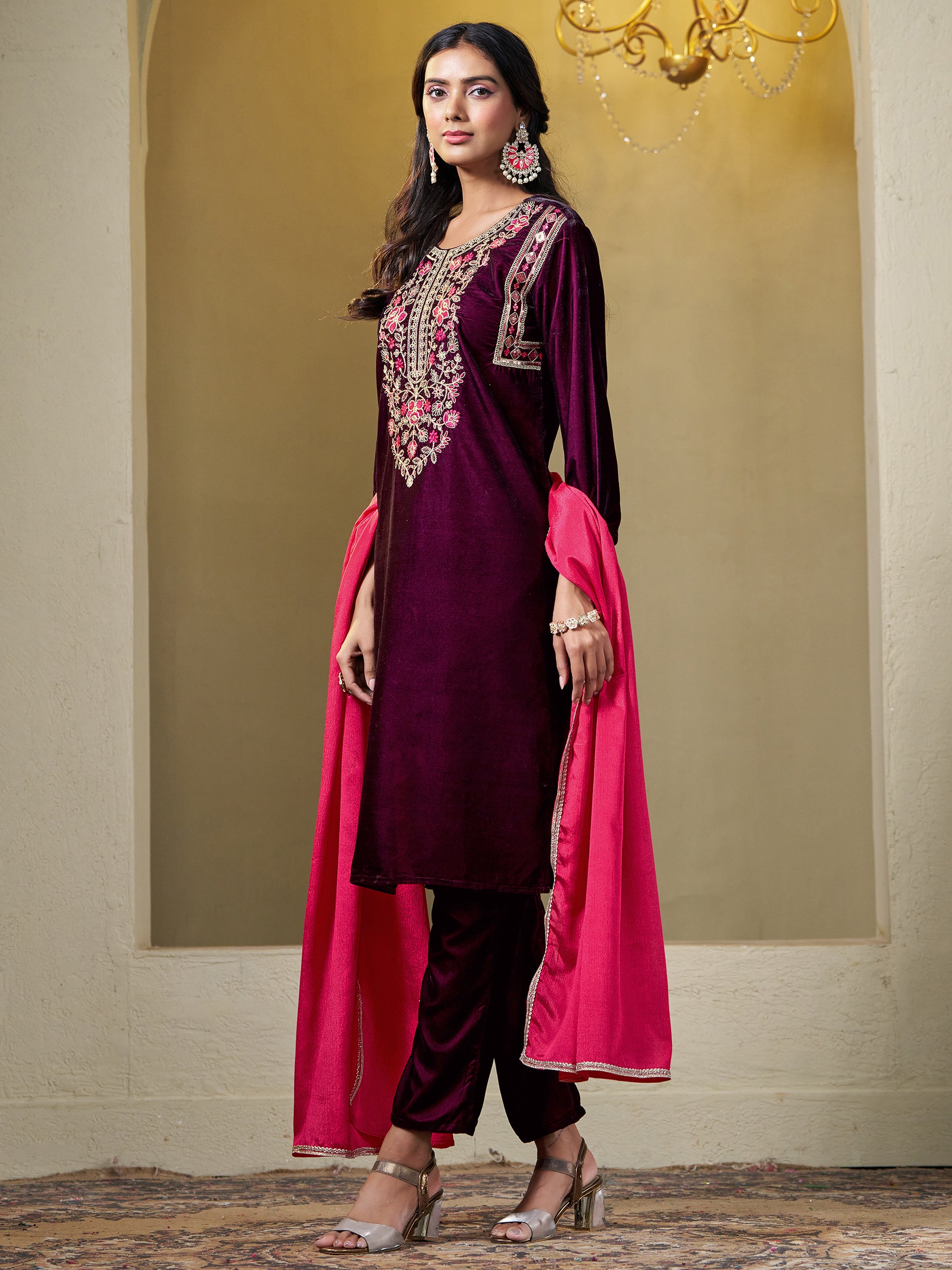 Wine Velvet Yoke Embroidery Straight Kurta Pant With Dupatta Set