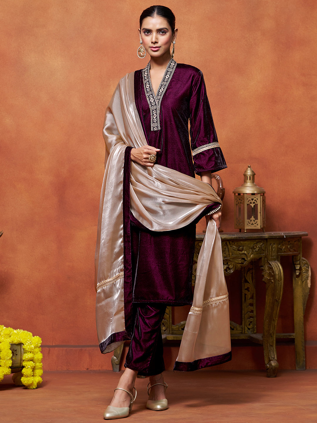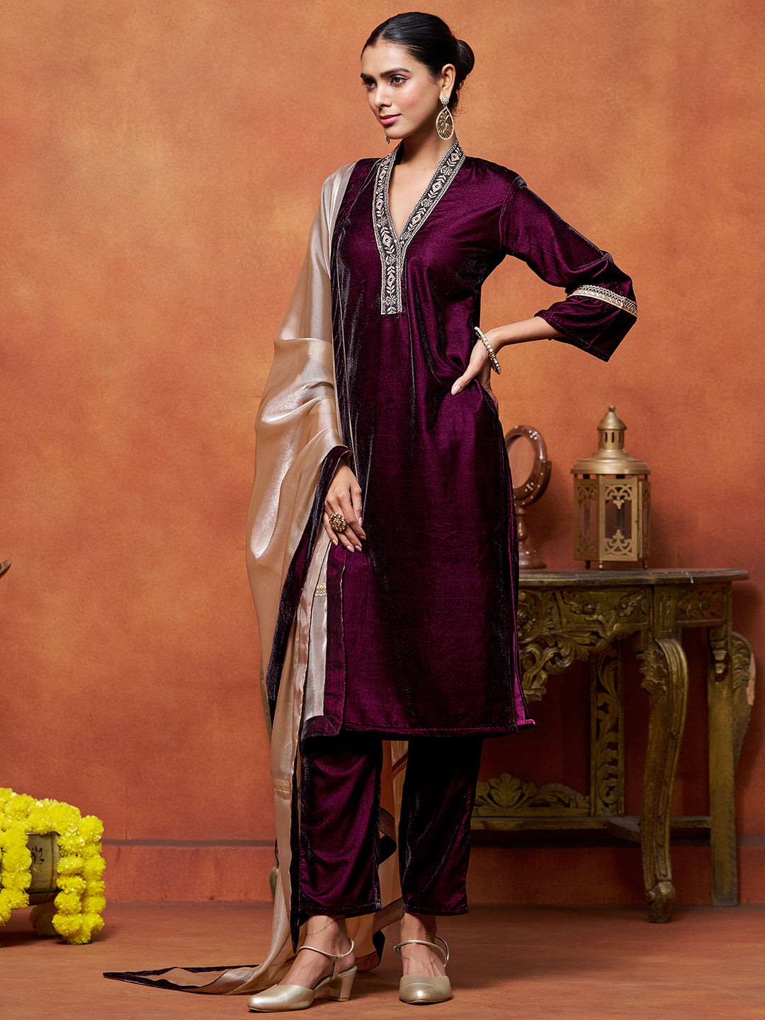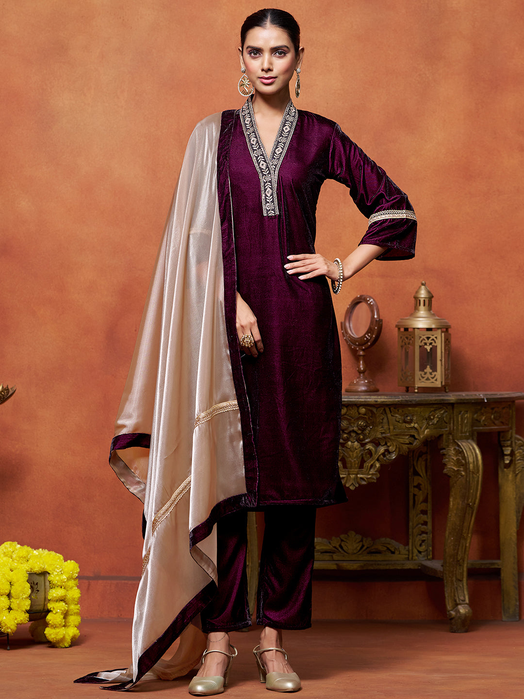 Wine Velvet Embroidered Straight Kurta Pant With Dupatta Set
