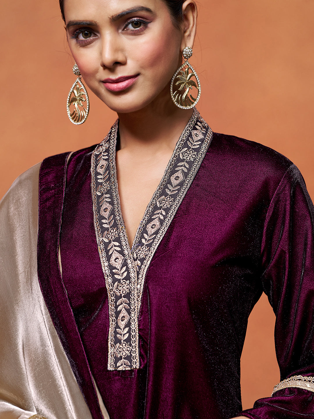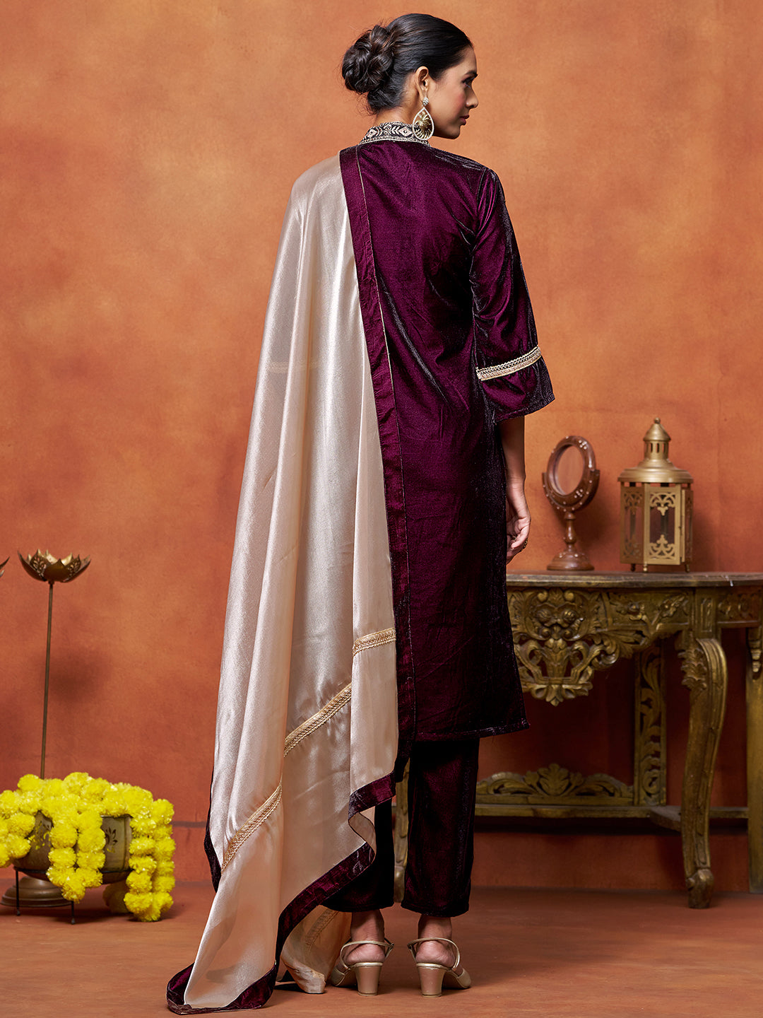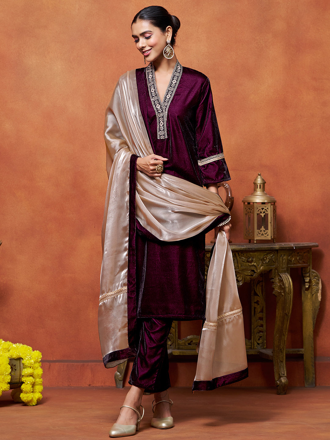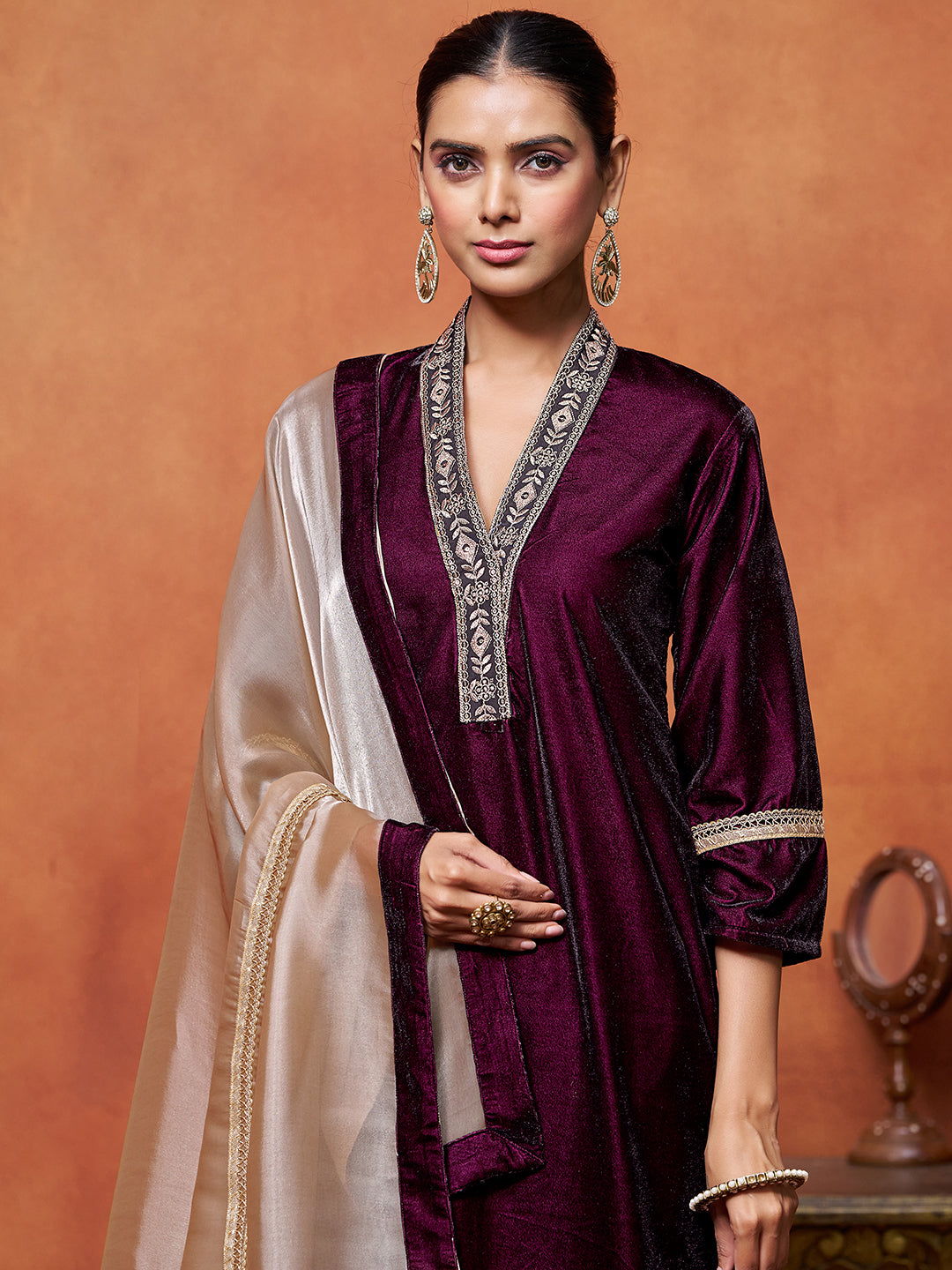 Wine Velvet Embroidered Straight Kurta Pant With Dupatta Set