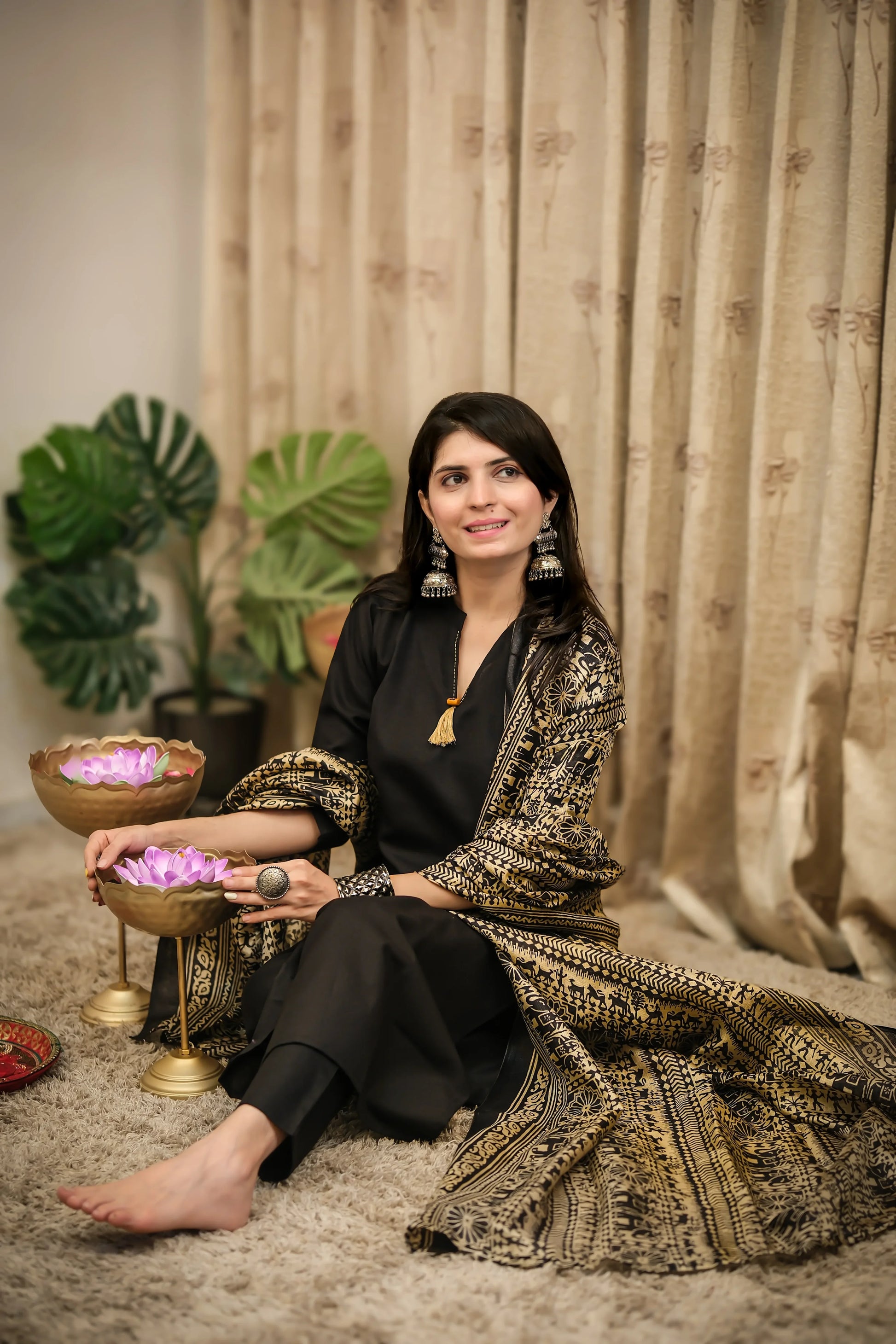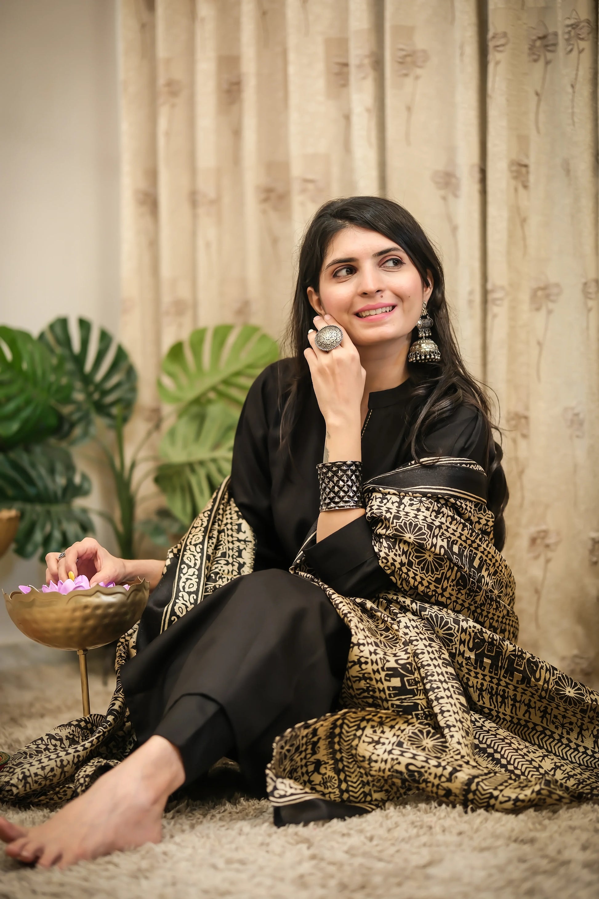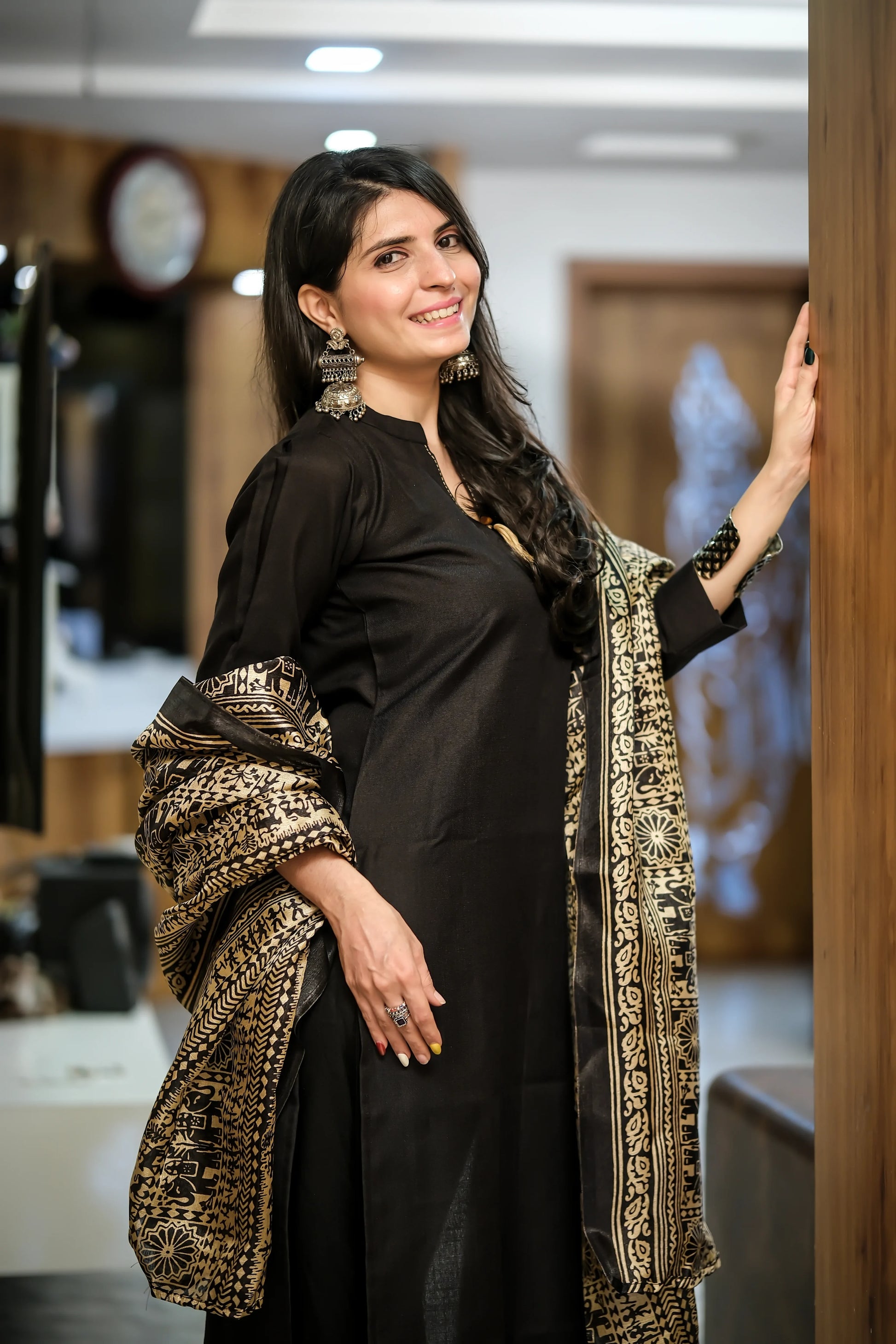 Black Cotton Blend Solid straight Kurta Pant with Digital Print Dupatta Set