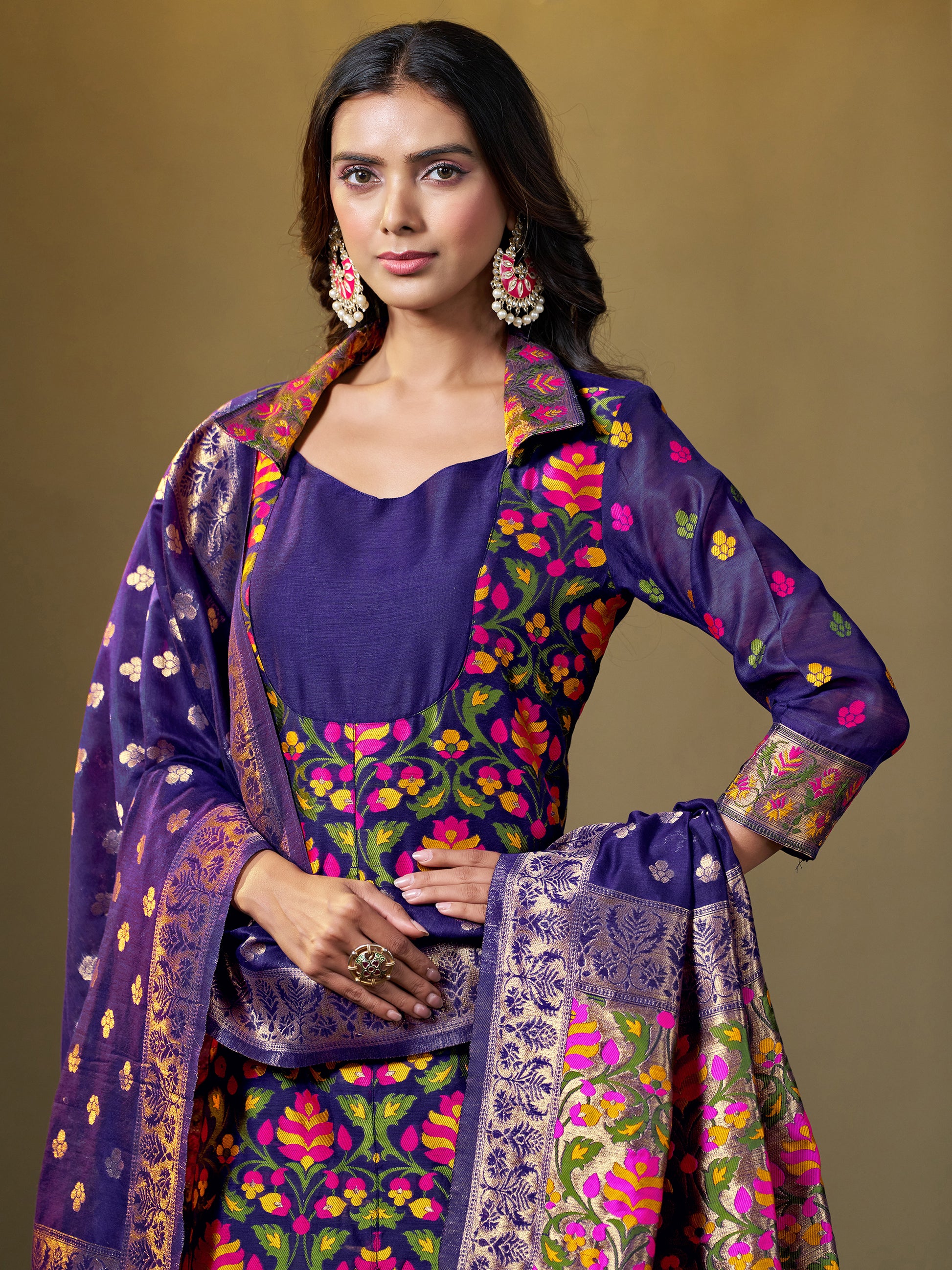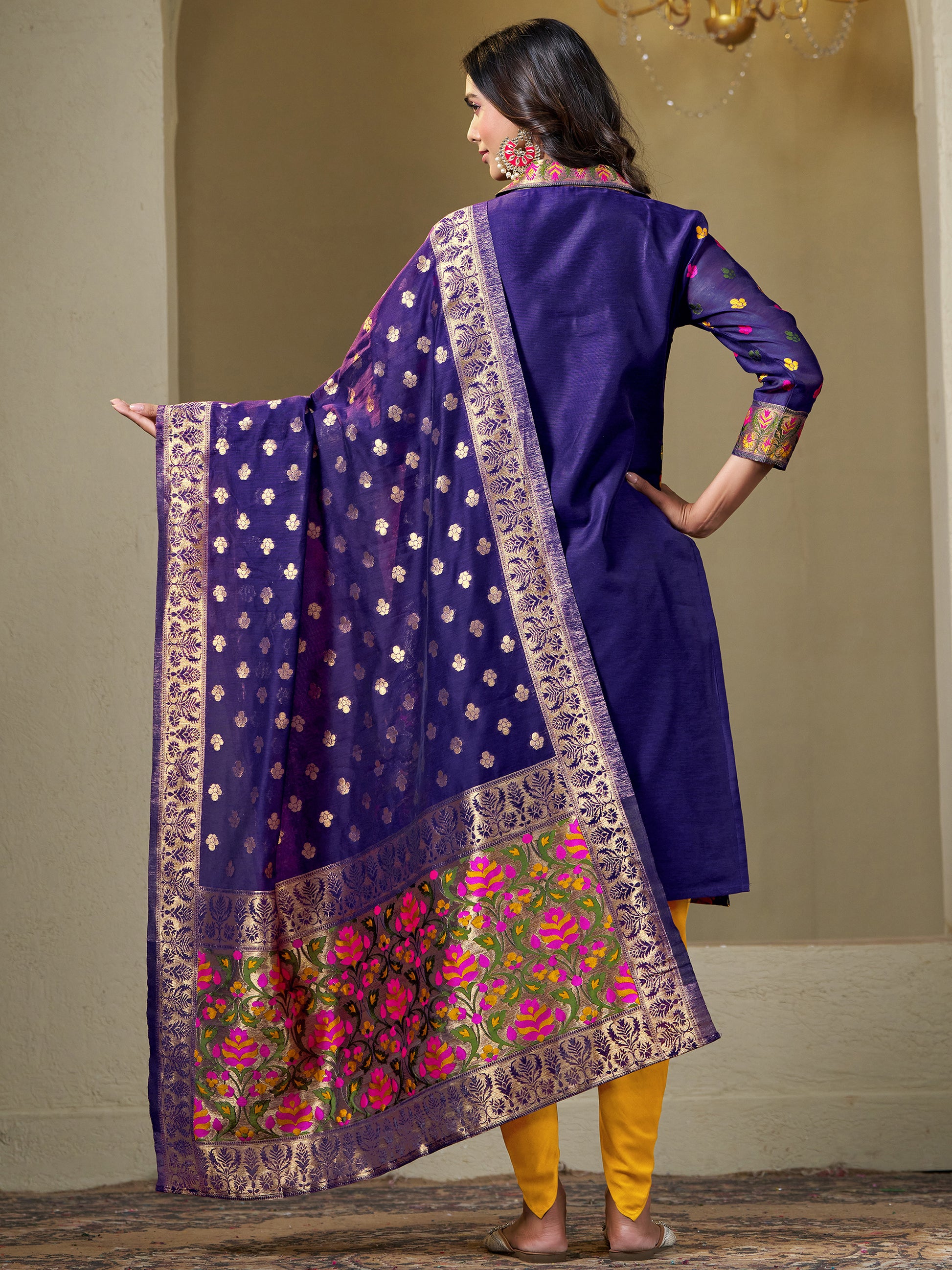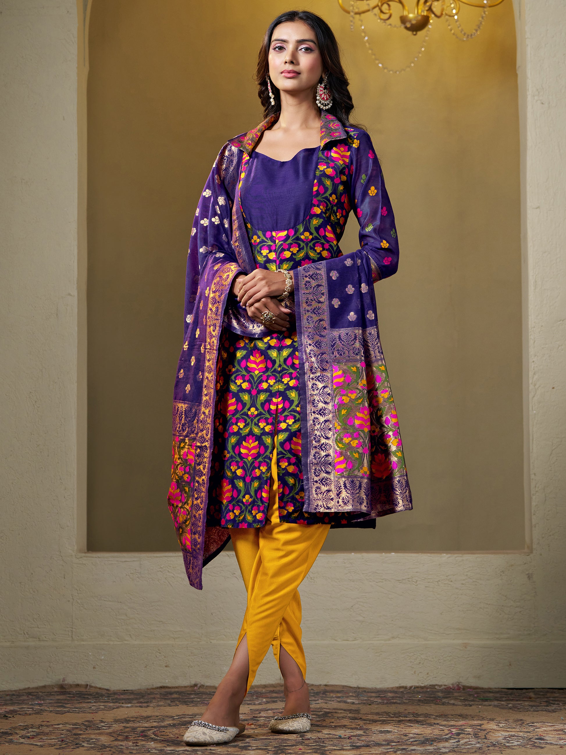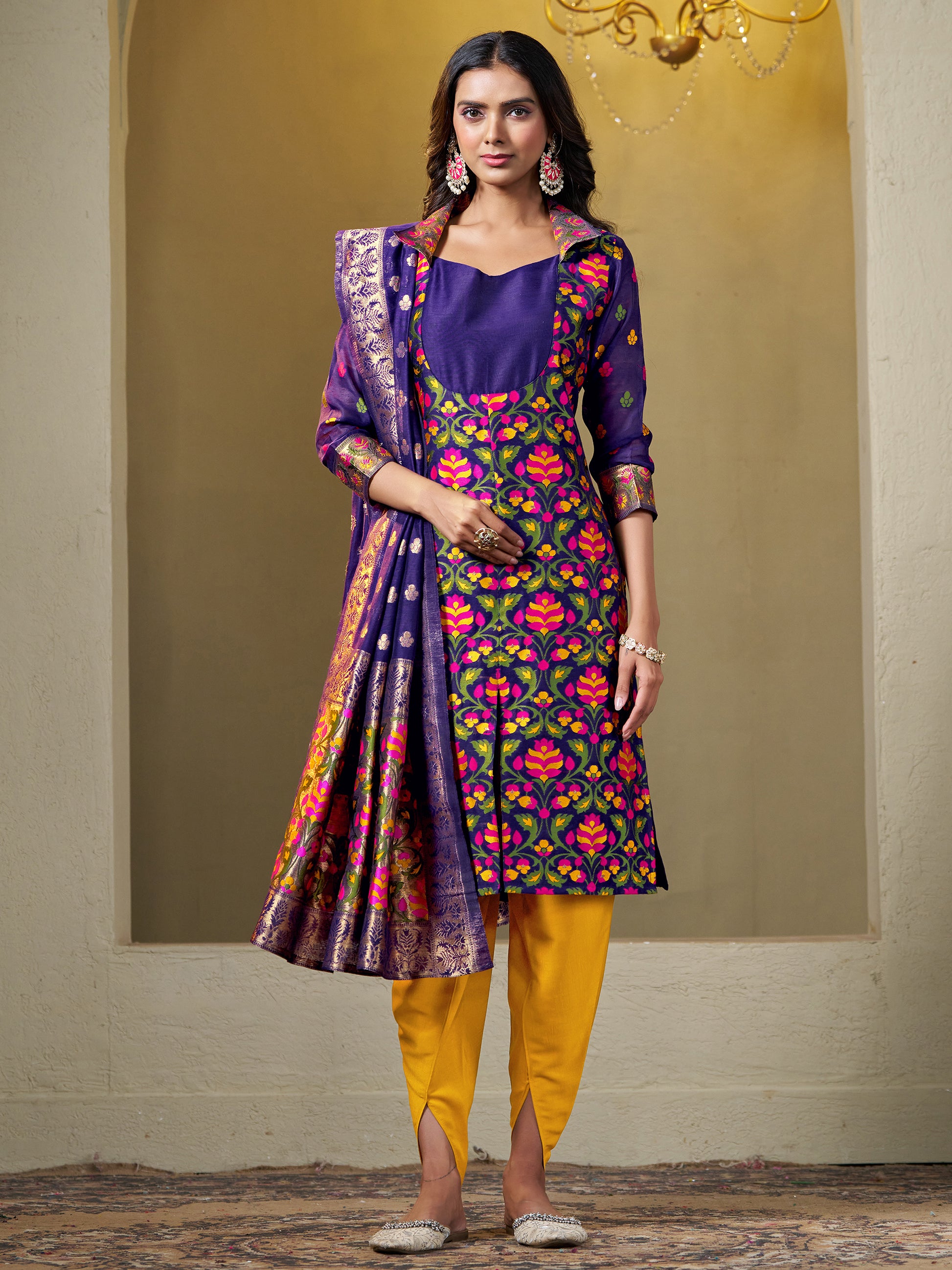 Cotton Blend Brocade Straight Kurta Dhoti With Dupatta Set