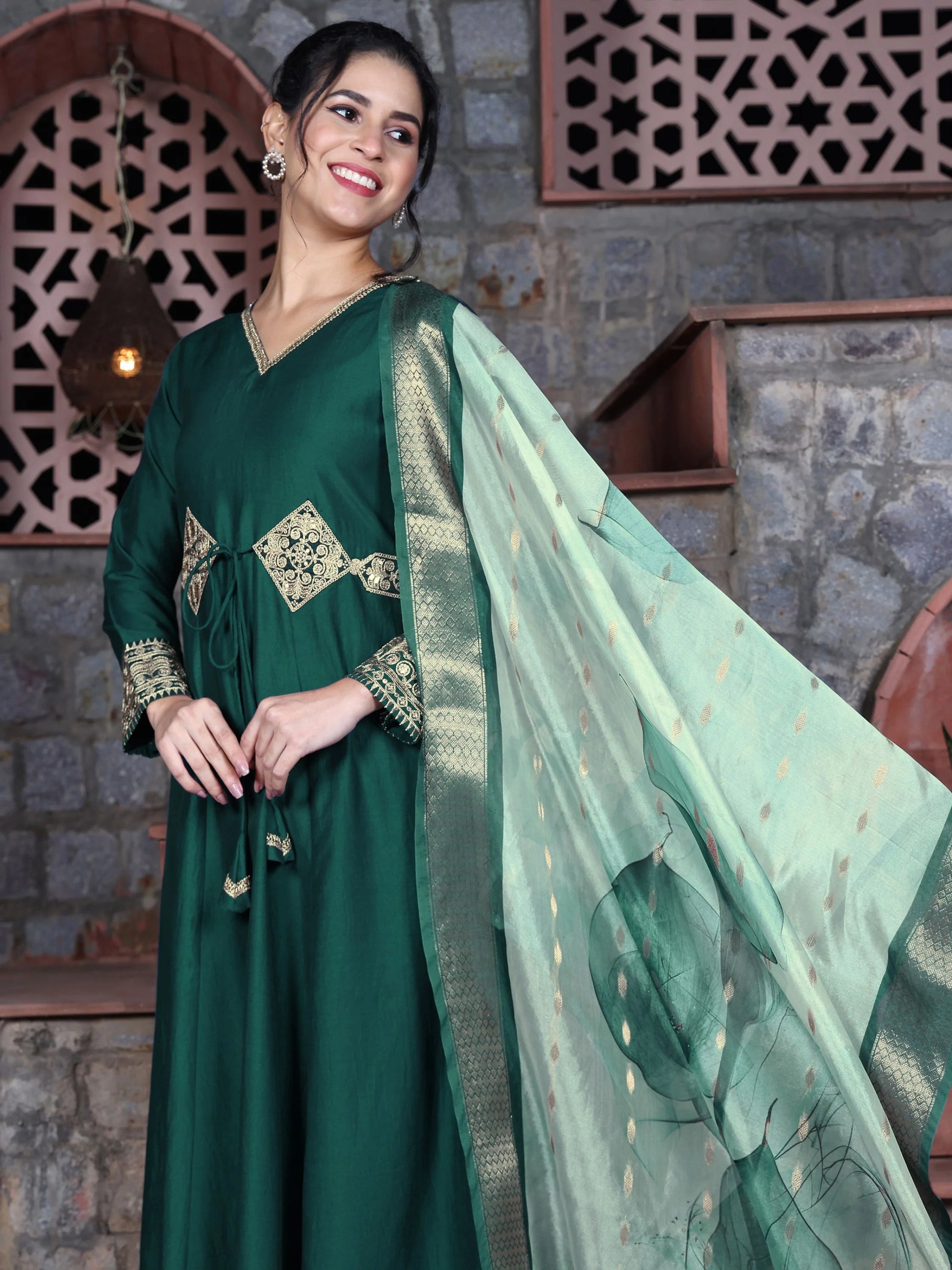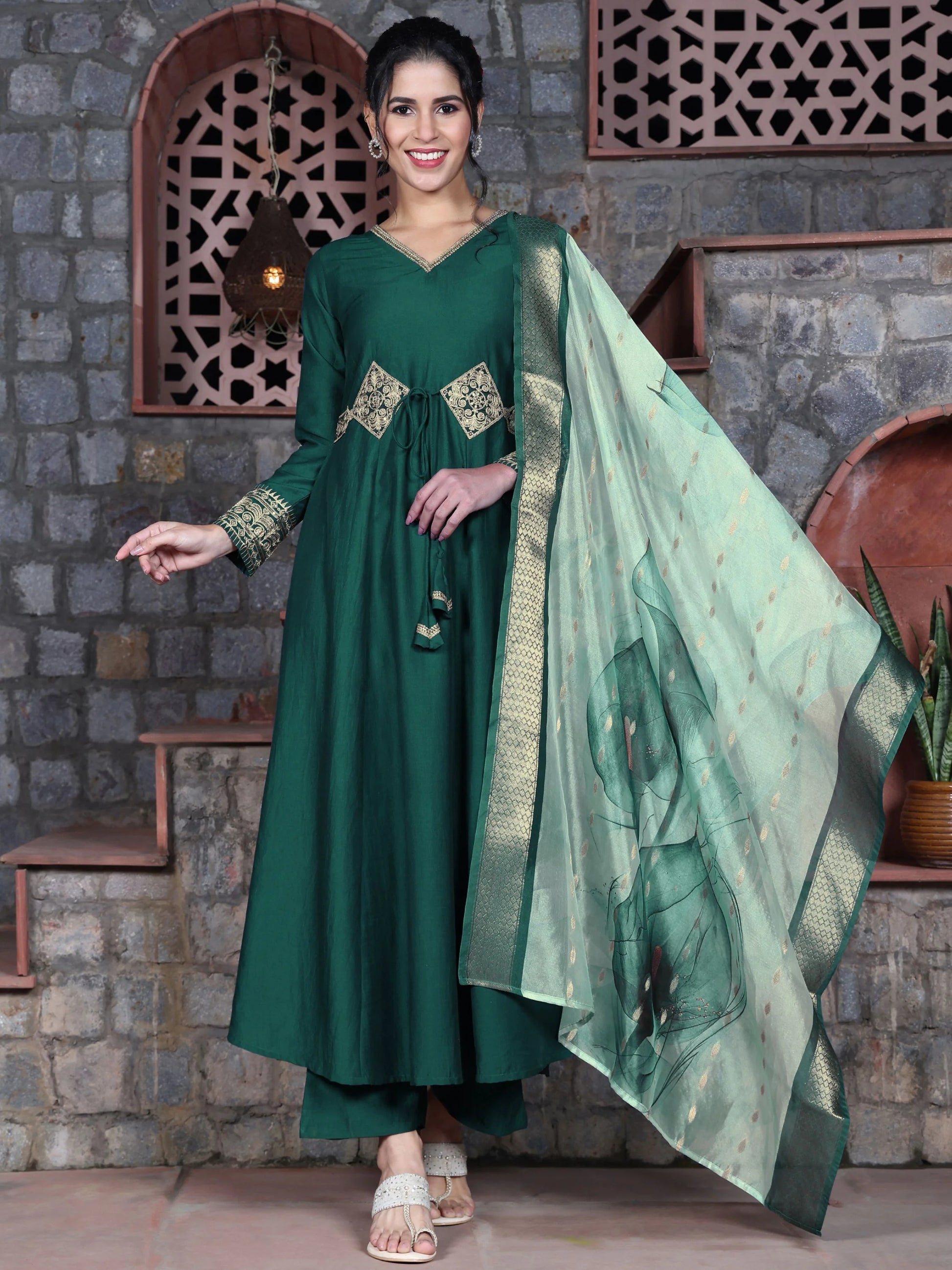 Cotton Silk Green Embroidered Anarkali Kurta Palazzo With Digital Print Dupatta Set