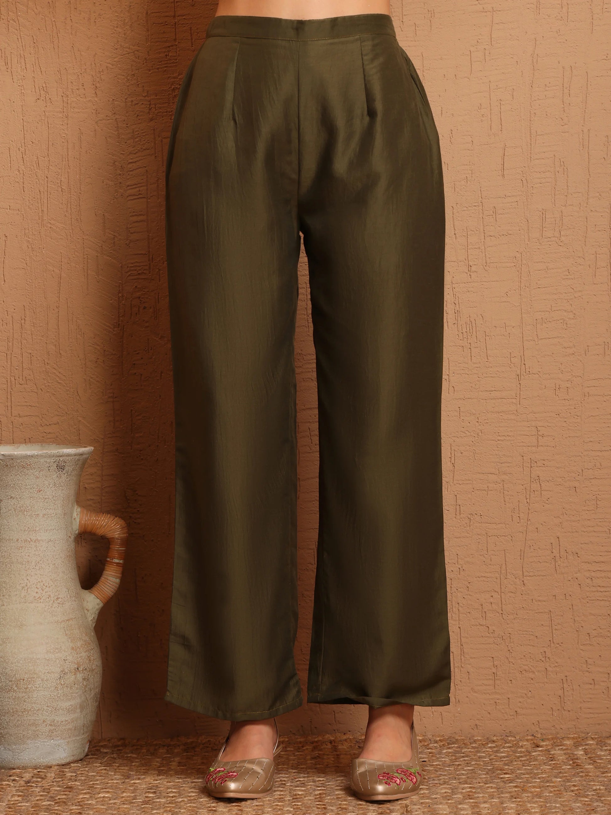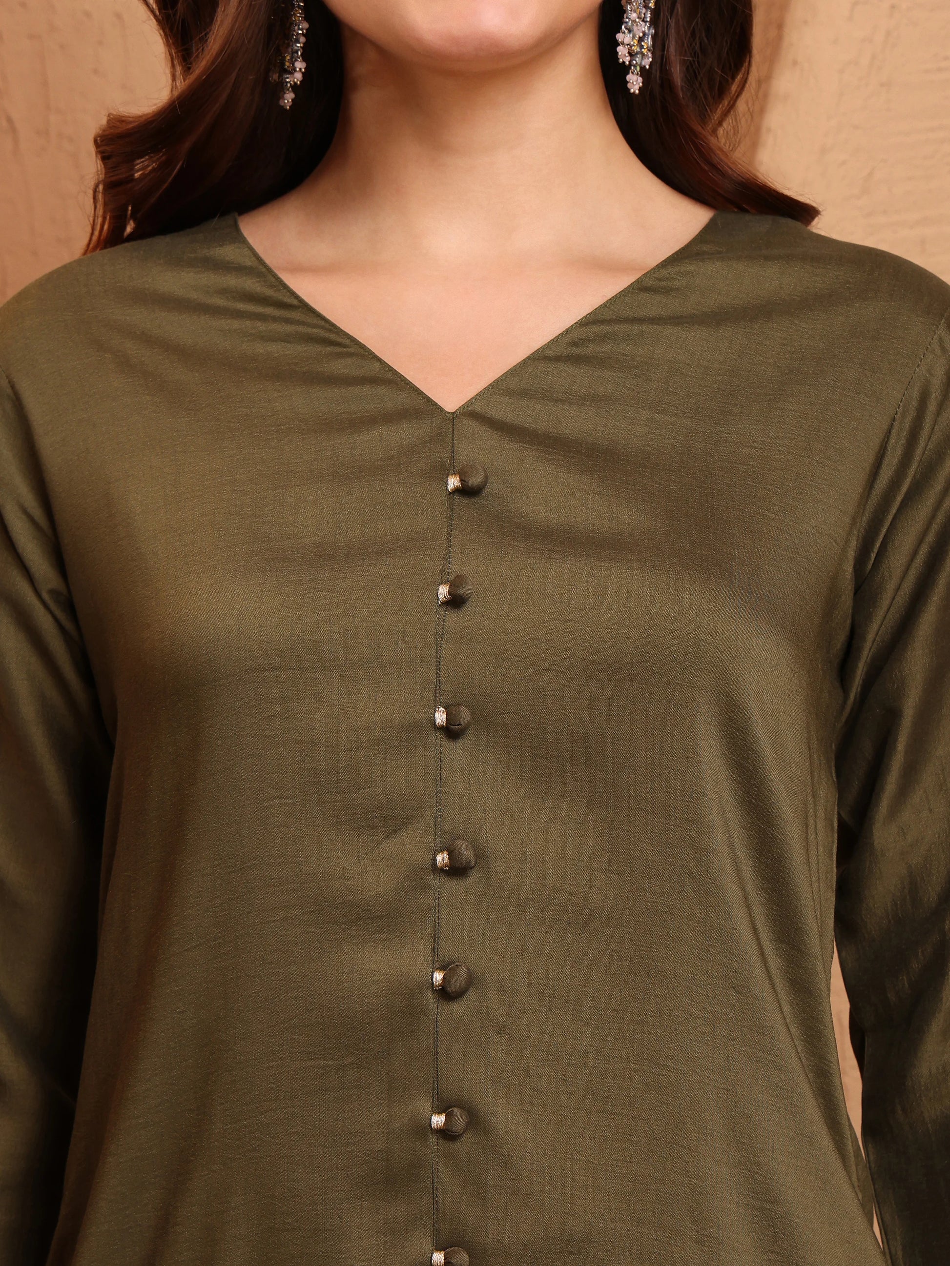 Cotton Silk Green Solid Hight Front Slit A-Line Kurta Palazzo With Organza Dupatta Set