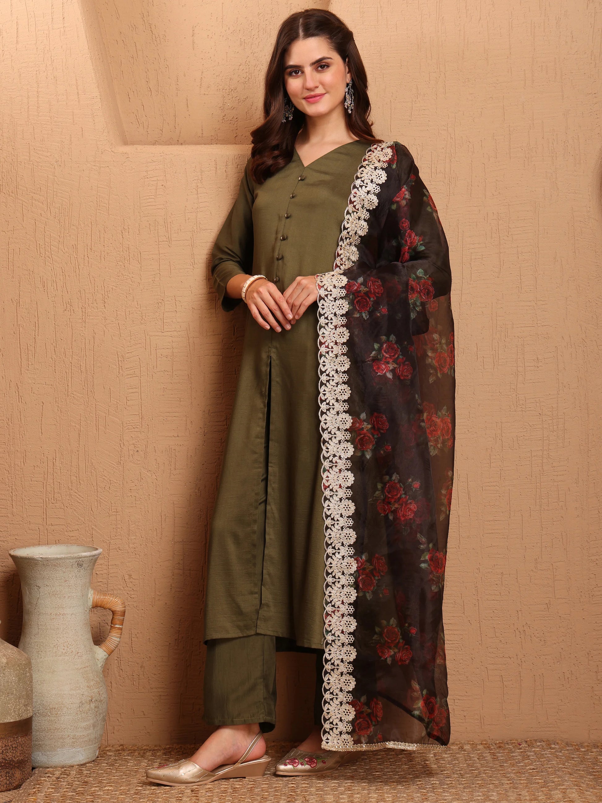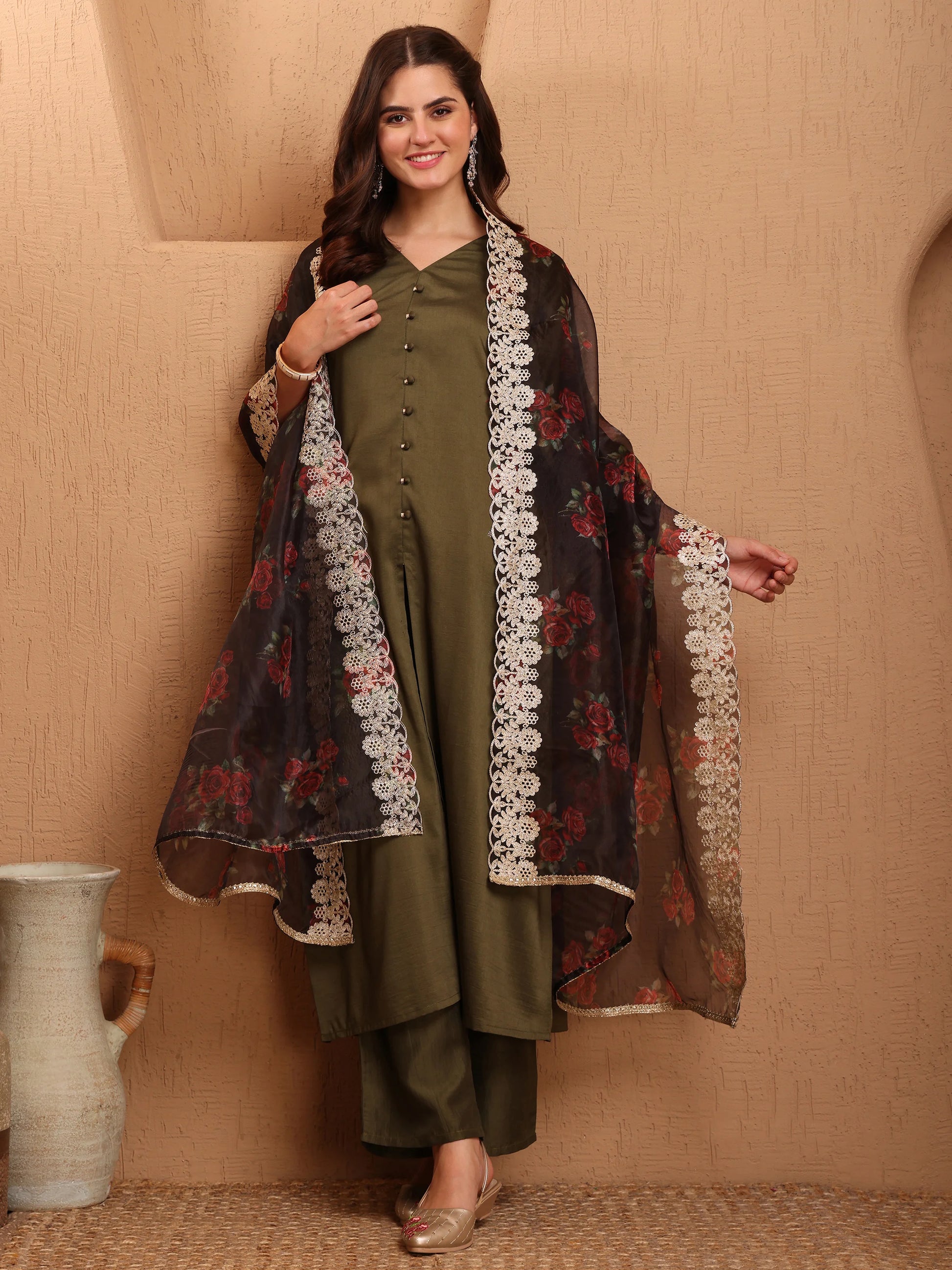 Refresh your wardrobe with this beautiful Mehendi Kurta Palazzo With Digital Print Dupatta Set featuring a Three-Quarter Sleeves Kurta with an front Slit and matching wide-leg Palazzo.The striking Digital Printing and Multicolor floral Design adds a bold touch with Dupatta, perfect for casual outings or semi-formal occasions. Made from lightweight fabric, this simple beautiful Kurta Set offers all-day comfort while keeping you stylish and trendy. Ideal for those who want a blend of modern ethnic fashion and comfort.