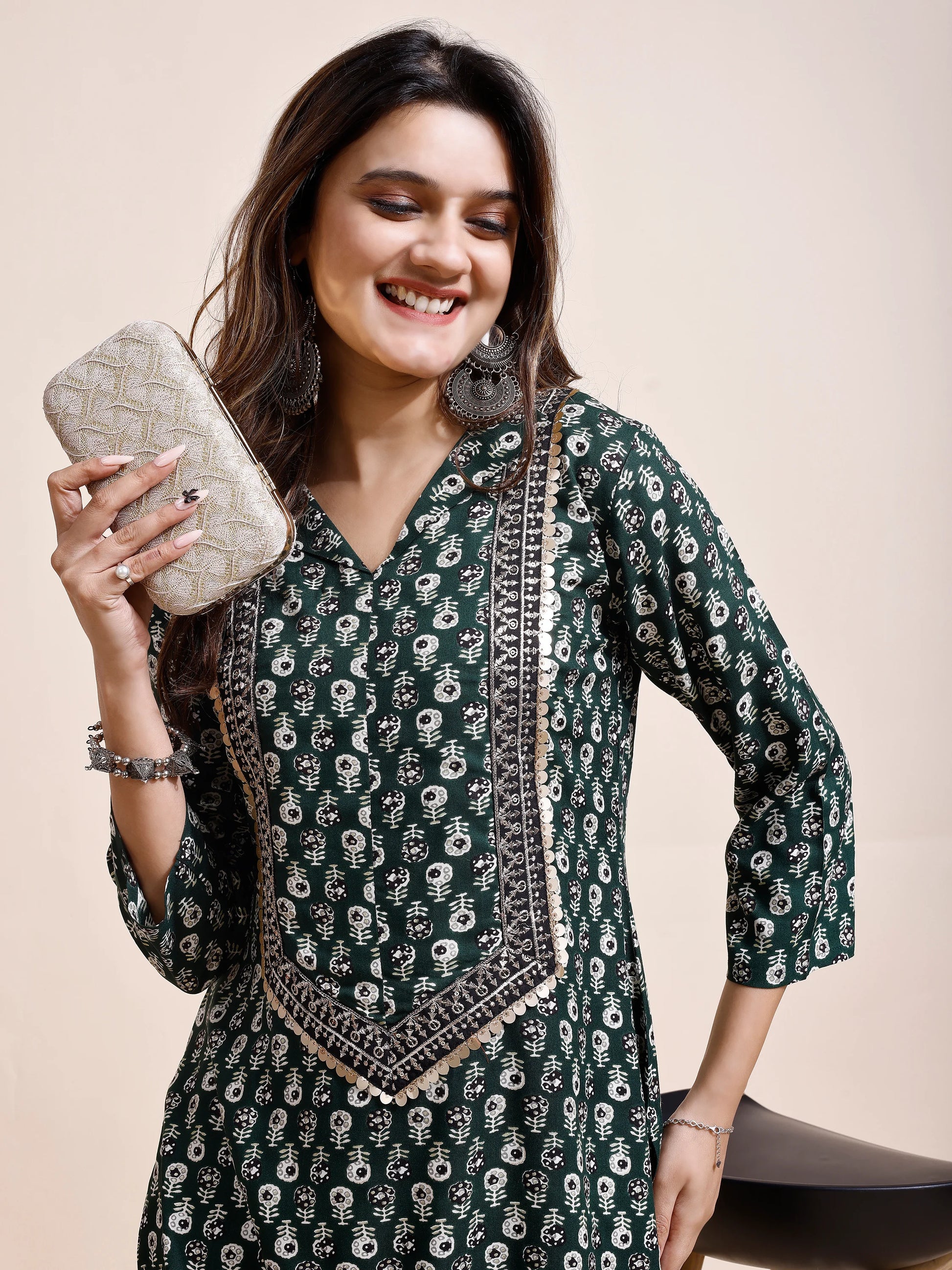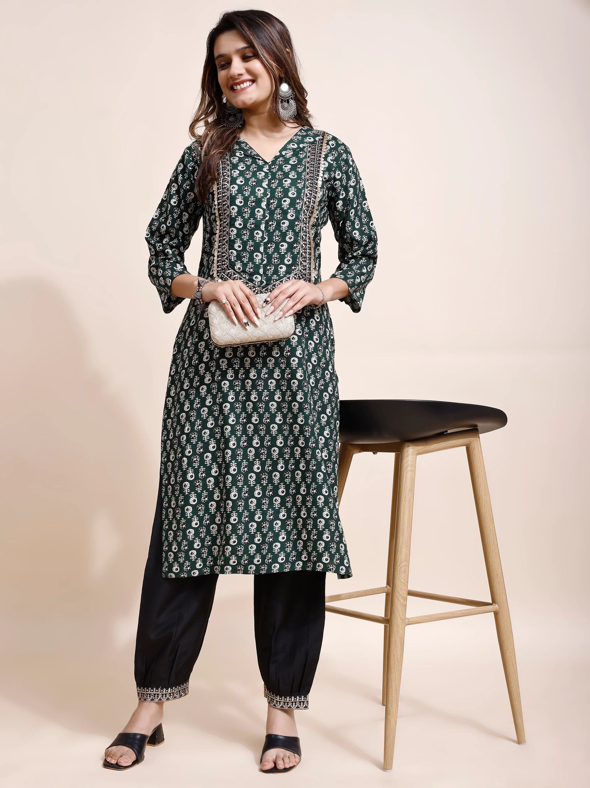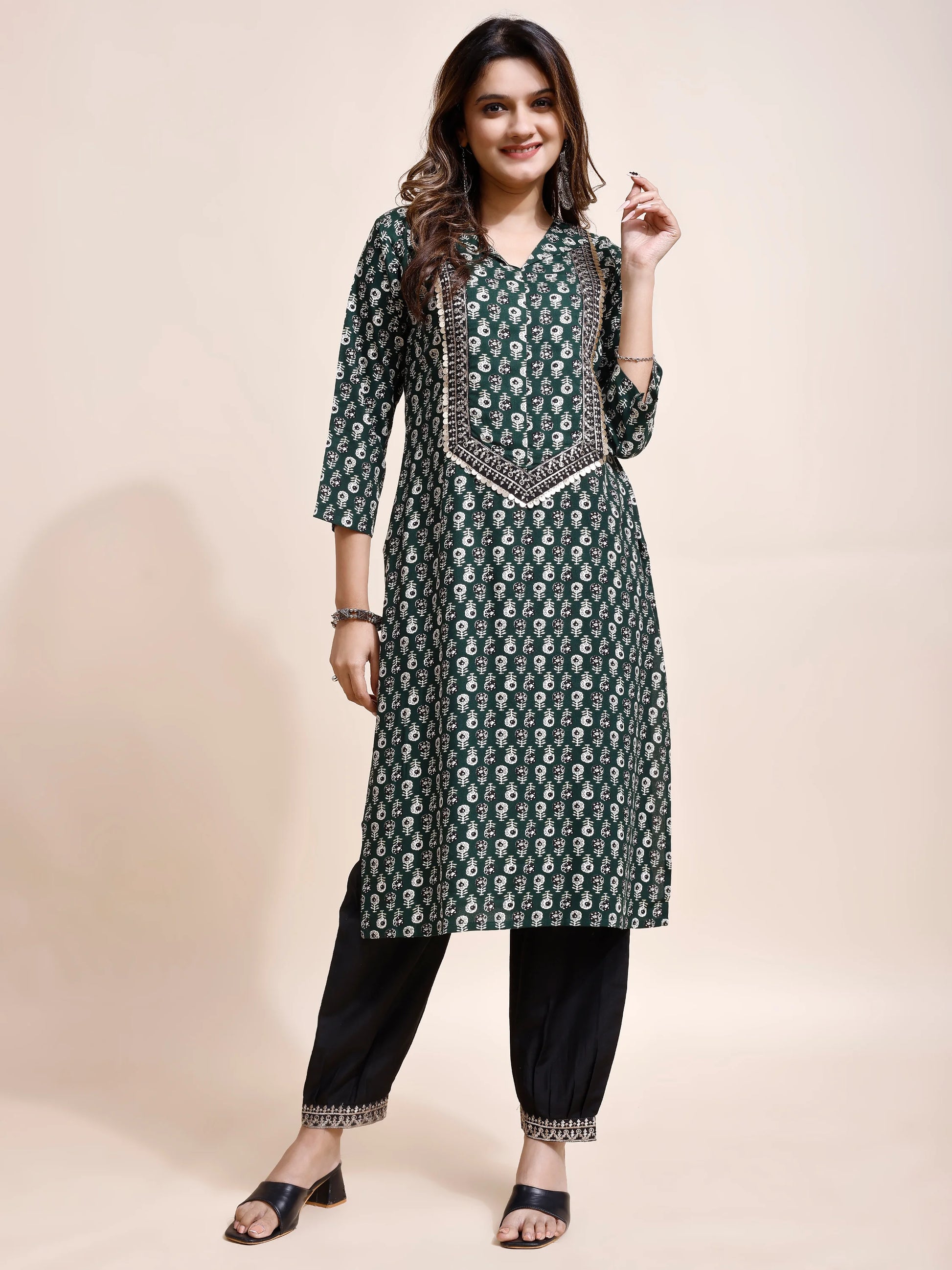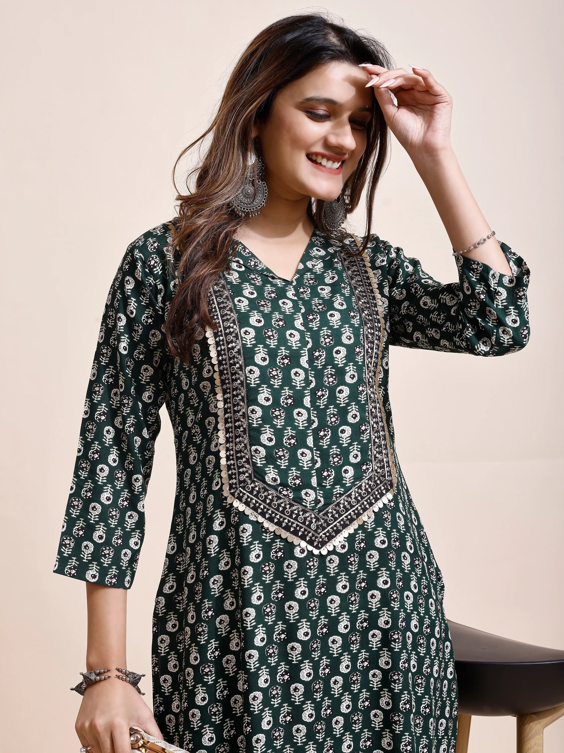 Elevate your style with this exquisite Bottle Green Kurti from Youthnic, crafted from soft and breathable Rayon fabric. Its V-neck design and intricate front panel embroidery add a touch of elegance, making it a perfect choice for parties and special occasions. The kurta features regular 3/4 sleeves, providing a comfortable and stylish fit. With its knee length, this kurta pairs beautifully with both White and black jeans, offering versatile styling options