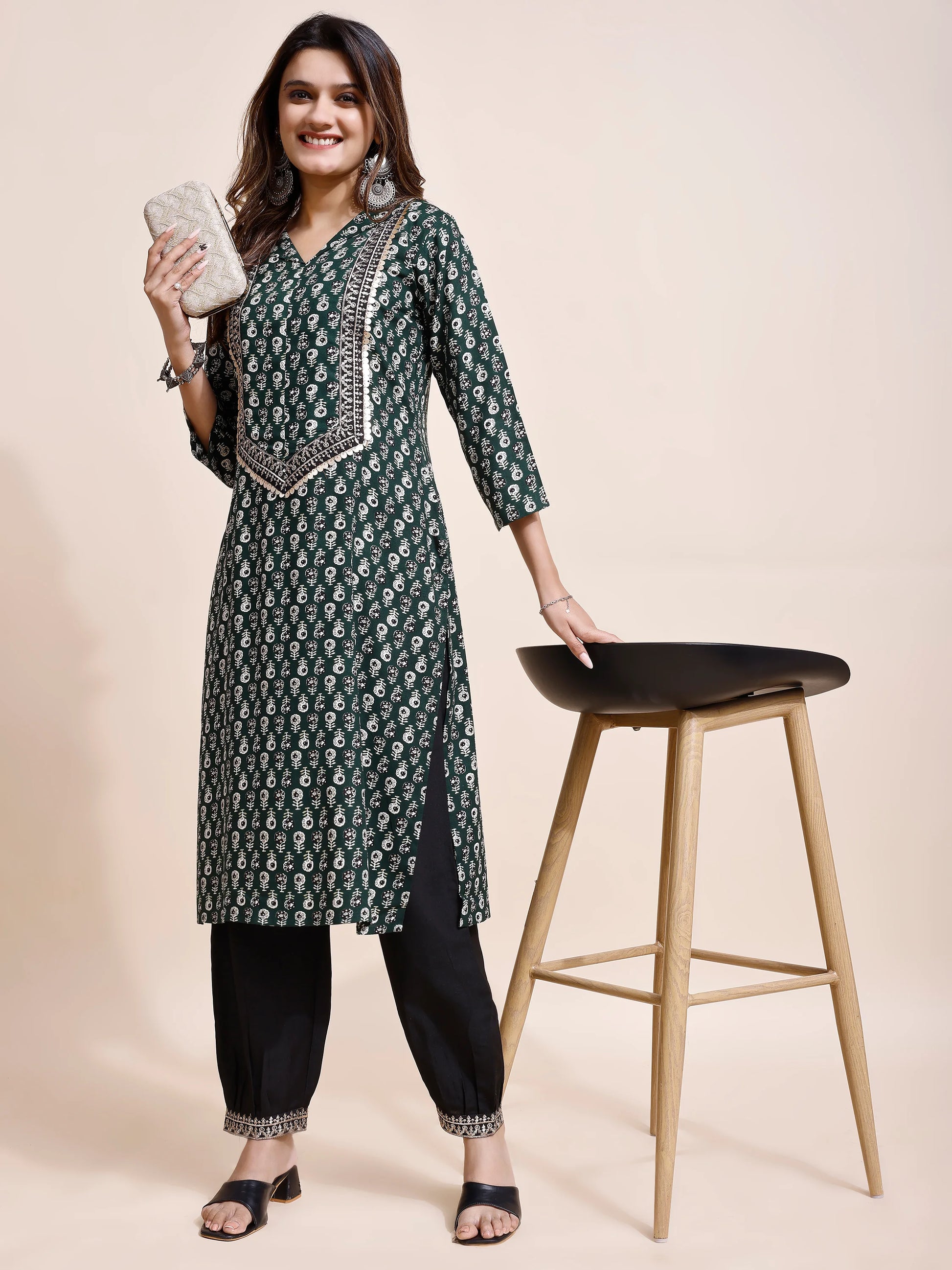 Green Rayon Yoke Embroidery and Printed Straight kurta