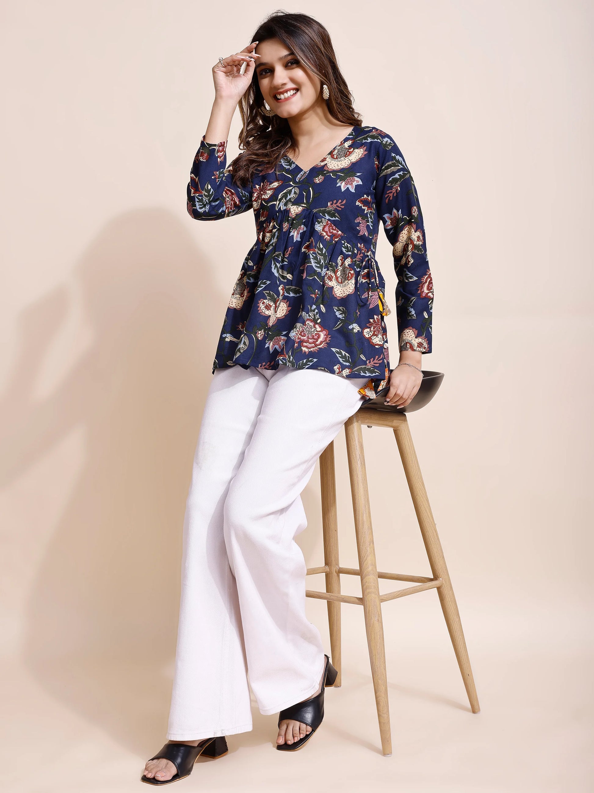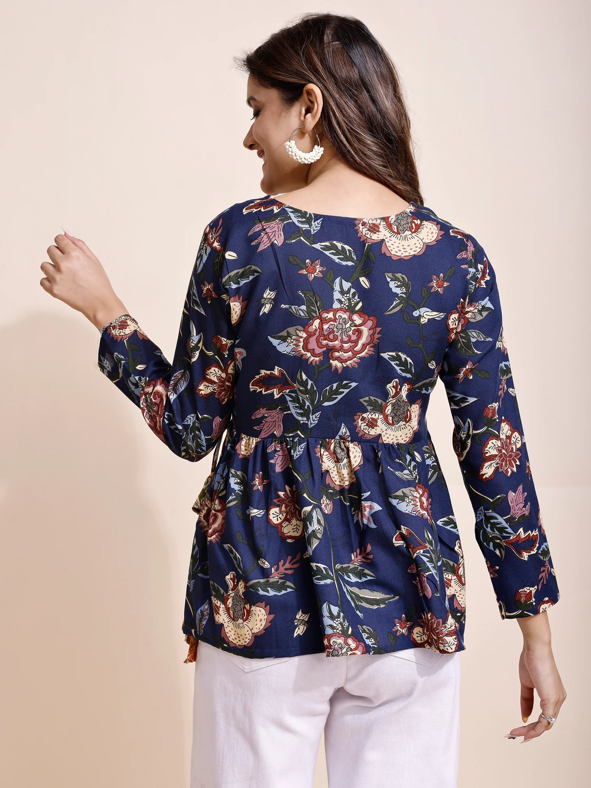Add a touch of elegance to your everyday style with this Navy Cotton Blend Floral Print Peplum Top. Featuring an Alia cut design with a flattering peplum flare, this top offers both comfort and sophistication. The beautiful floral print paired with tassel and kodi detailing enhances its ethnic charm while maintaining a modern silhouette.