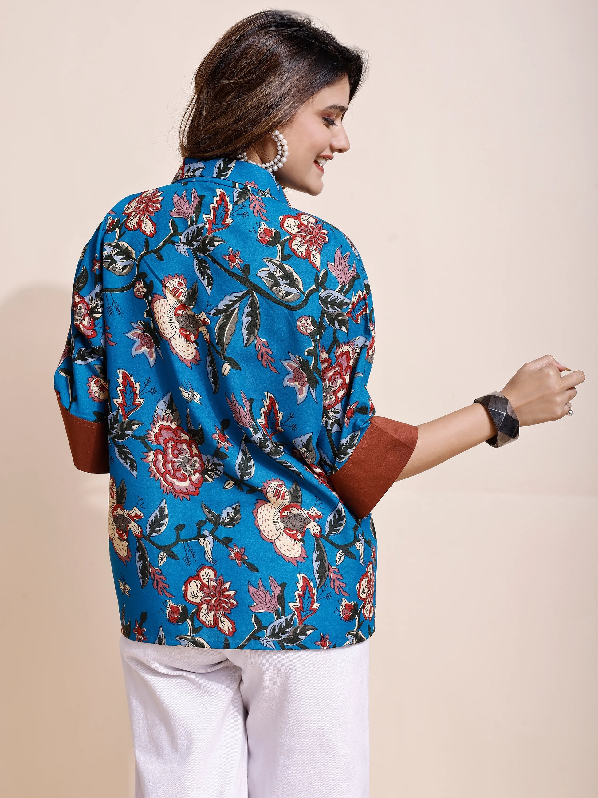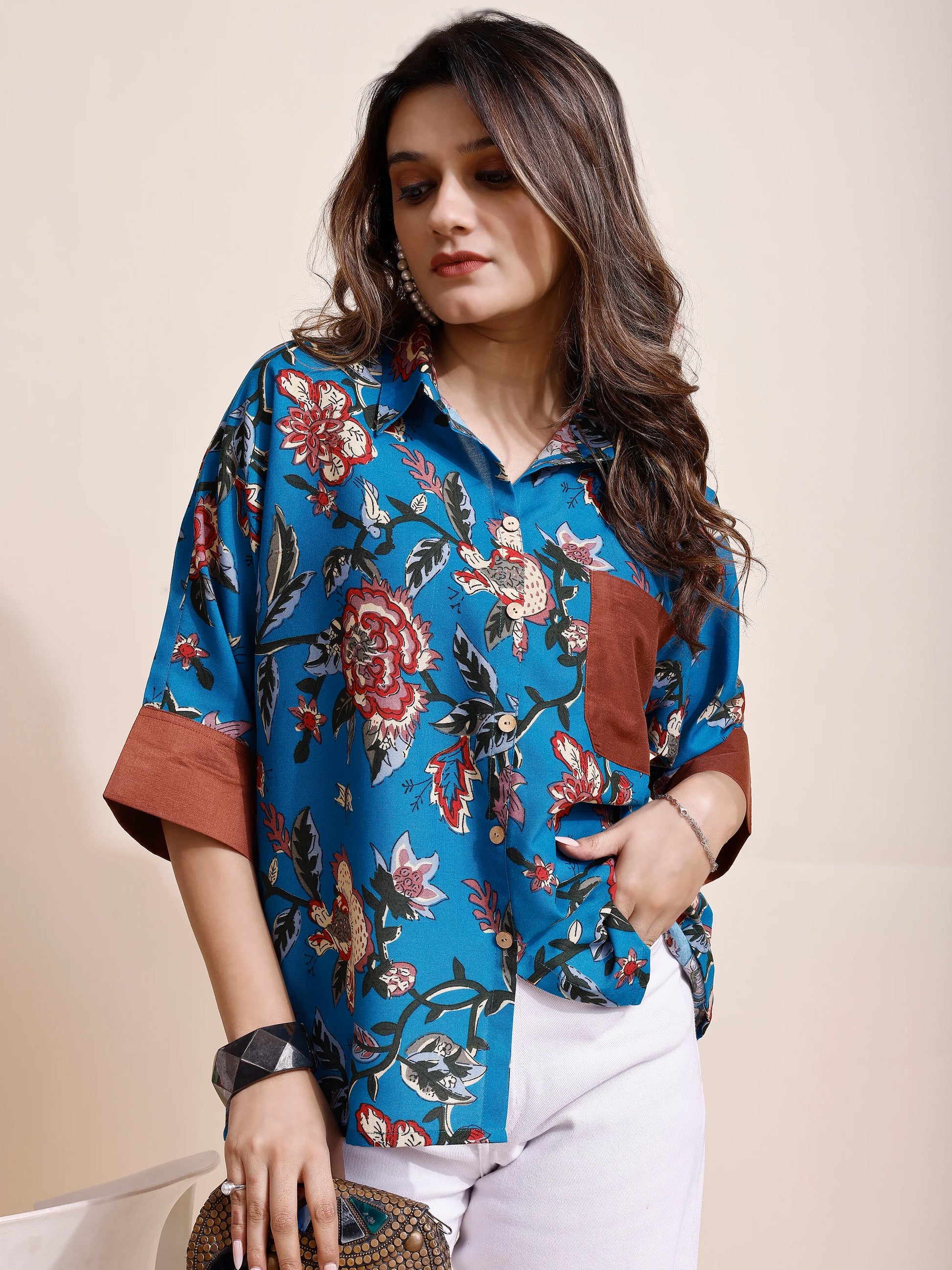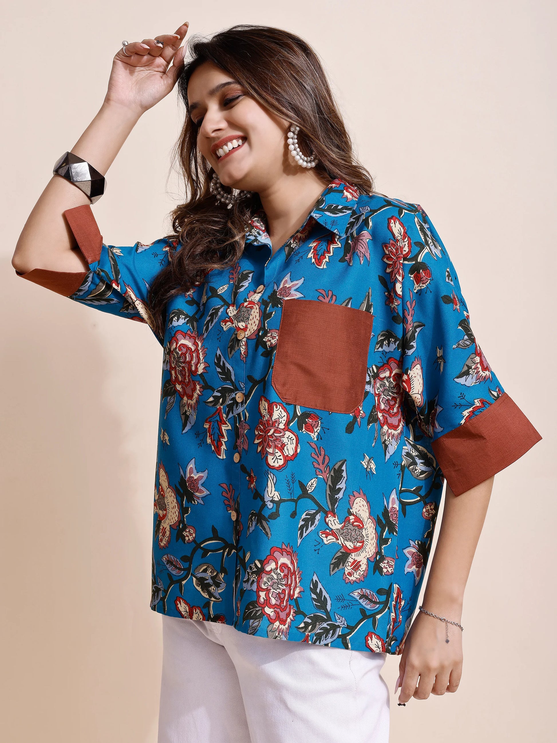 Rama Cotton Floral Print relex Fit Pocket Boxy Shirt Style Top