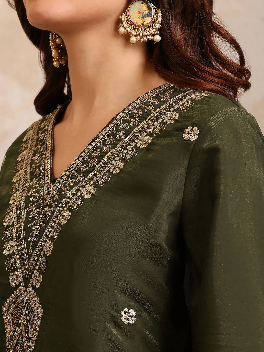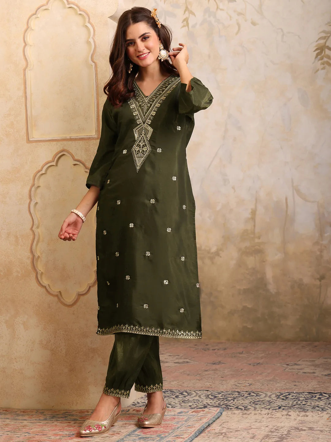 Step into elegance with the Silk Blend Embroidered Kurta Salwar With Dupatta Set, a perfect blend of sophistication and style. This fully stitched ready-to-wear ensemble features a gracefully Straight Kurta with a fancy V- Neck Embroidered design, Regular Sleeves. Paired with a beautifully statement jewellery and a pair of juttis, this outfit is ideal for weddings, festive occasions, and cultural gatherings.