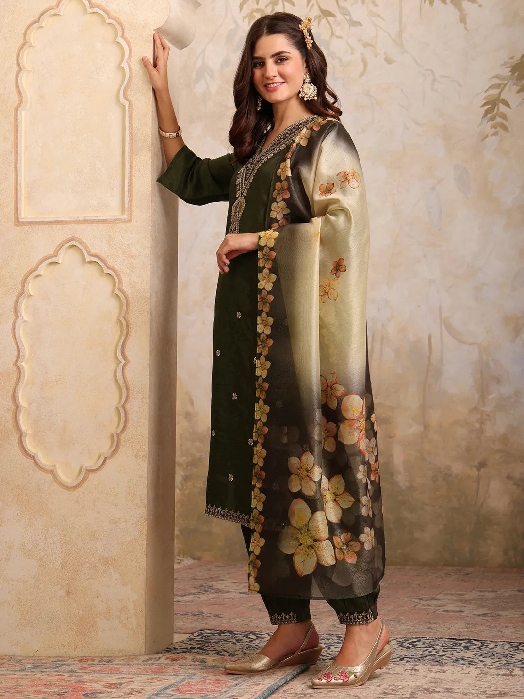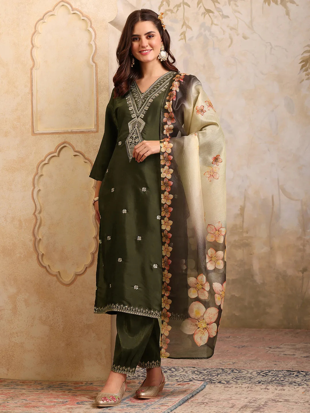 Youthnic Women's Silk Blend Embroidered Straight Kurta Salwar With Floral Print Dupatta (Green)